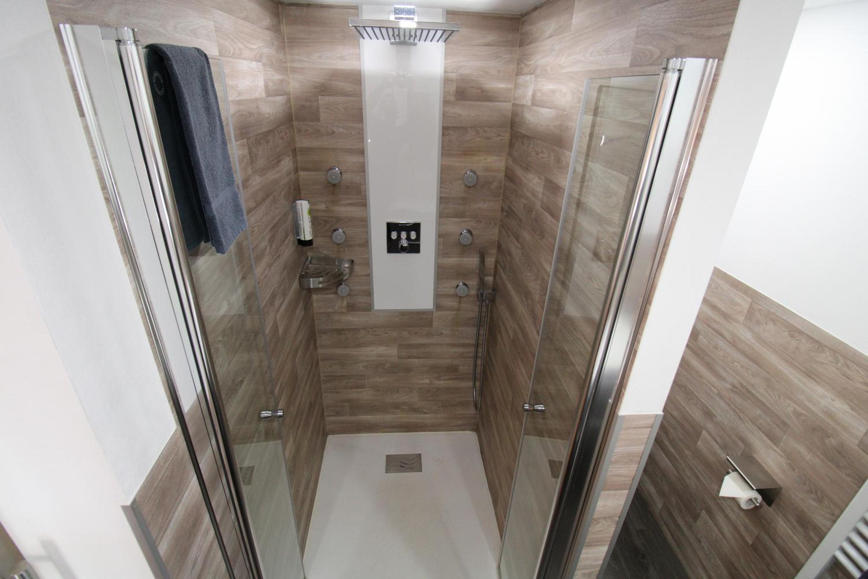 Bettdecke zu kurz, das geht eigentlich nicht. Dusche überambitioniert, mit 6 Wand-Düsen und 2 Duschköpfen sowie drei Drehknöpfen zur Bedienung. So richtig gut hat das Zusammenspiel der vielen Elemente nicht geklappt. Ich schätze: EIN satter Strahl aus einem gut funktionierendem Duschkopf mit beweglichem Schlauch und - vielleicht - mit variabler Einstellung und EINE leicht ablesbare, gut bedienbare und funktionierende Mischbatterie würde 99 % aller Gäste glücklich machen. - Nachts war leider bis in die frühen Morgenstunden das Bassgewummer einer Party, die offenbar im Keller stattfand, nicht ganz zu überhören. Im Bad wars anfangs kalt, wir fanden erst am Morgen das elektronische Bedienelement, um die Temperatur hochzufahren.