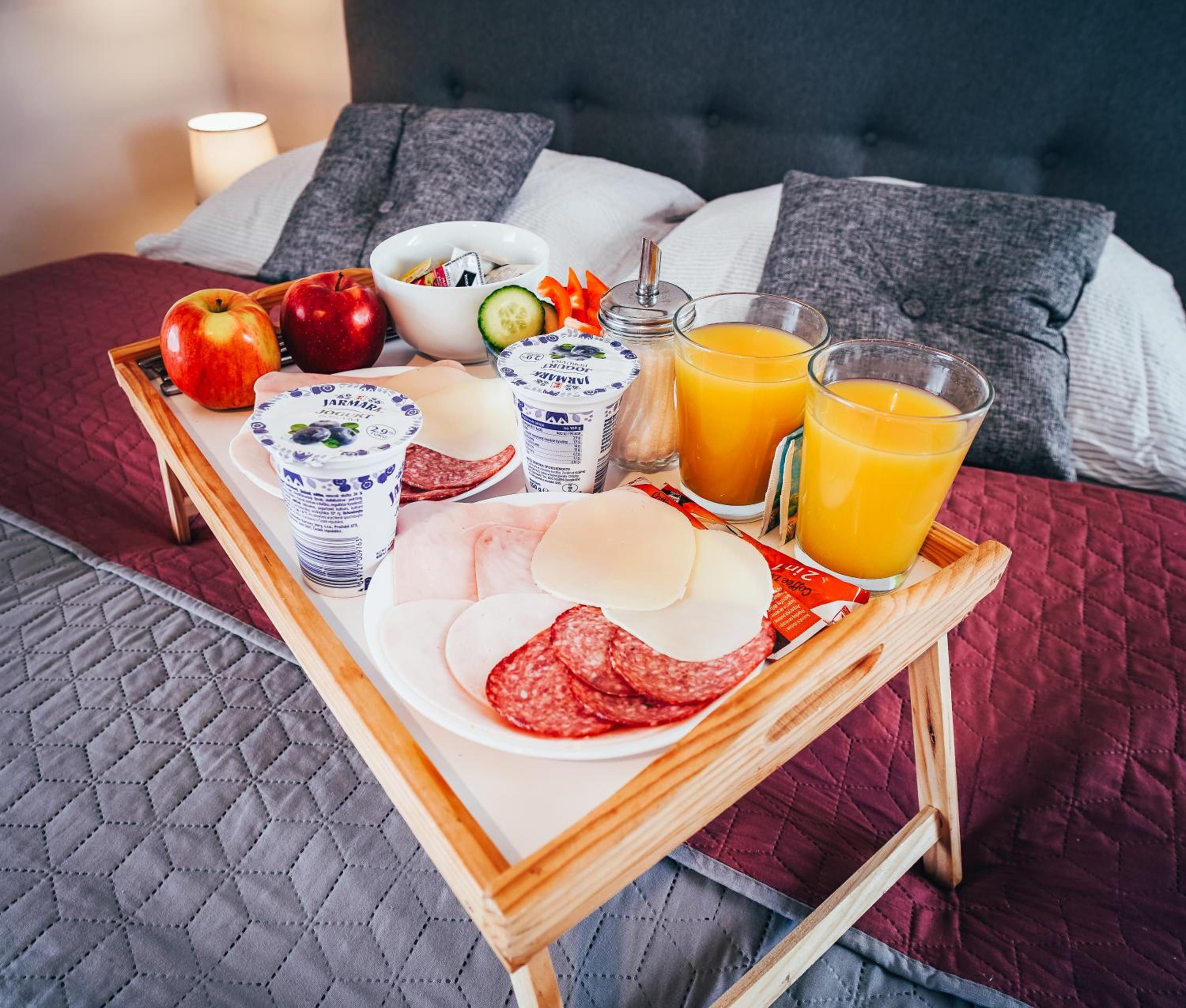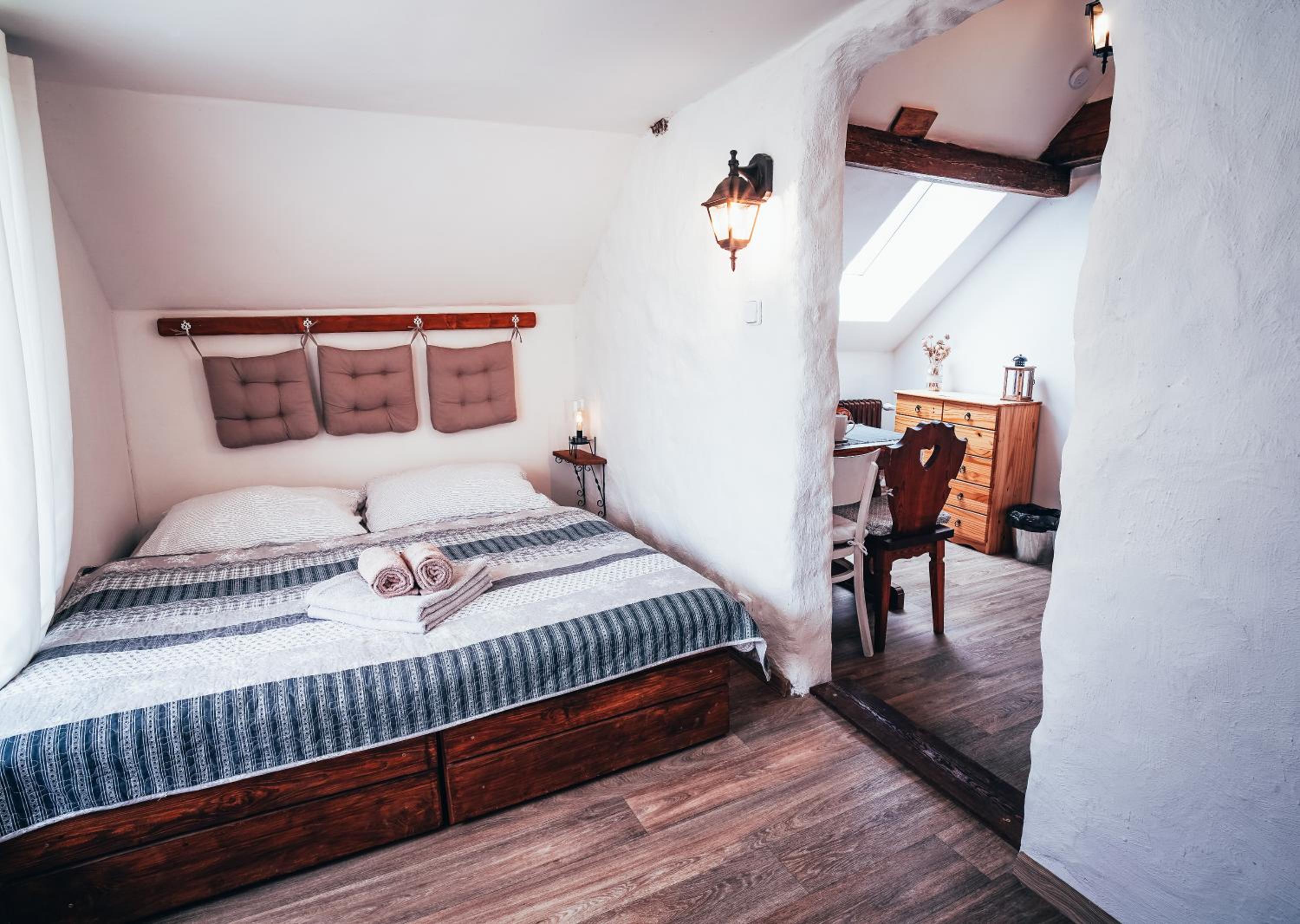 Ubytování je označené jako „Apartmán Deluxe“, ale ve skutečnosti jde o velmi malý prostor, spíš studio – vše je v jedné místnosti včetně koupelny. Jediný zdroj světla jsou dveře na balkon v rohu místnosti, což je i přes den nedostatečné. Balkonové dveře jsou navíc asi namontované obráceně a díky tomu zatékalo při troše sněhu dovnitř. Chápu snahu vše zorganizovat do malého prostoru, ale např. postel přilepená po celé délce na zeď z balvanů není úplně pohodlné řešení a ani žebříkové topení pár cm od záchodu. Navíc v místnosti nebyl žádný úložný prostor, pokud nepočítám pár háčků a ramínek na zdi.
