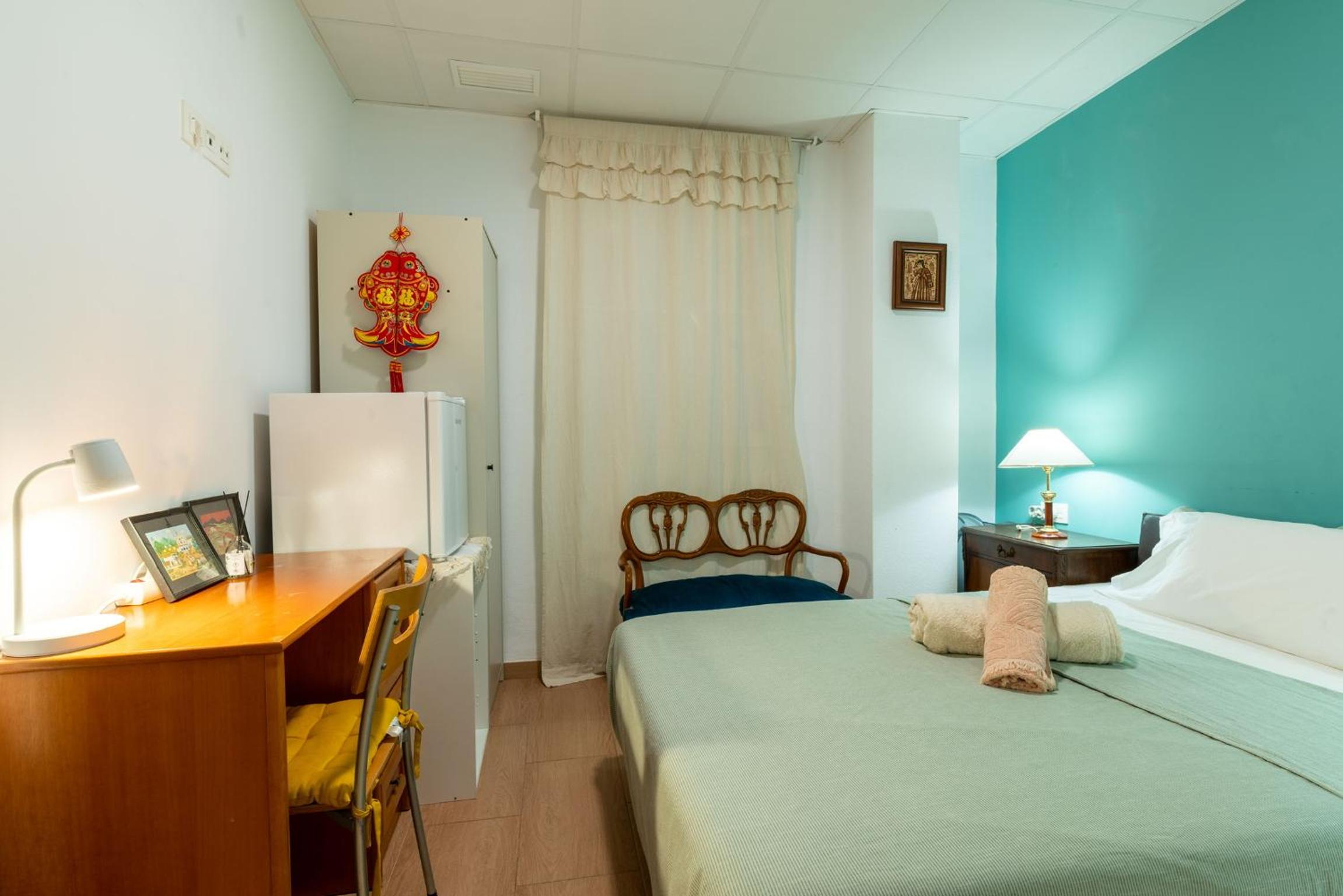 The room was of minimal dimensions, with a 40 cm wide wardrobe (practically a broom holder), and one (I mean ONE!) bedside table alone, for the "double" bed, 1.40 m wide. In fact, the photo on the room's website shows only one bedside table, only partially showing the wall of the headboard of the bed, but this too is a misleading and partial description: since when does a DOUBLE room have only one bedside table??? I had to put my personal effects on the floor...
