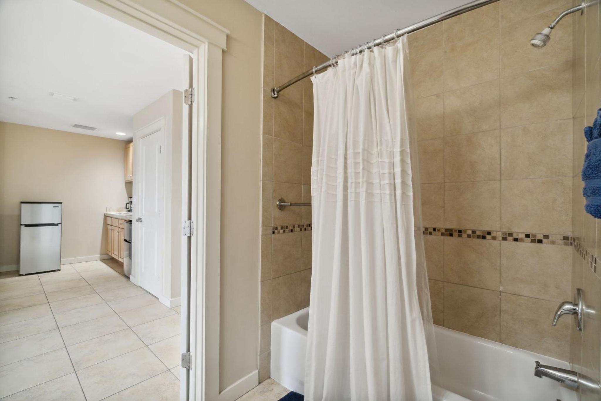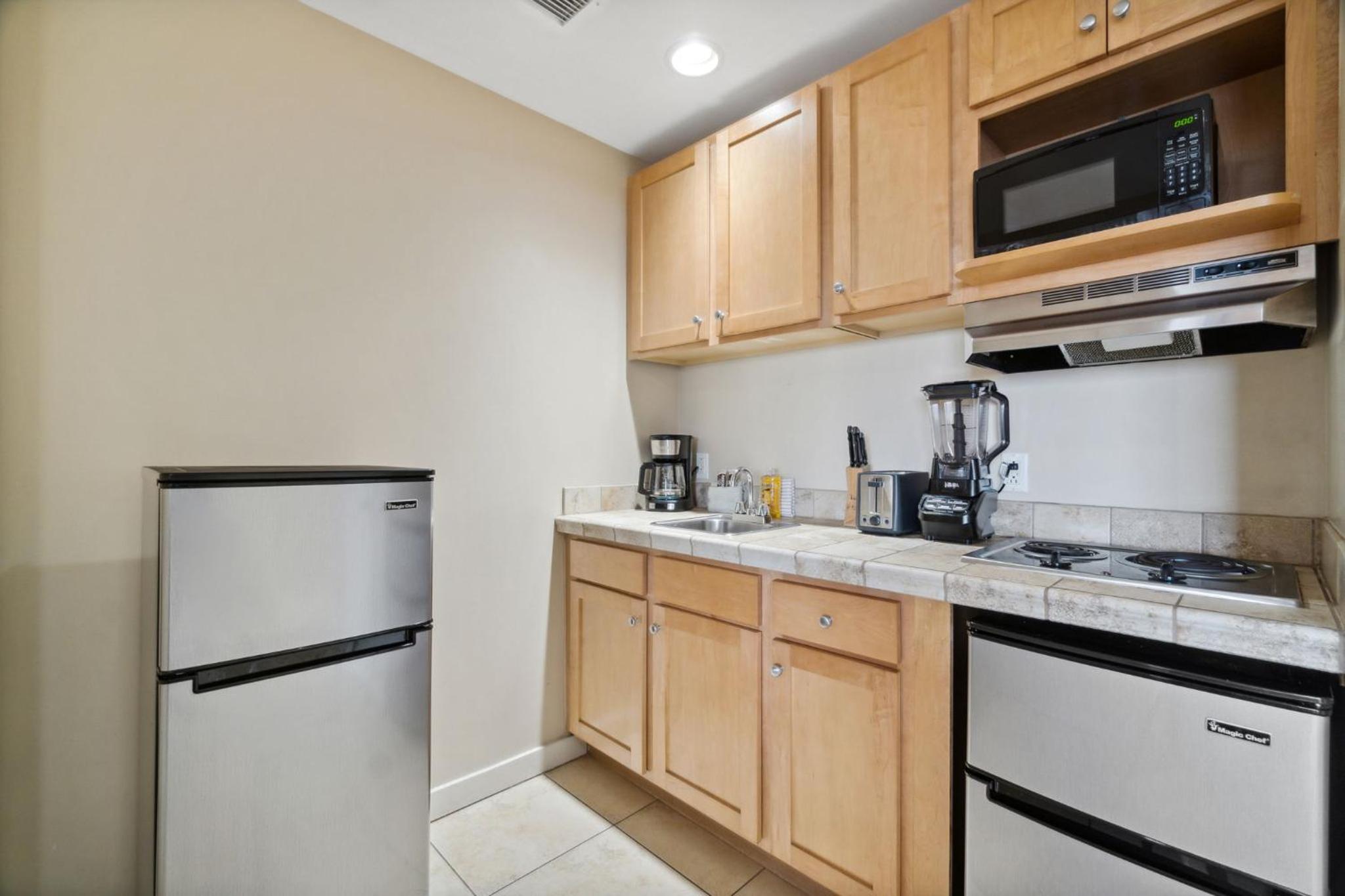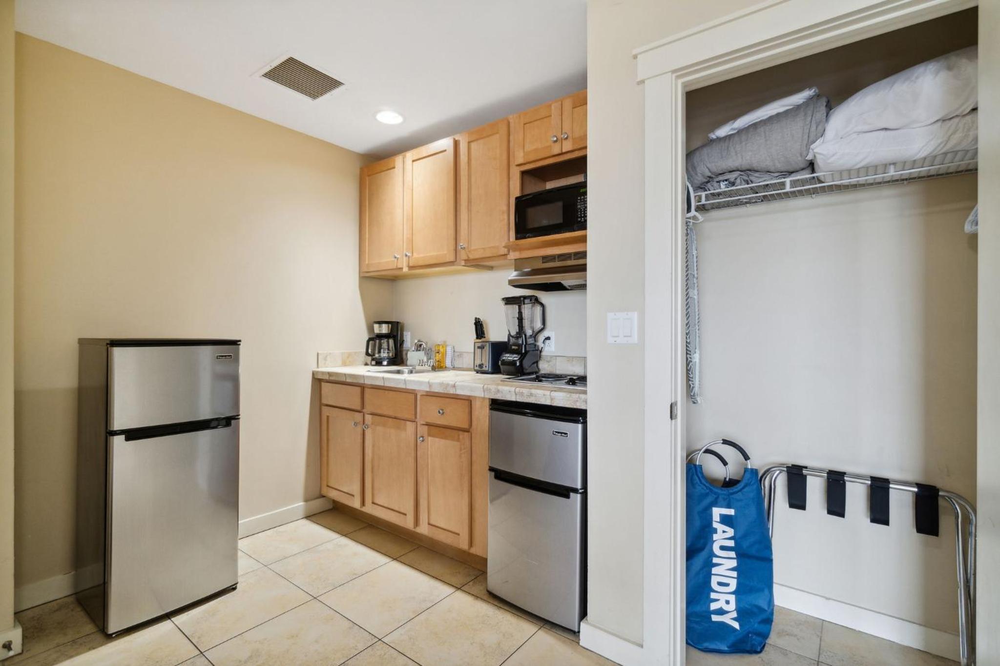 Convenient Amenities: A kitchenette with a microwave, toaster, and fridge. Private bathroom with complimentary toiletries. Private entrance for added privacy.