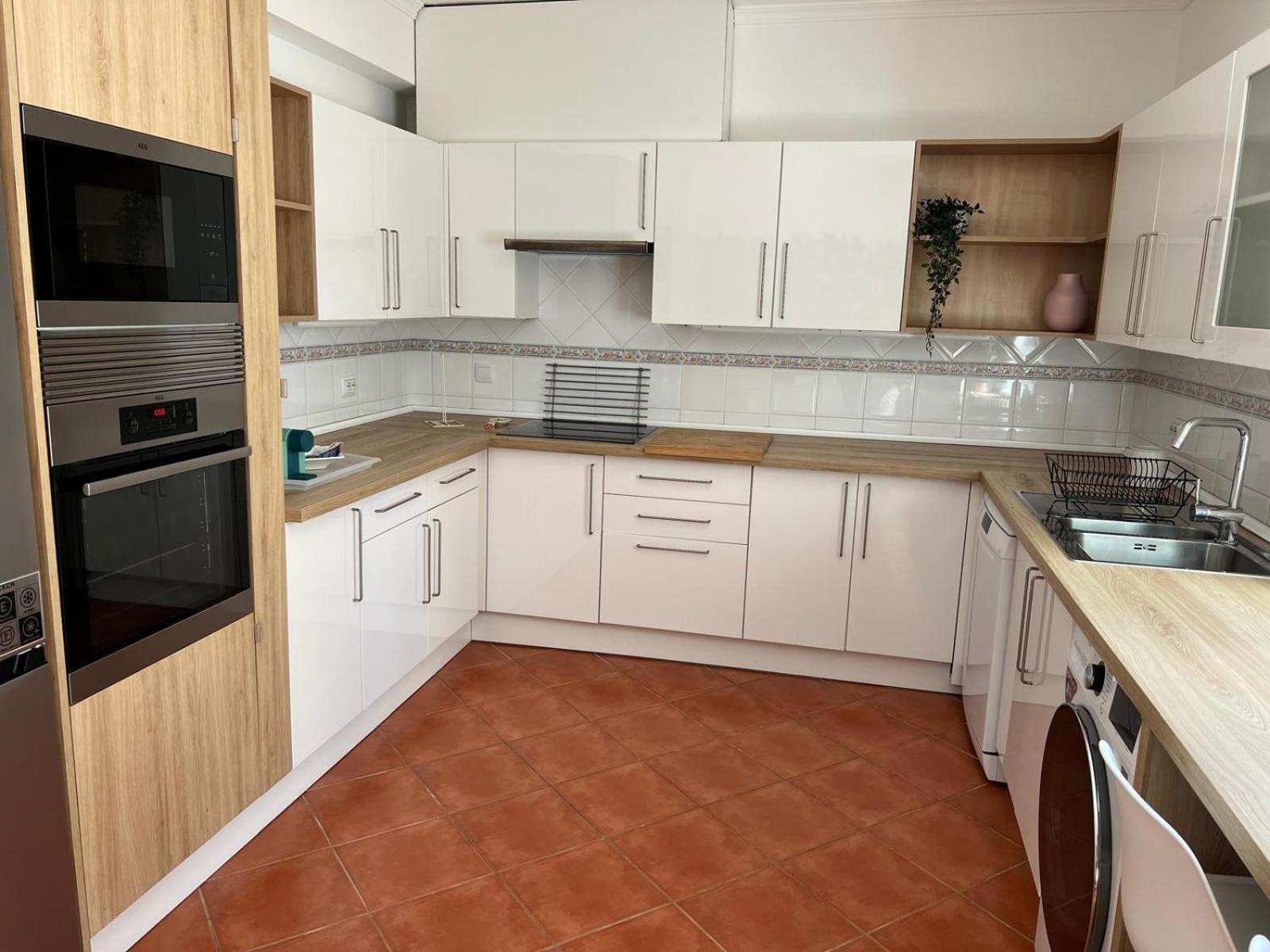 Relax in a well-equipped kitchen featuring a dishwasher, oven, microwave, coffee machine, and kettle. The property also offers a convenient outdoor dining area for enjoying meals al fresco.