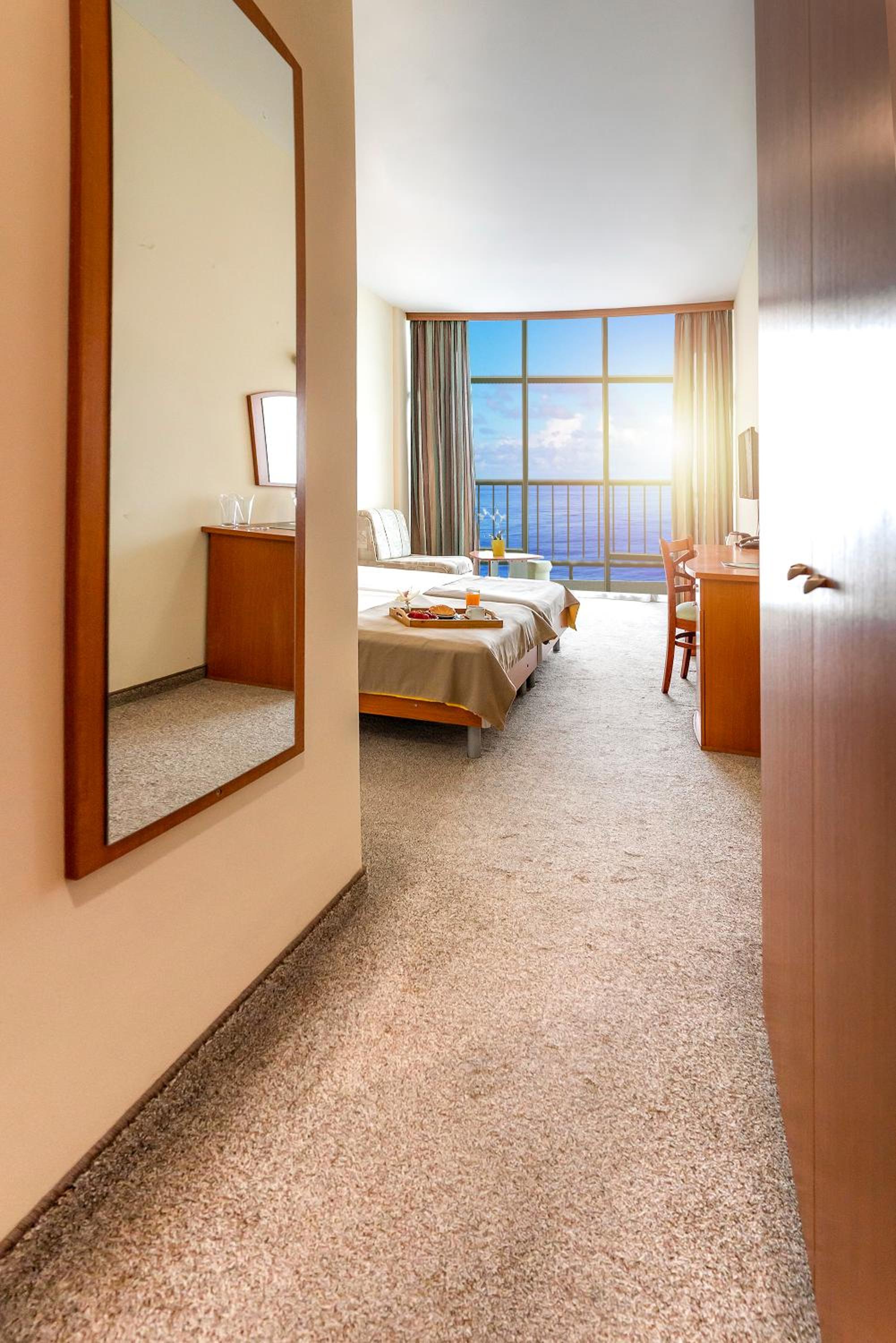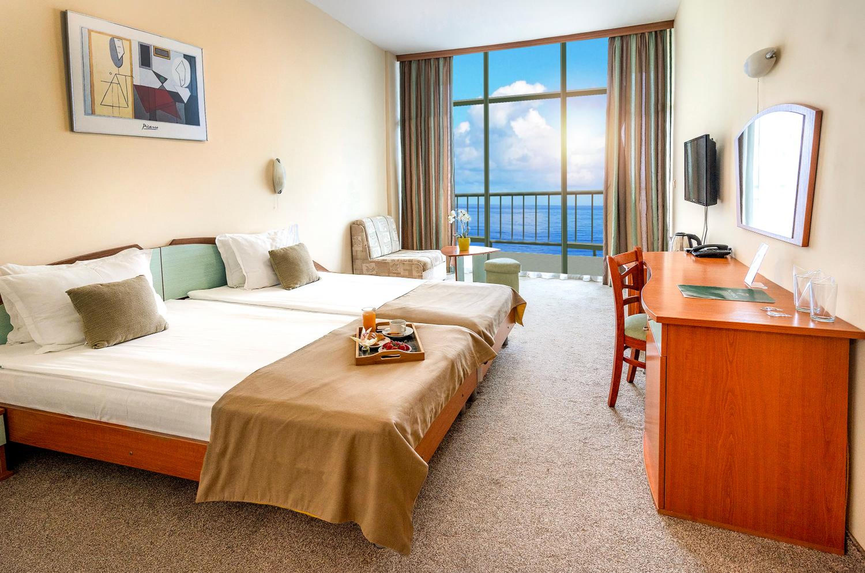 Beach Proximity and Green Surroundings: Nestled just 30 metres from the sandy shores of Golden Sands, this 4-star hotel offers a serene escape surrounded by lush greenery. Enjoy the sea breeze from your private balcony in the comfort of air-conditioned rooms equipped with free Wi-Fi.