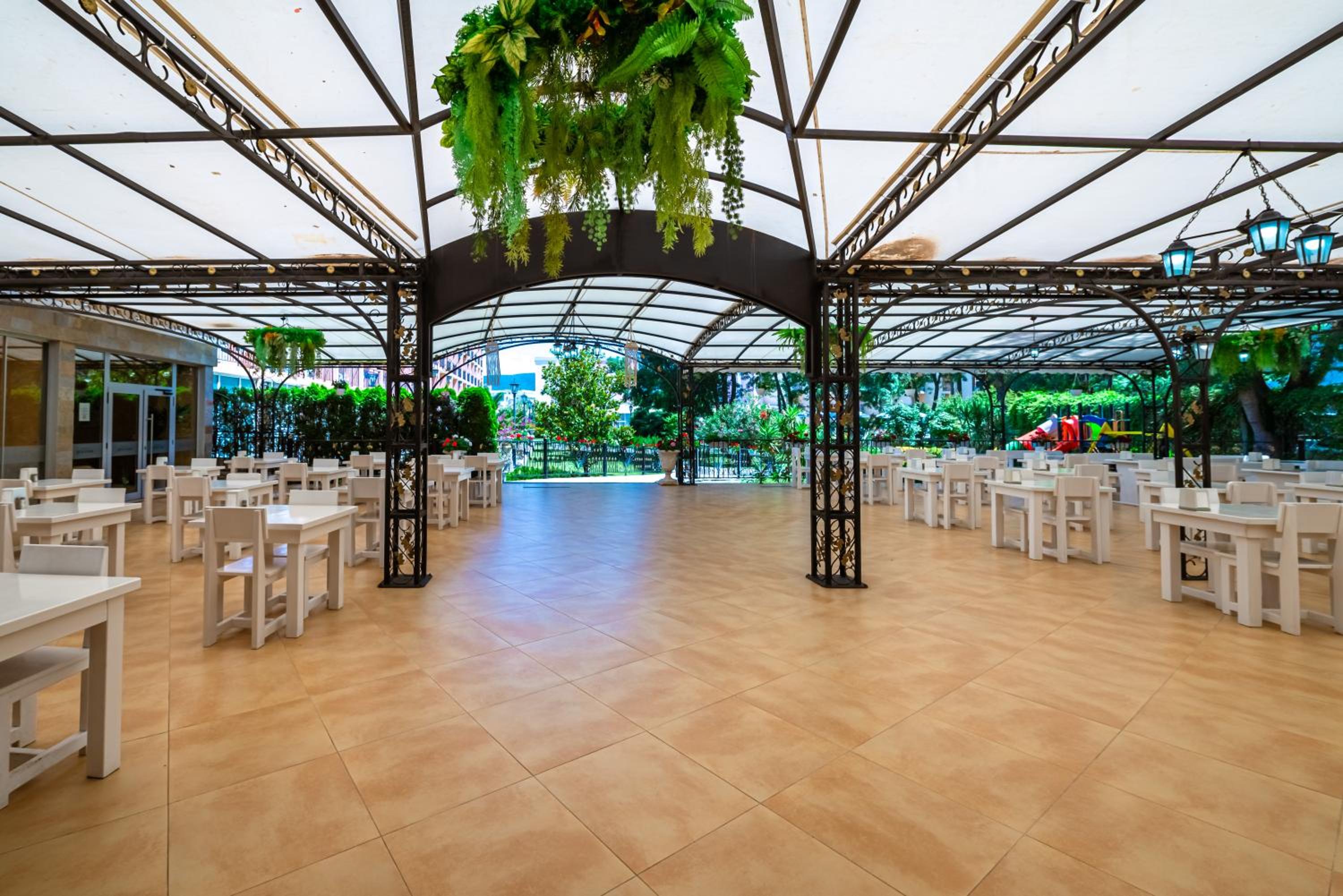 Indulge in a delightful dining experience at the cozy restaurant with a spacious garden, or grab a quick bite at the snack bar. Unwind with a refreshing drink at the lobby bar or the outdoor pool bar. The three outdoor pools, including a children's pool with a slide, offer relaxation and fun for all guests.