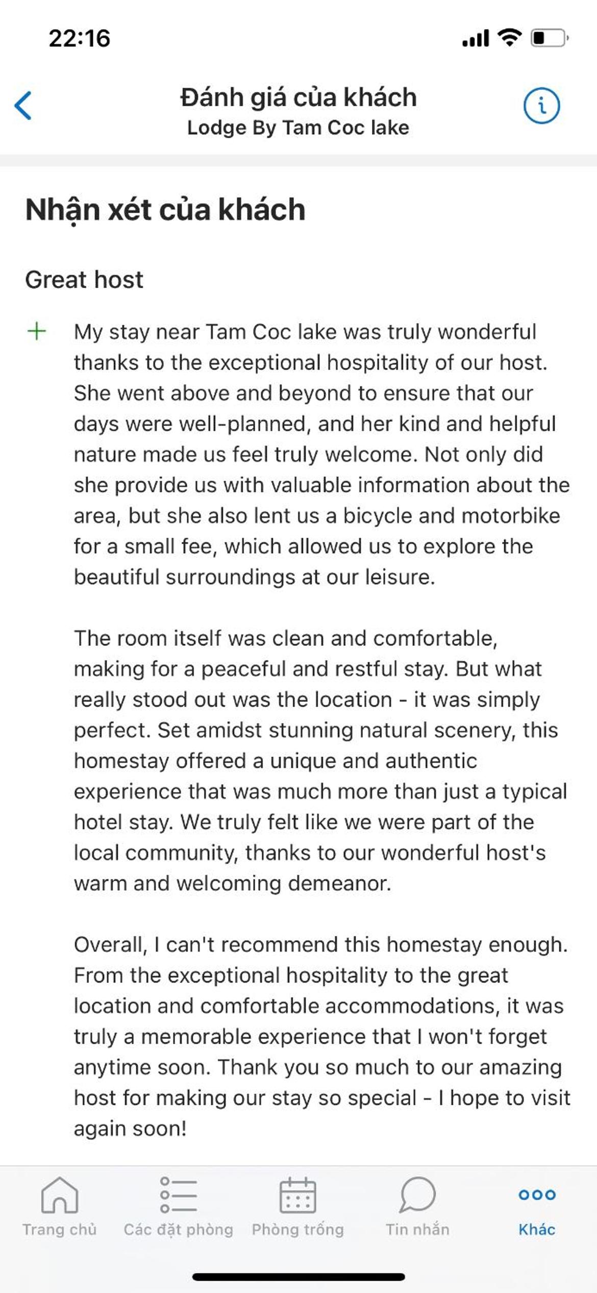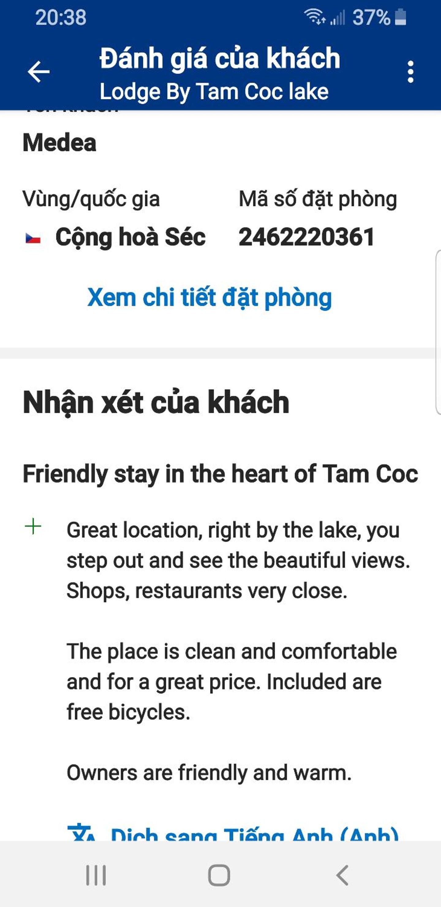 Ubytování je v super lokalitě v centru Tam Coc kousek od jezera, bylo čisté a pohodlné. Majitelé byli velmi vstřícní, domluvili jsme si u nich půjčení kol a skůtrů, všechno v pořádku. Snídaně byla menší, ale stačila.
