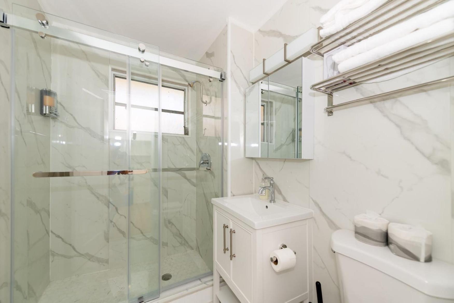 Bathroom slide door had 1 side in mater bedroom,we didn’t use it during staying in here. We use only 1 bathroom and it’s not comfortable for a group . The mattress is too soft and it’s hard for sleeping . The upstairs guests walked and stepped very heavily. It’s made us in apt#2 downstairs couldn’t sleep at night until morning. The ceiling and wall had cracks. This apartment should upgrade or renovate it. And parking fee $25/night is higher than they said it before $20 per night. They don’t said upfront $20 plus tax. How can parking fee has tax on it ? This is ridiculous . But we still paid $75 for 3 nights by Cash. We still put Tips for housekeeper before we left. Even though, they never come to clean or change cover bed sheets. We are not happy during staying vacation in this facility. This is the first time, we are not happy with this booking.