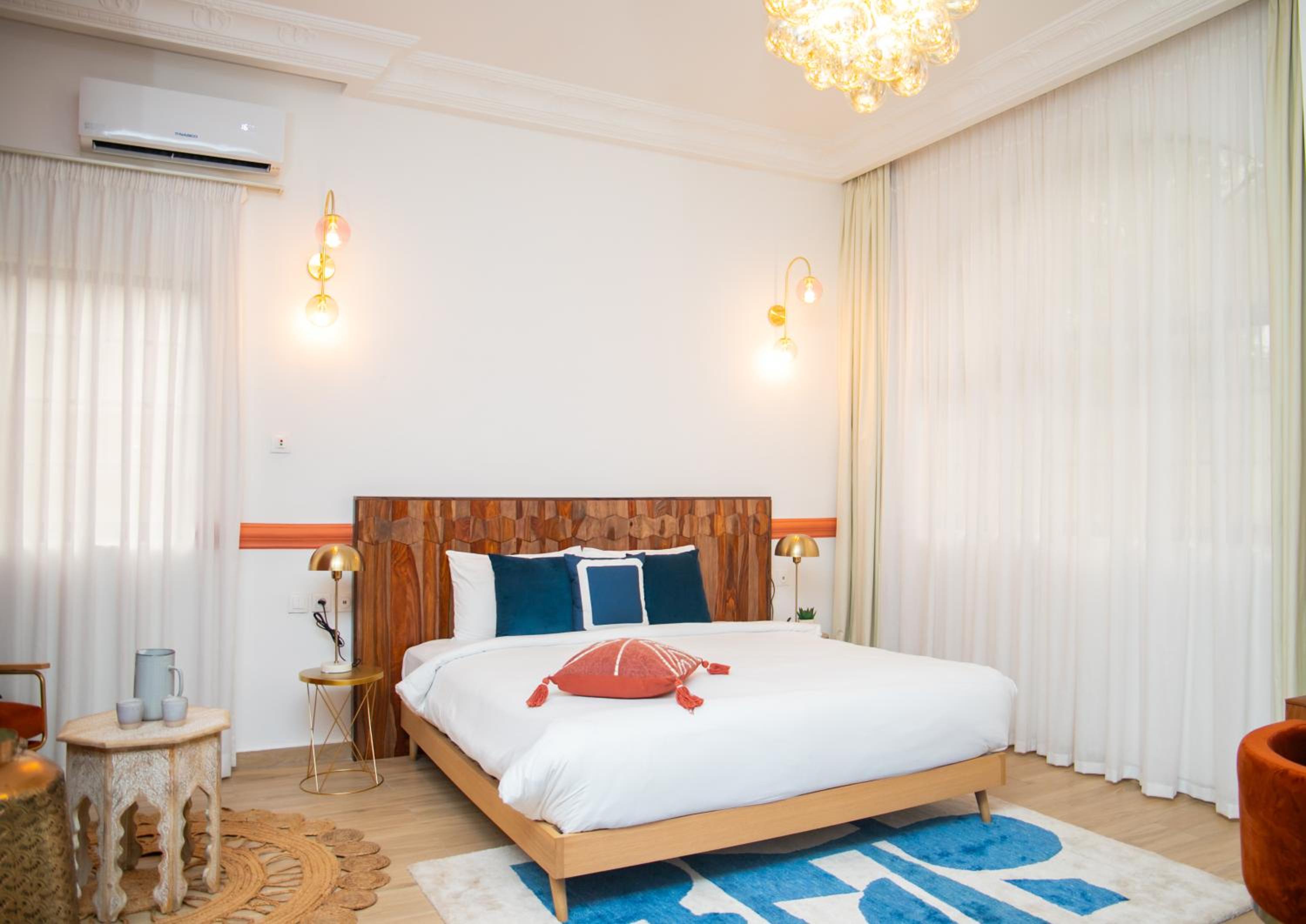 Indulge in our elegantly designed rooms with modern amenities, including air conditioning, flat-screen TVs, and private bathrooms for a comfortable stay.