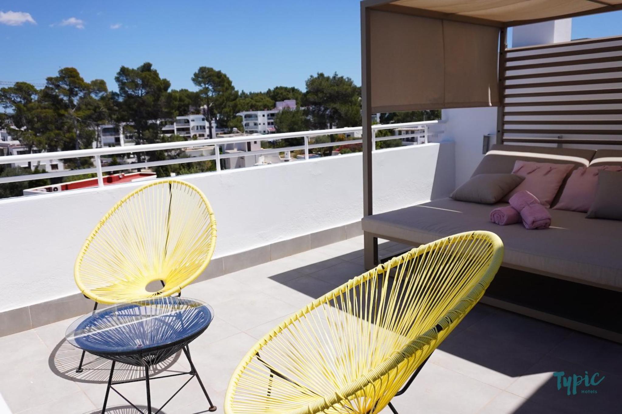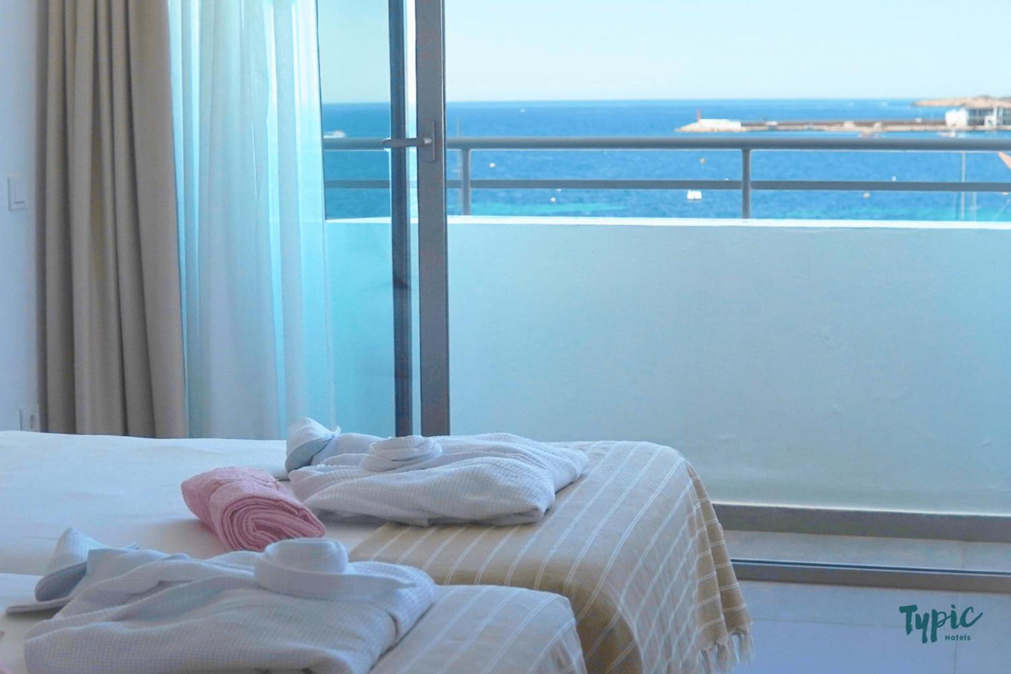 Panoramic Views and Outdoor Relaxation: Marina Playa, located on Es Pueto Beach, offers stunning views of the Mediterranean Sea. Guests can unwind by the outdoor pool or on the sun terrace equipped with Balinese beds and loungers.