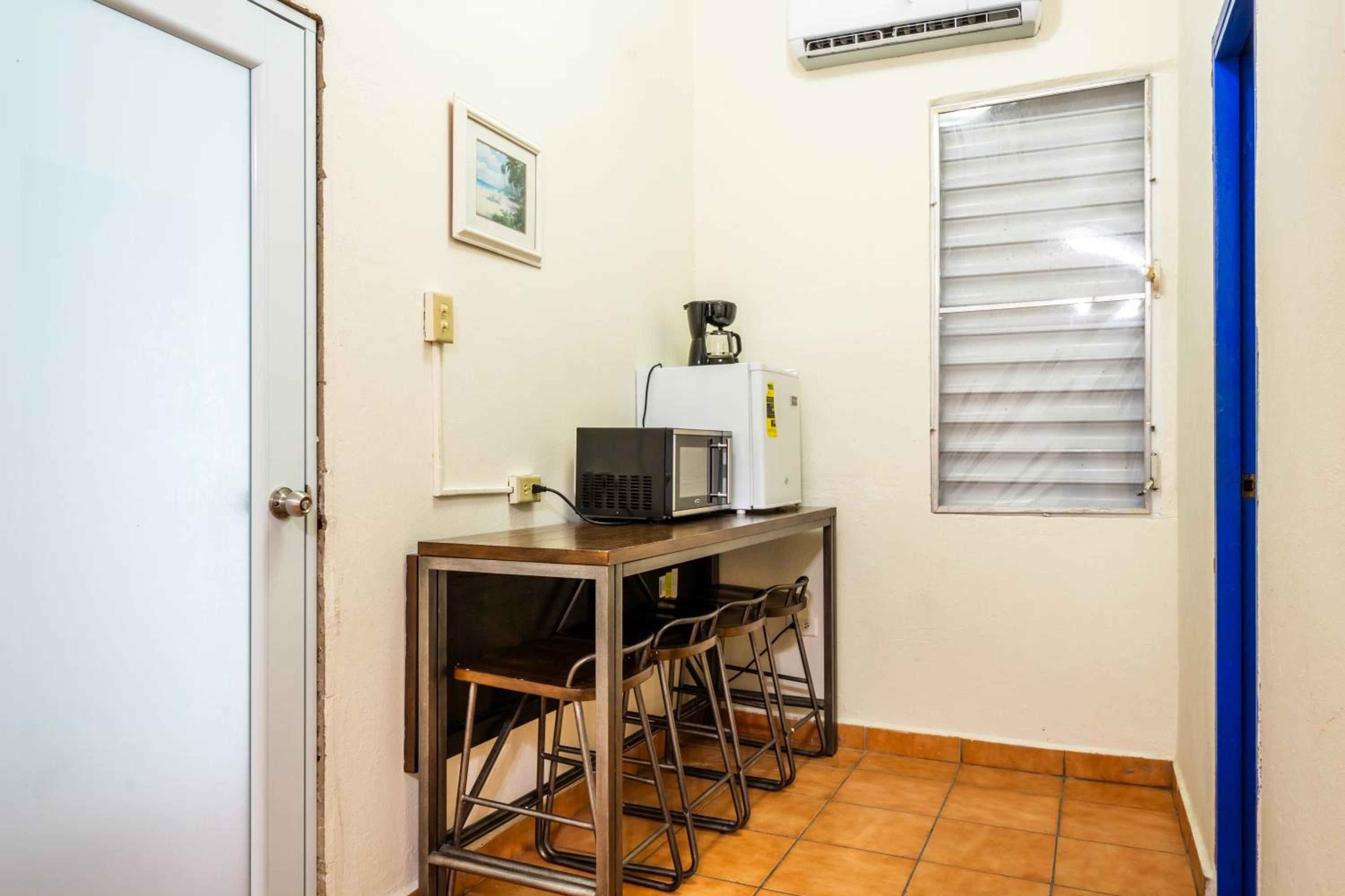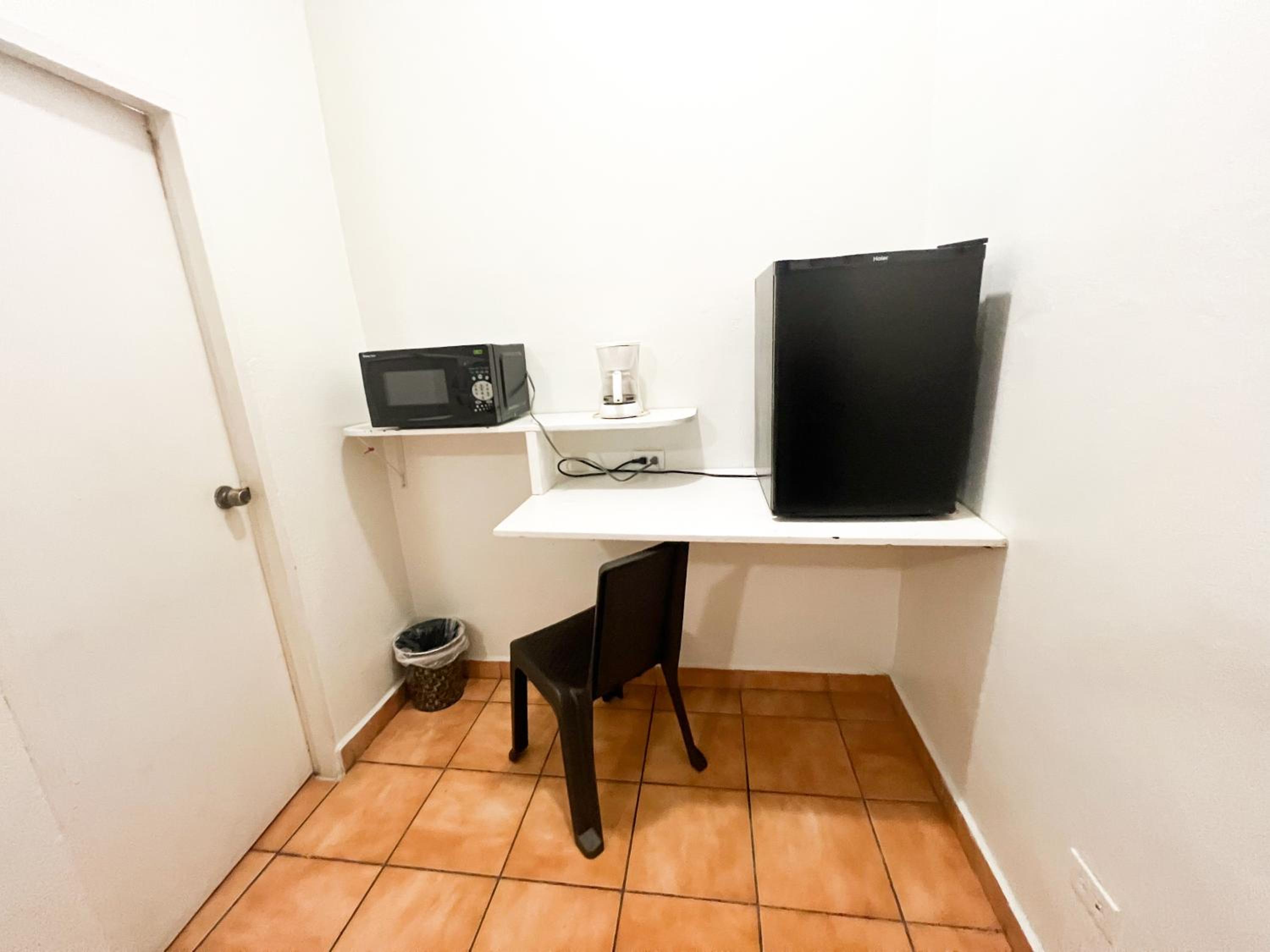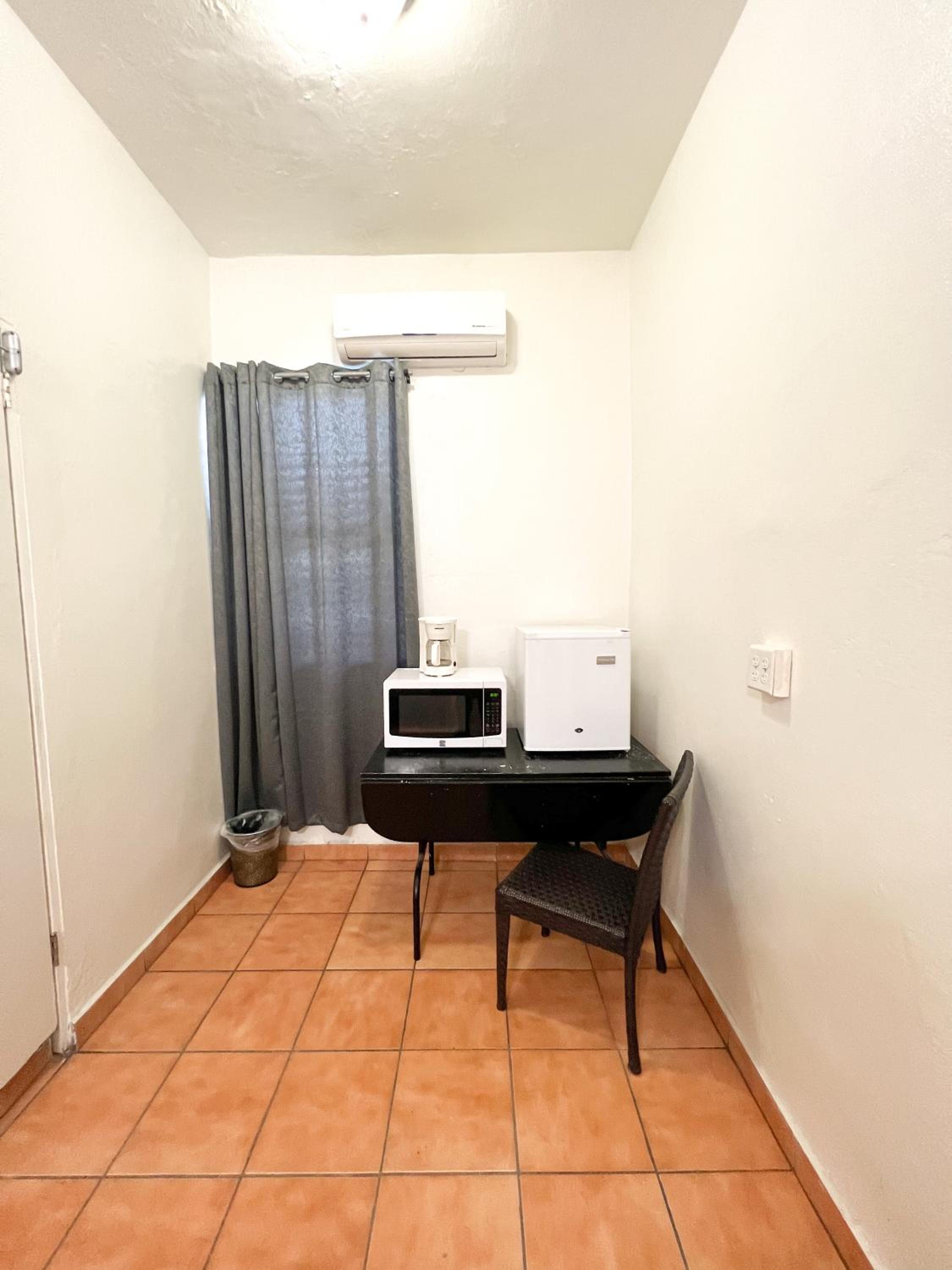 Coffee maker but nothing else (no coffee, filters, cups, sugar, napkins, etc.) Too much light coming from the hallway, a curtain would be a nice addition . No hangers, no blower, leaking toilet. No windows.