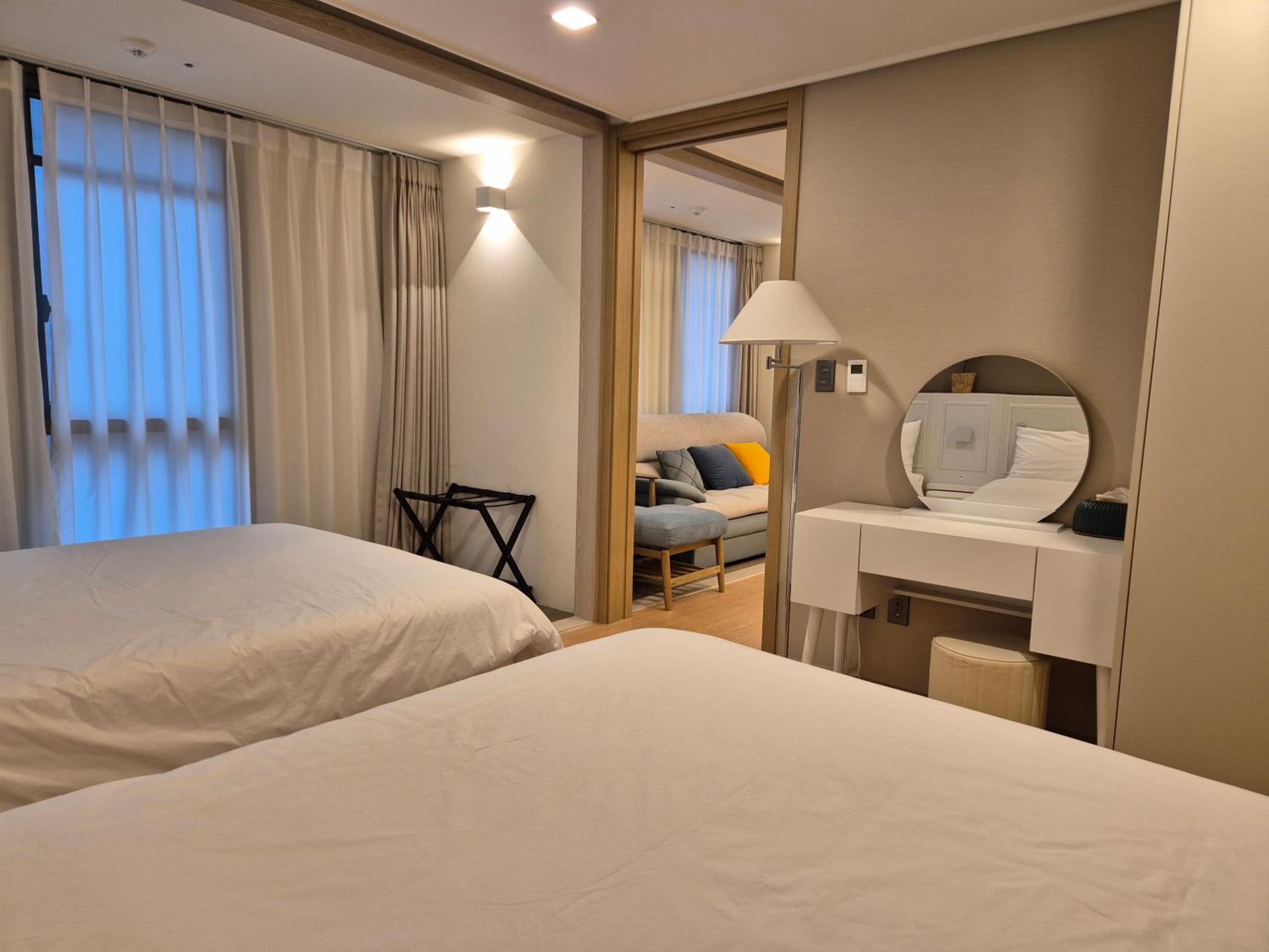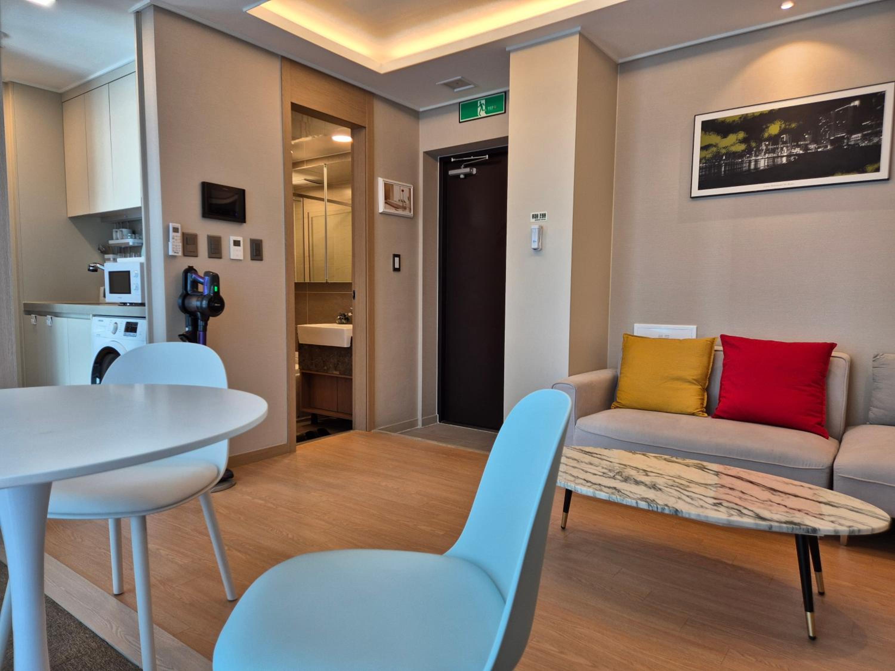 位置絕佳,從車站拖著行李走過來3分鐘,非常的輕鬆,走下來就是海雲台大街,到夜市5分鐘,到海邊約15分鐘可抵達。附近有許多便利商店,隔壁有超市,附近有很多好吃的炸雞店、餐廳、早餐、咖啡店,都是走路可以到達