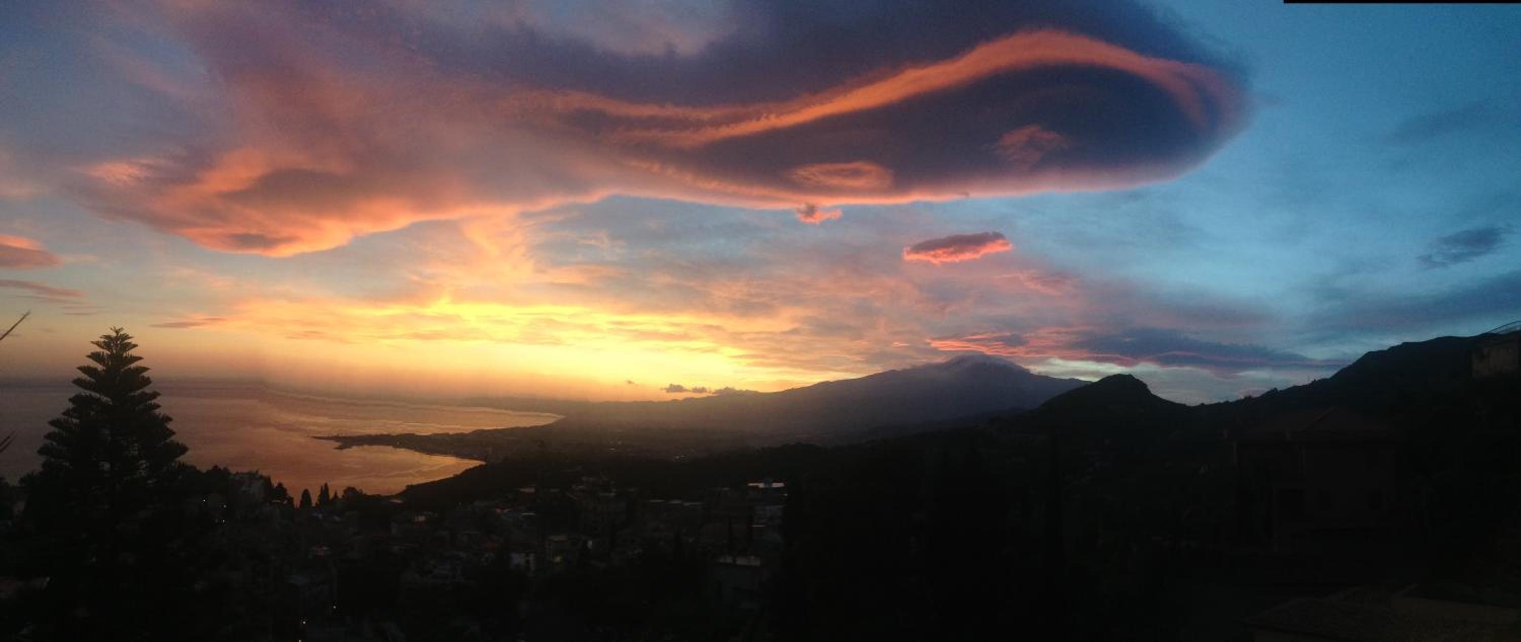 De locatie was subliem. Hoog gelegen met schitterend uitzicht om de omgeving waaronder de met sneeuw bedekte Erna waaruit ook nog rook omhoog kwam omdat de Etna sinds een paar maanden licht actief was. Dat ook nog eens van een groot zonnig terras dat bij de suite hoort. Fantastisch.