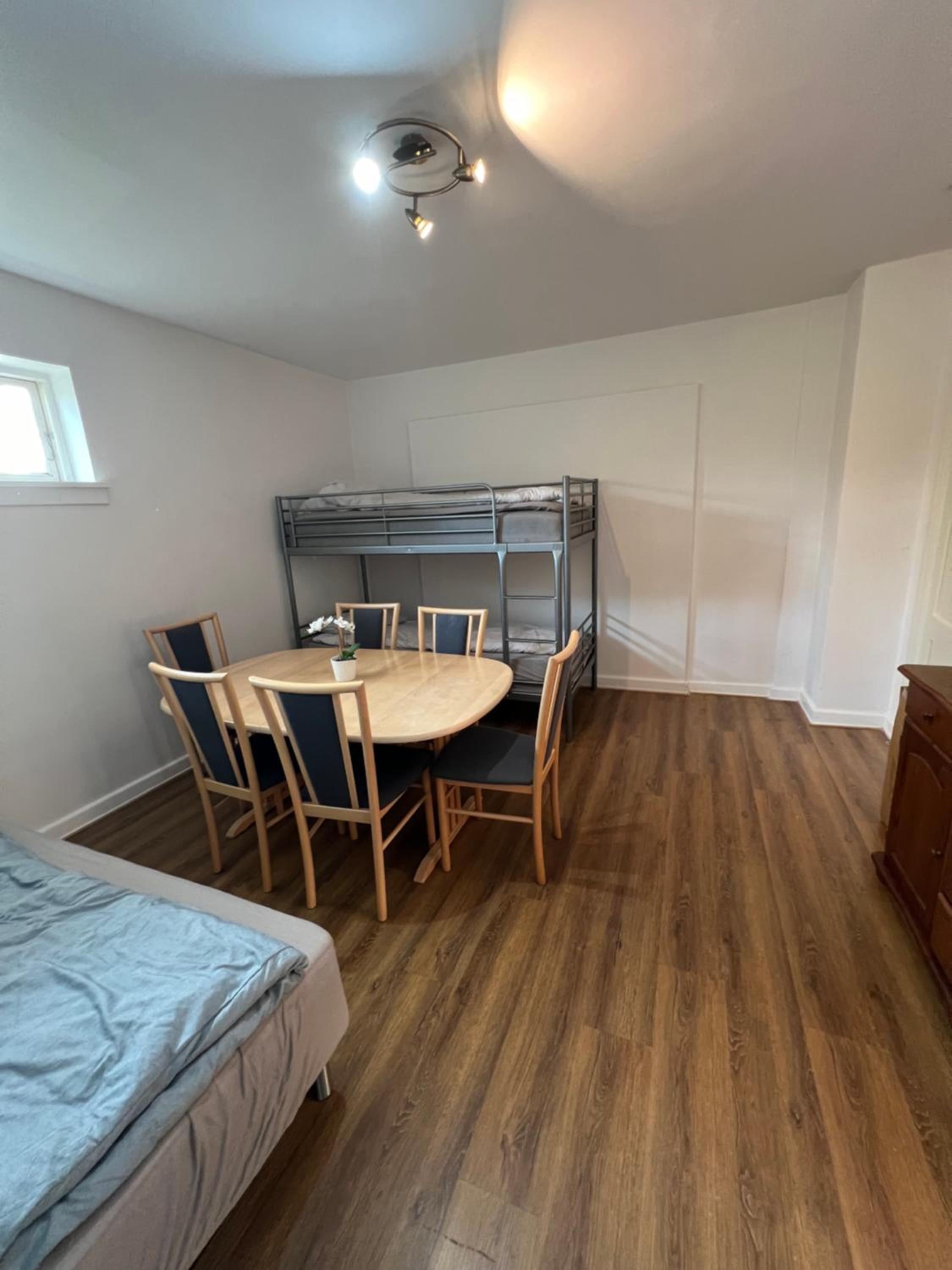 Vi havde et familieværelse med køjeseng, doubleseng, eget køleskab og spisebord.