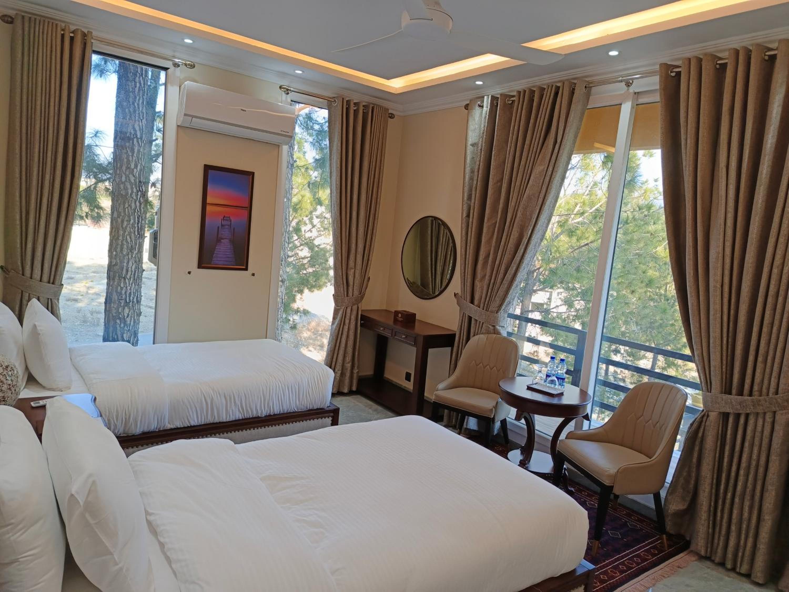 Indulge in our well-appointed rooms equipped with balconies offering breathtaking mountain views. Relax in comfort with modern amenities like TV, air conditioning, and cozy seating areas.