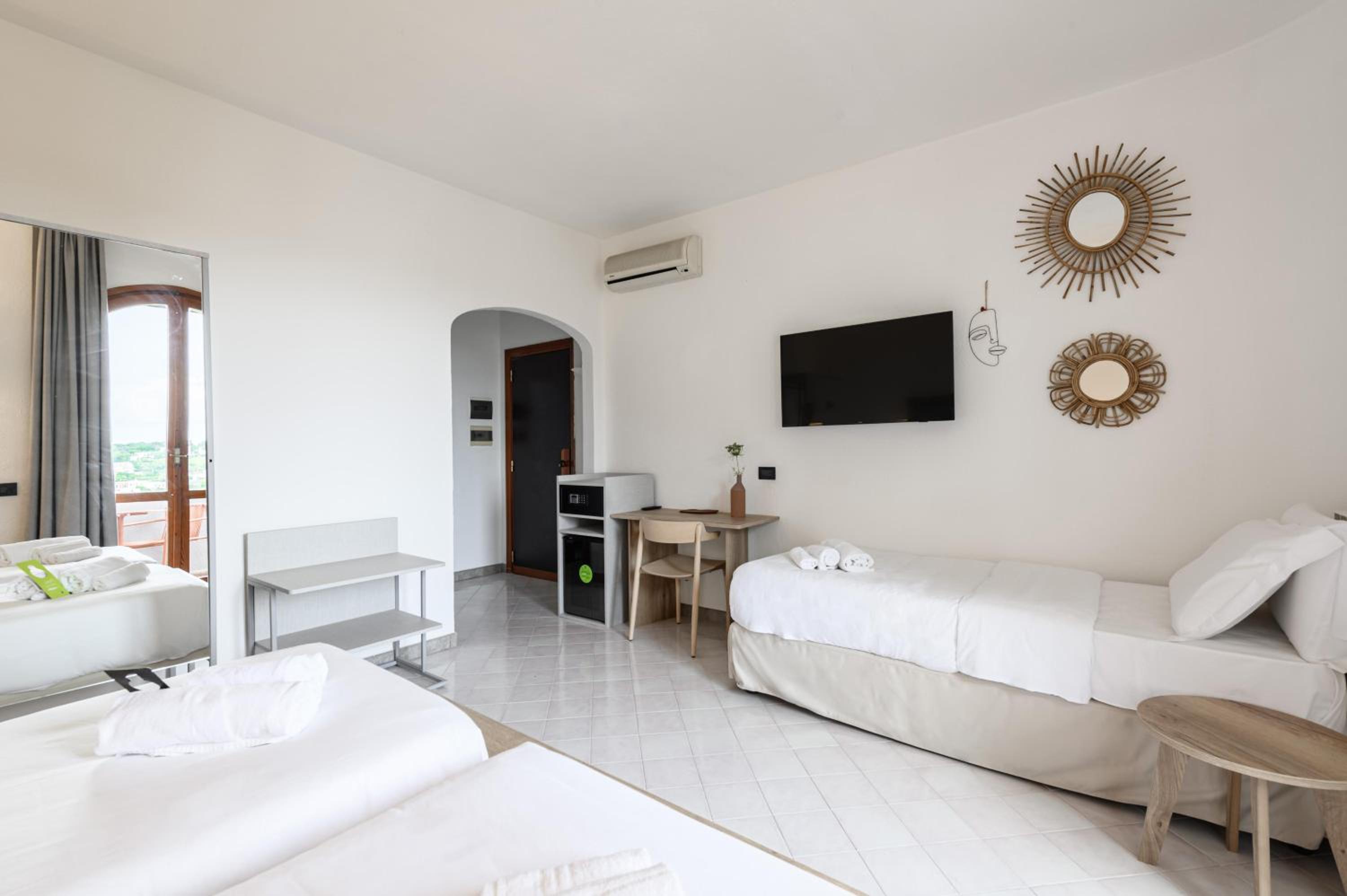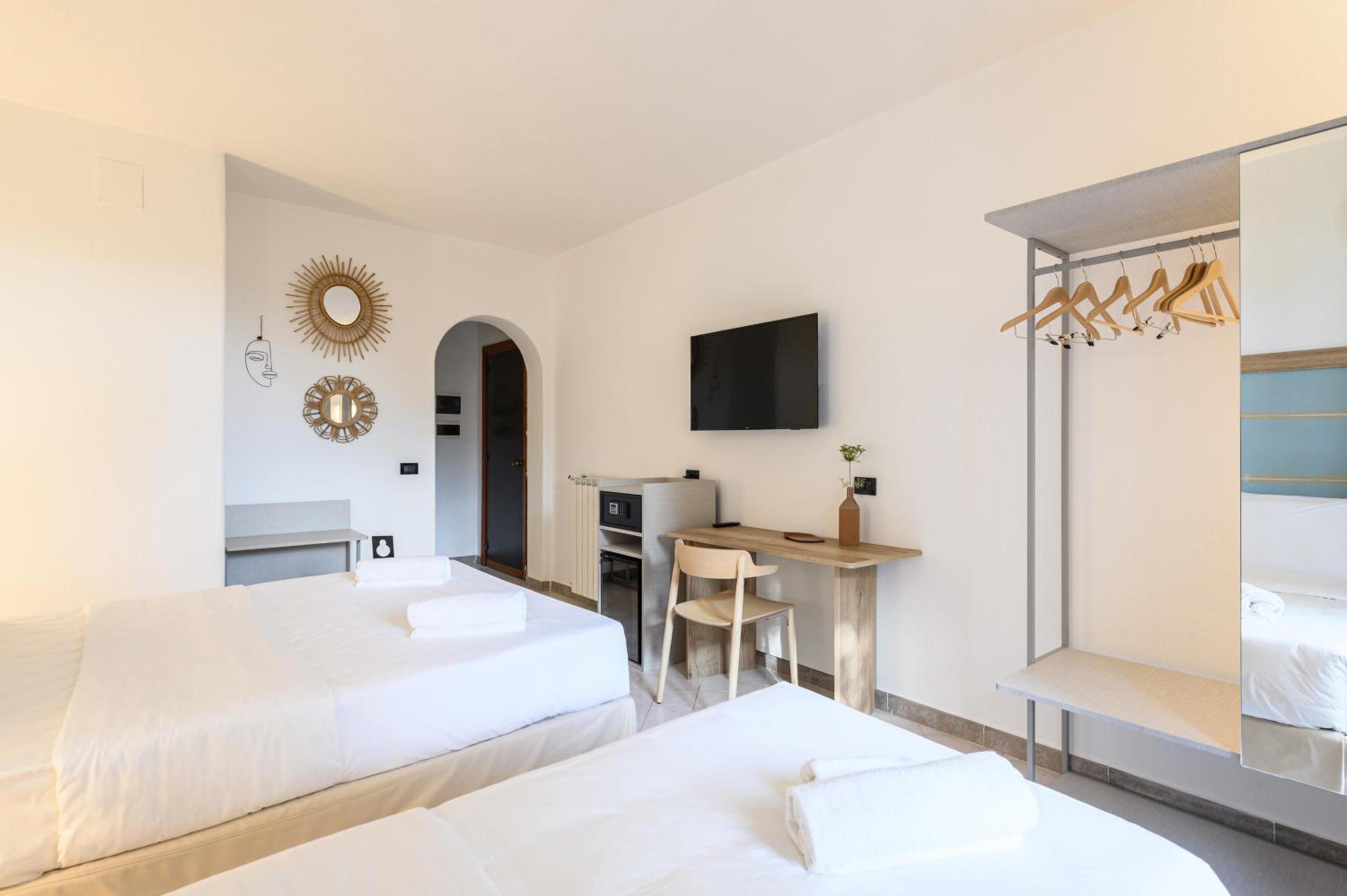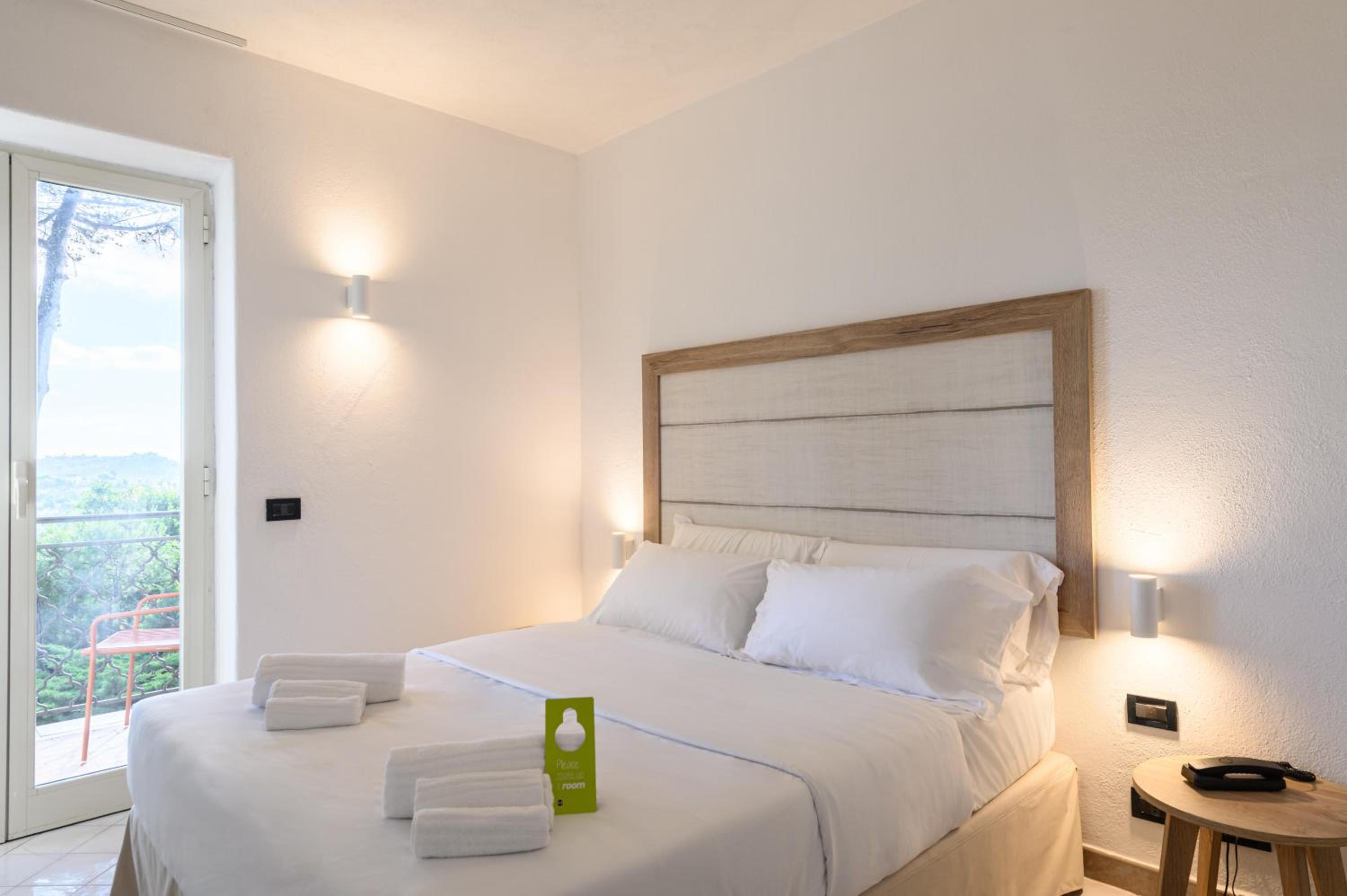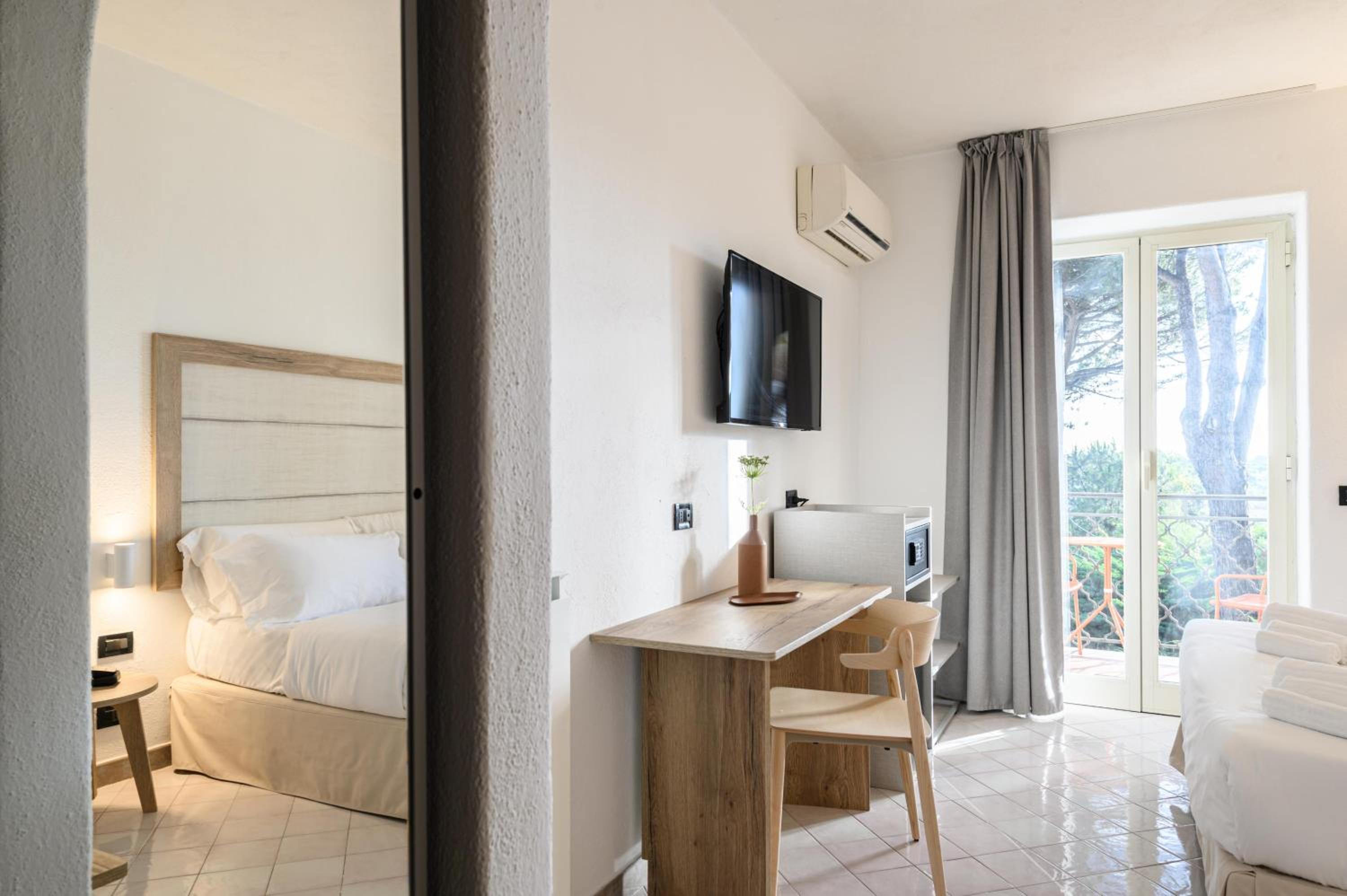 Rooms at San Nicola are bright and cool with tiled floors, each featuring a balcony or terrace, many with stunning sea views. Amenities include satellite TV and a private bathroom with toiletries.
