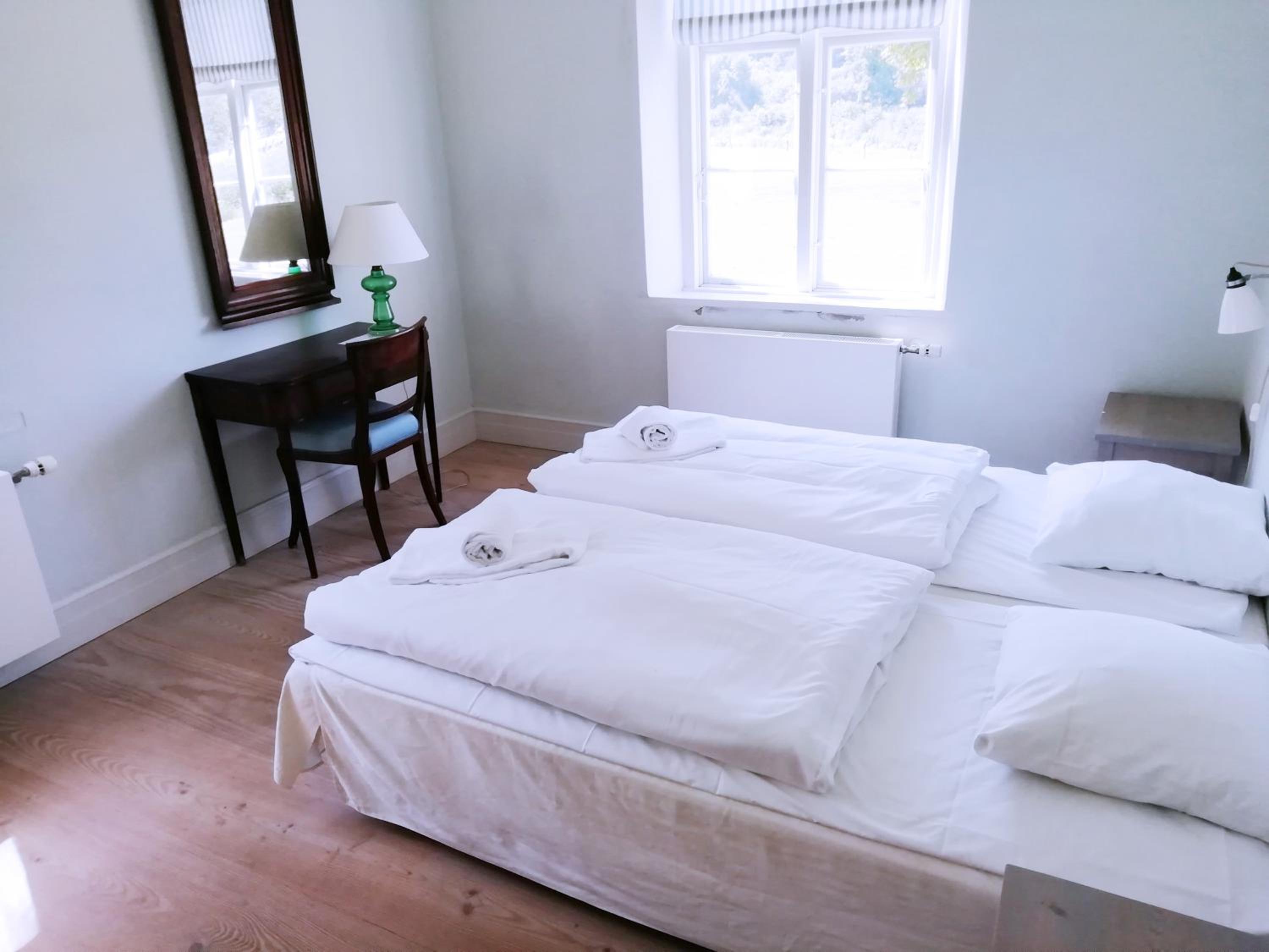Det var lidt besværligt at finde. Vi kørte først til kroen. Blev af en venlig sjæl ledt ca 400 meter tilbage af vejen til en bygning der indeholdt reception og restaurant. Hvorfra vi så blev ledt tilbage igen 400-500 meter til et værelse, der ikke lå på hverken kroen eller på slottet, men derimod i en ældre motel-agtig bygning i en baggyde.