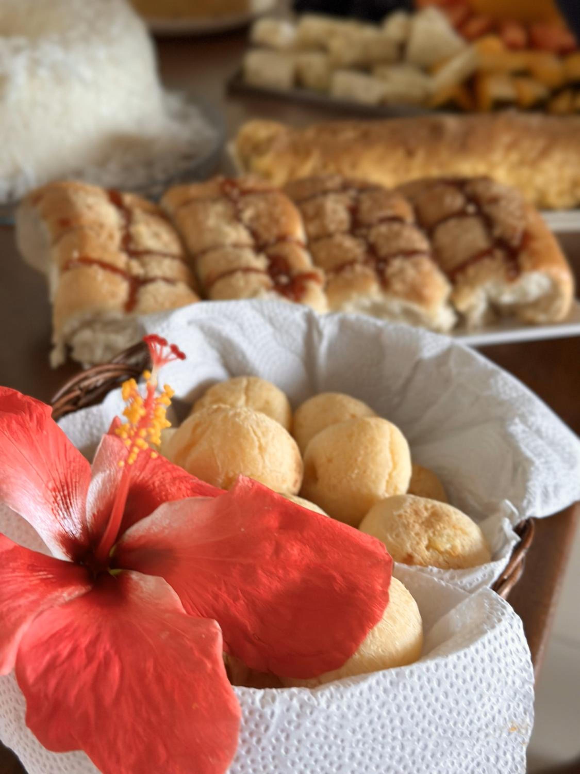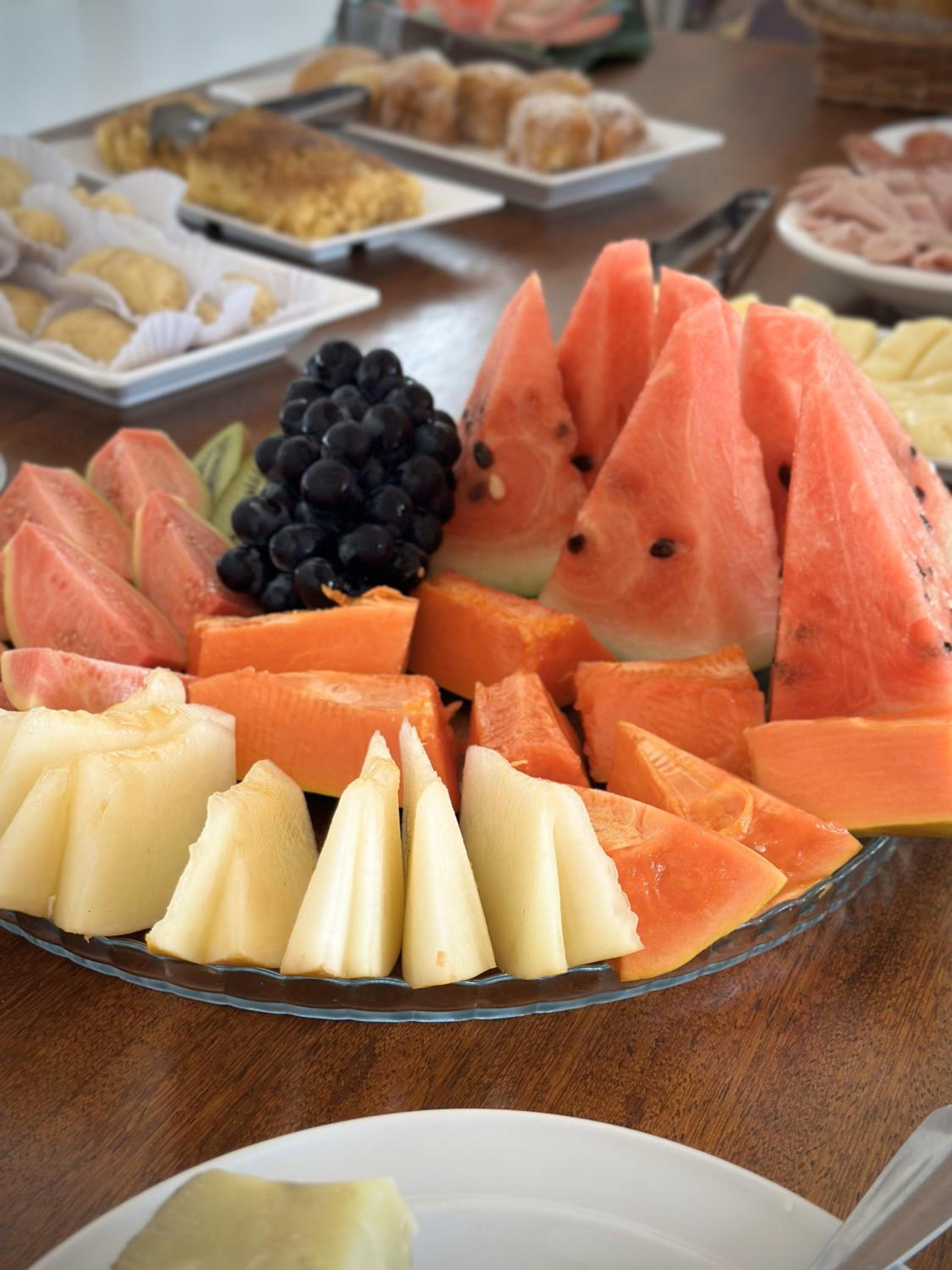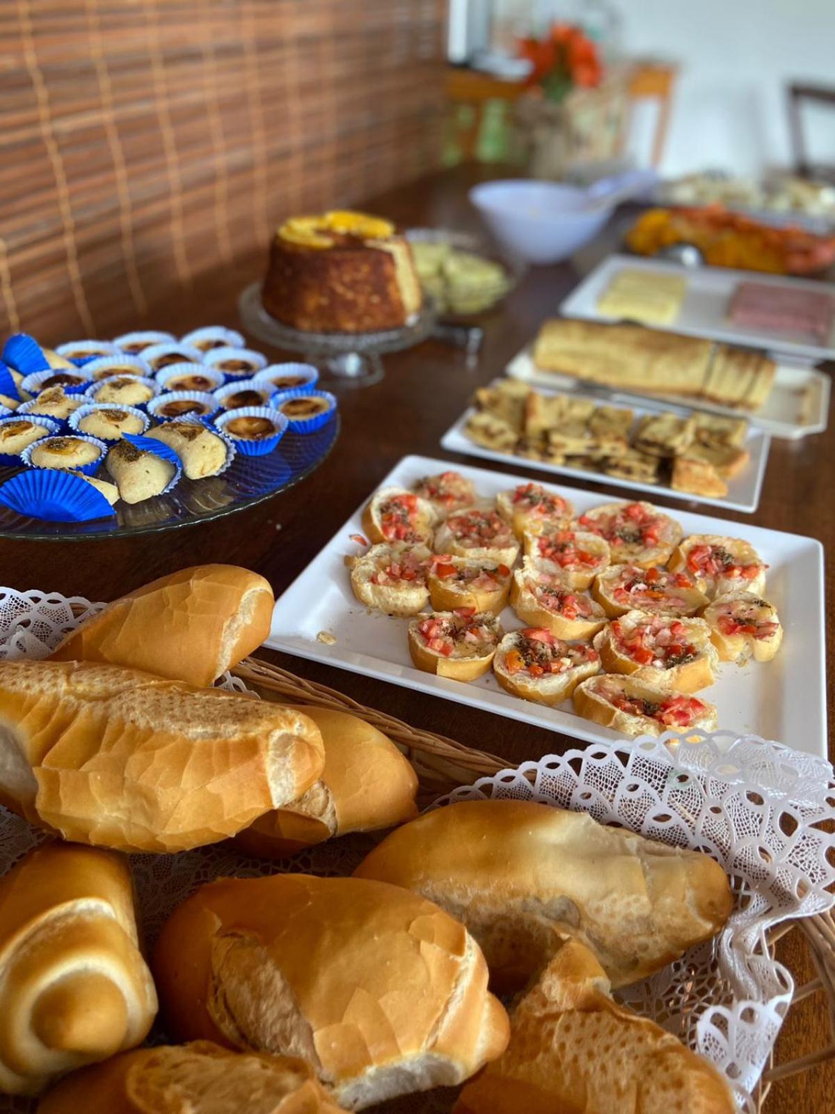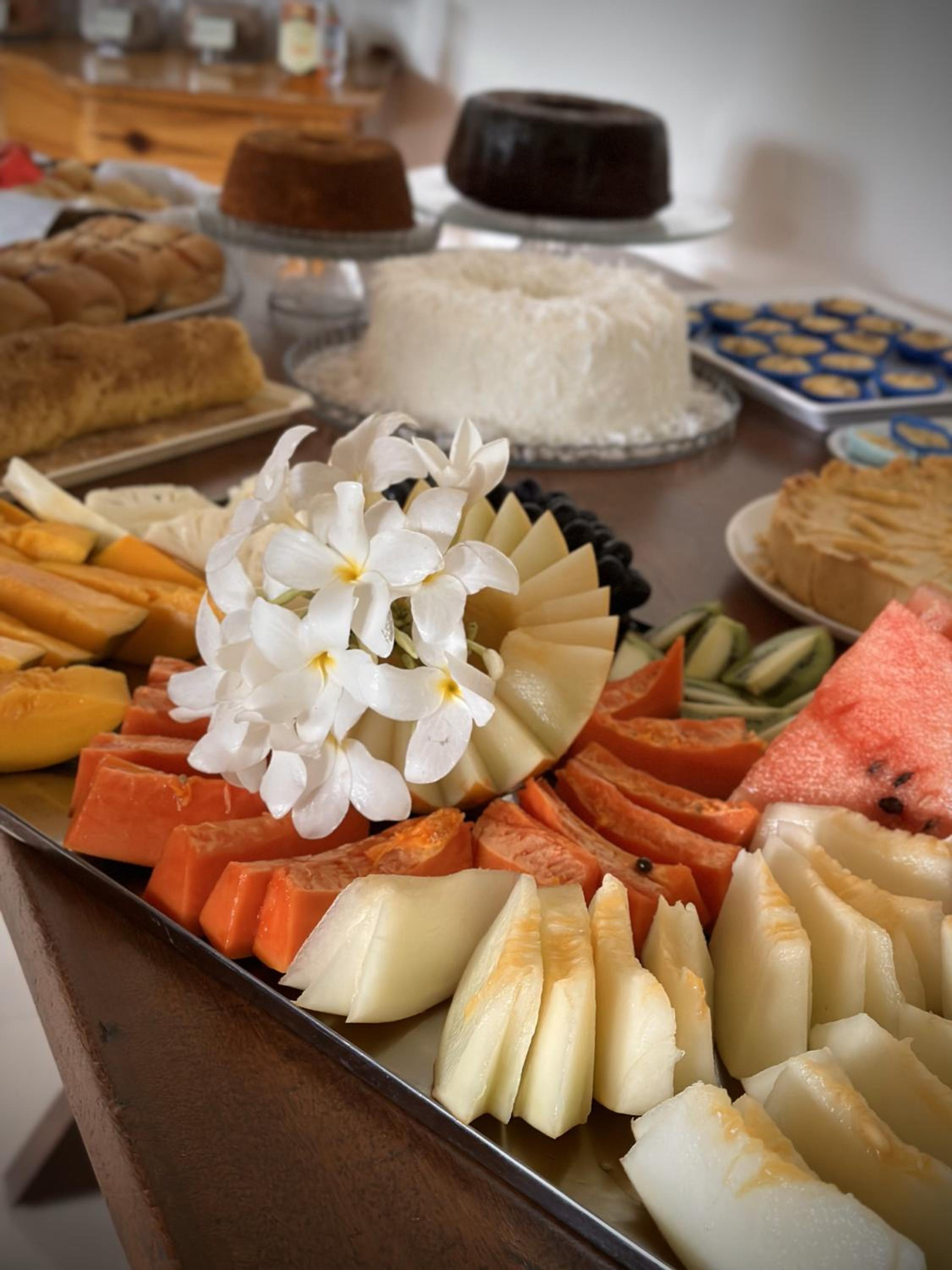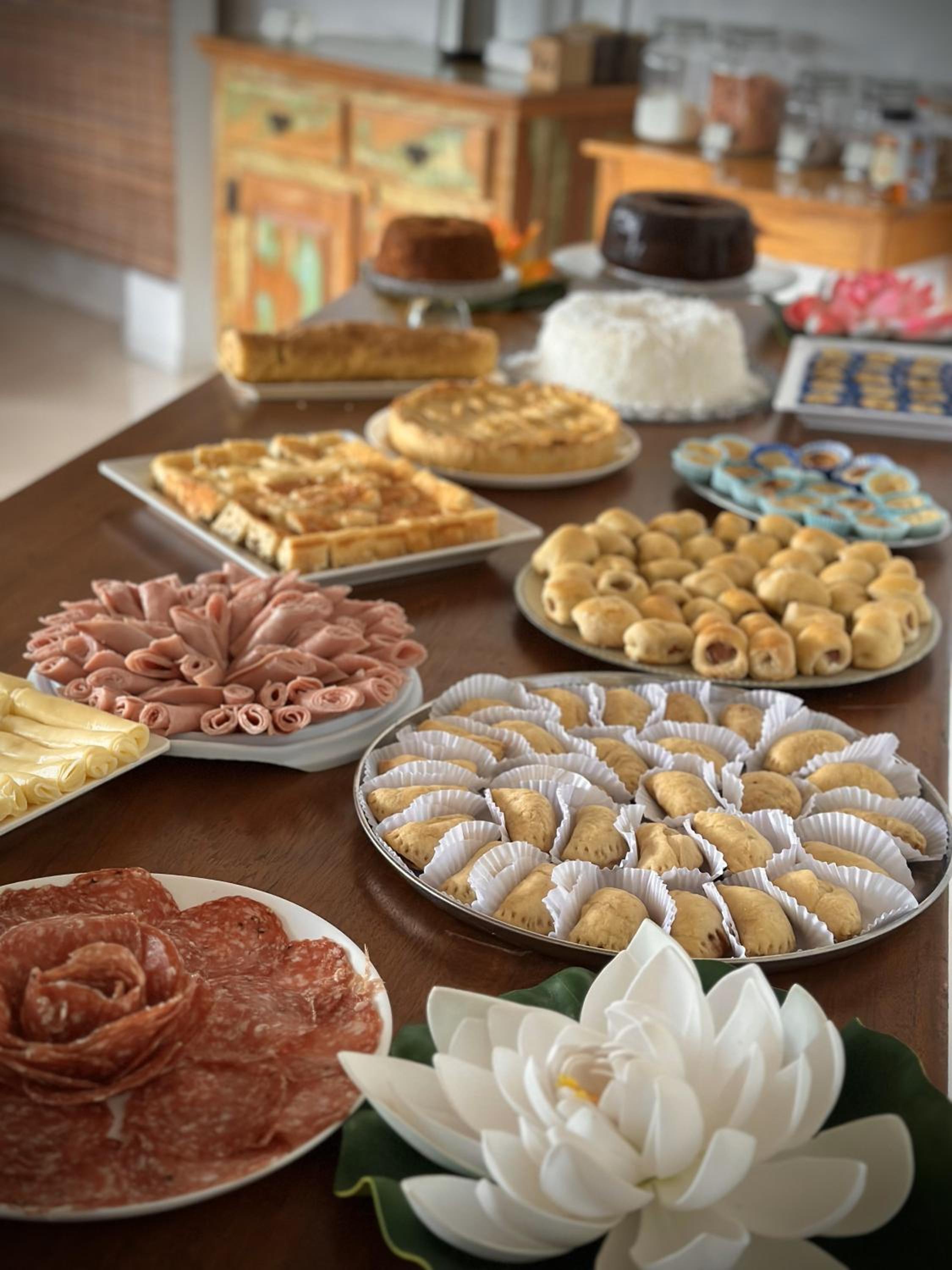 O café da manhã é uma delícia e bem variado. Ficamos 3 dias e todos os dias tinham coisas diferentes. Tinha também itens básicos de café da manhã que se repetiam (pão, ovo, manteiga, queijo, presunto, café, suco...), mas também vários outros diferentes em cada dia.