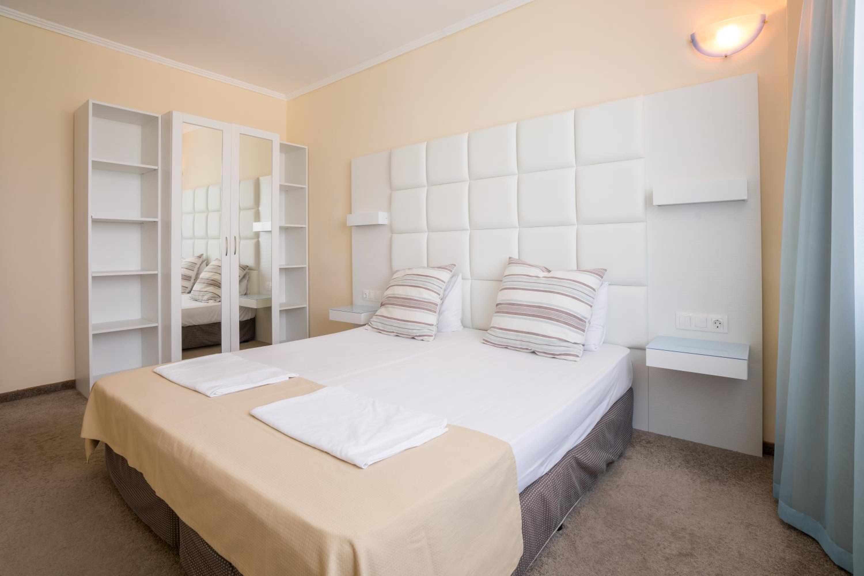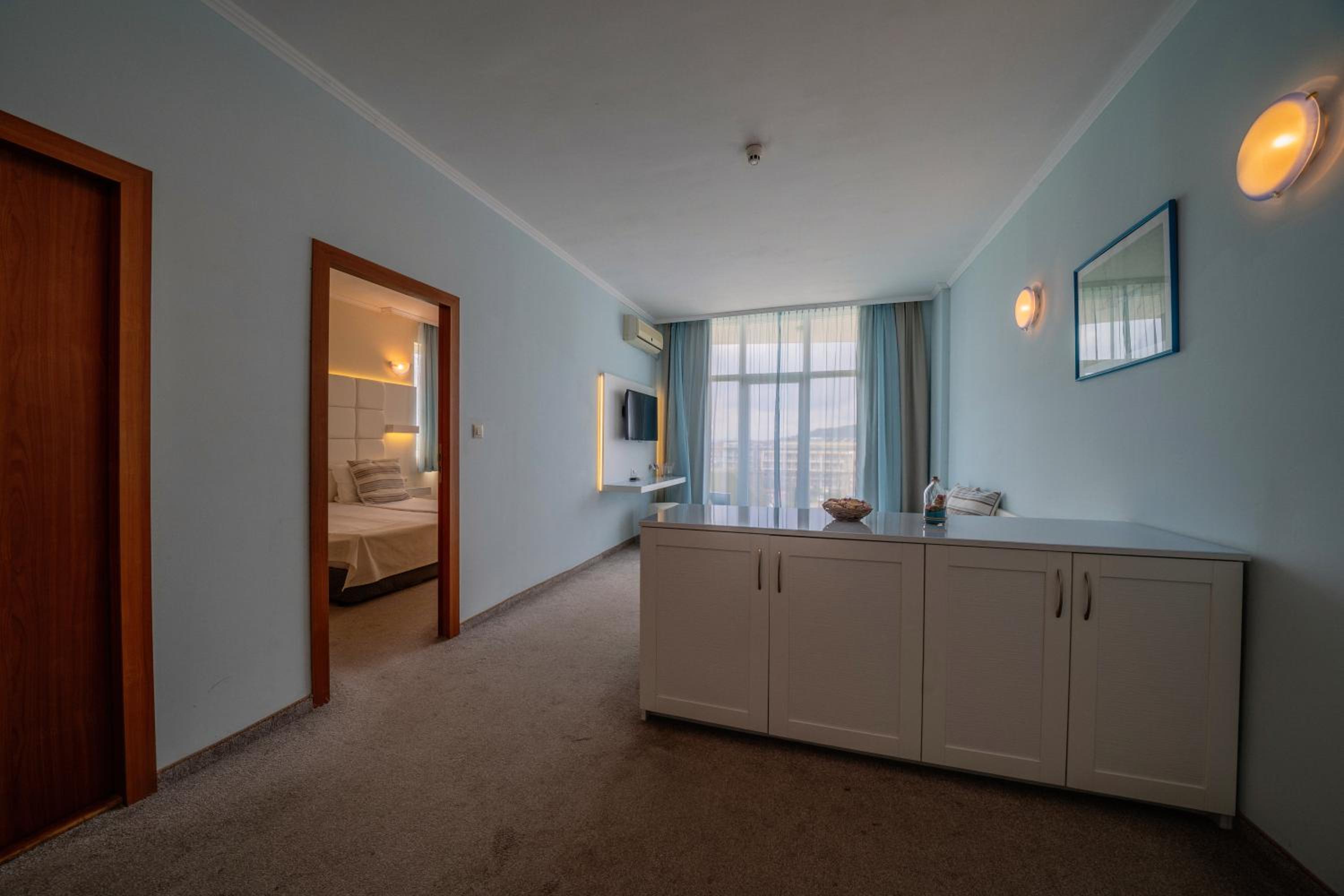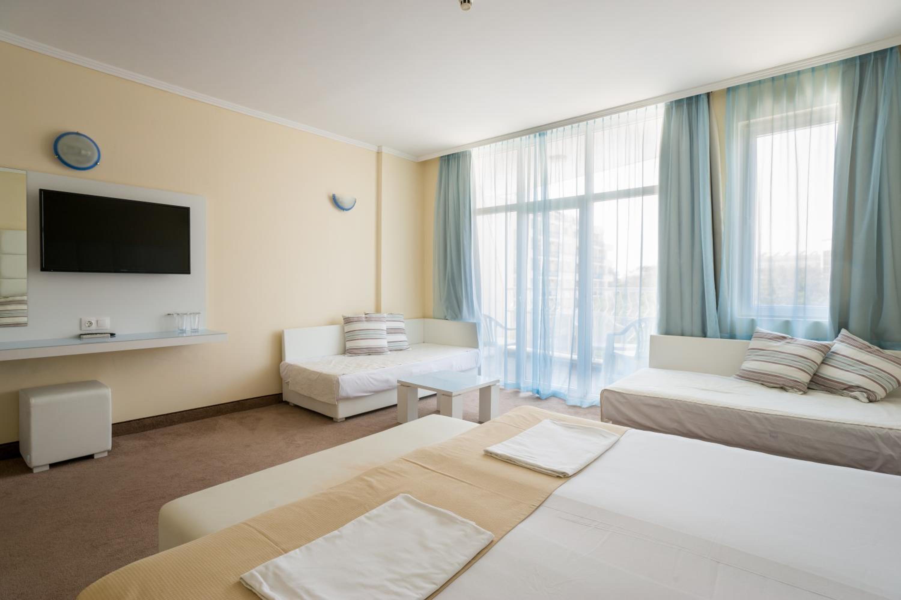 We had a 2 rooms family room with 2 baths and 2 balcony. Chilly. Meal was wonderful. Grill, hot and cold meat, european and local also fish. Fruits, green salads always, Exclusively lovely staff. Hotel has a private beach with tents and umbrellas. 5 minutes to walk. The sea is wavey but lifeguards always on the top. It was our second holiday there. It's not a Cote d'Azure it's Bulgaria but if You understand it You'll have a nice holiday. We want to come back.