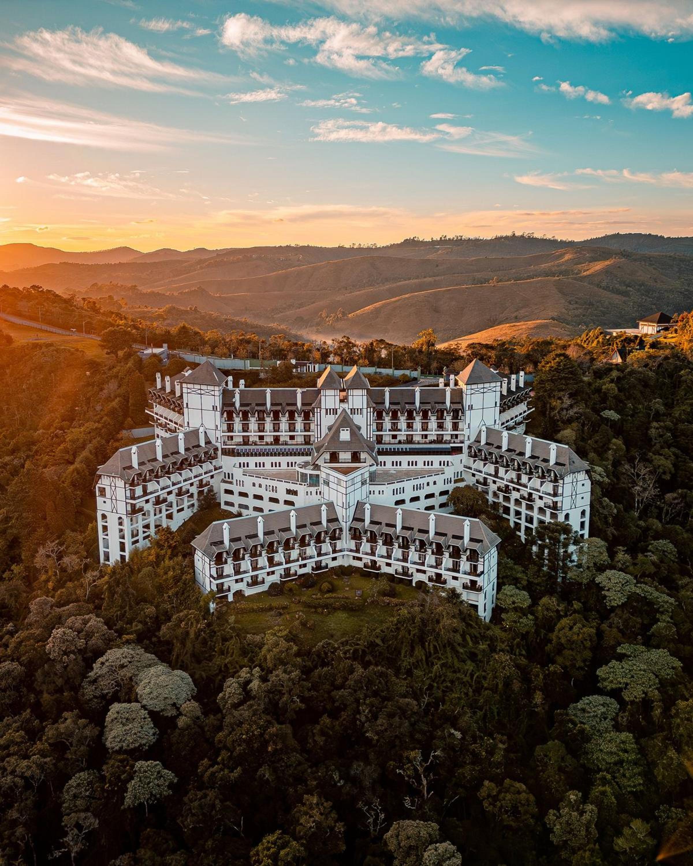 O hotel localizado nas montanhas é lindo, um verdadeiro cartão postal com uma arquitetura bem própria.