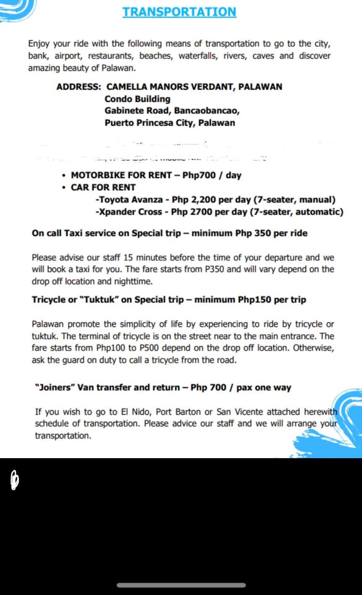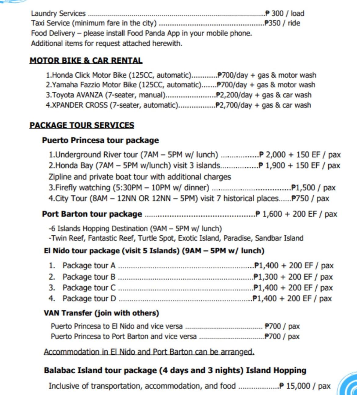 Take advantage of sightseeing tours, bicycle and car rental services to discover nearby attractions like Pristine Beach and Honda Bay. Let us enhance your Puerto Princesa experience with our convenient location and services.