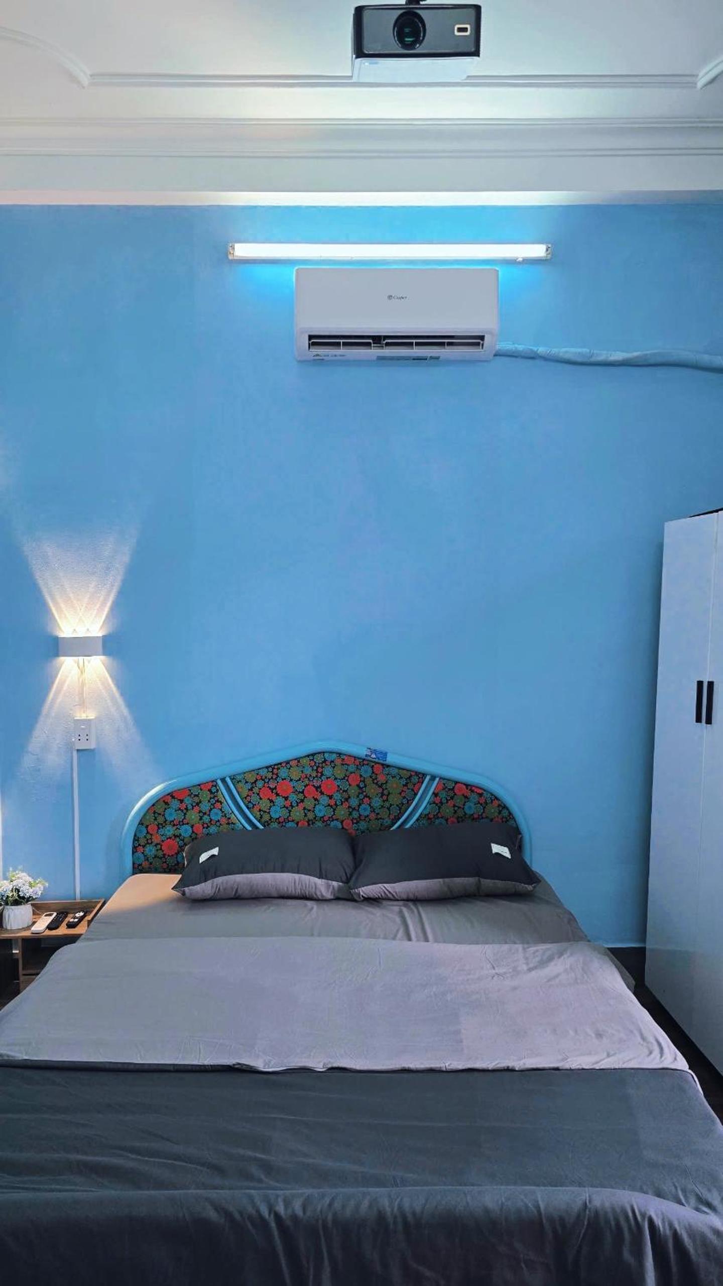 空间挺大的,有阳台风景,房间设备还有投影仪,电风扇空调也都有,甚至还可以做饭
