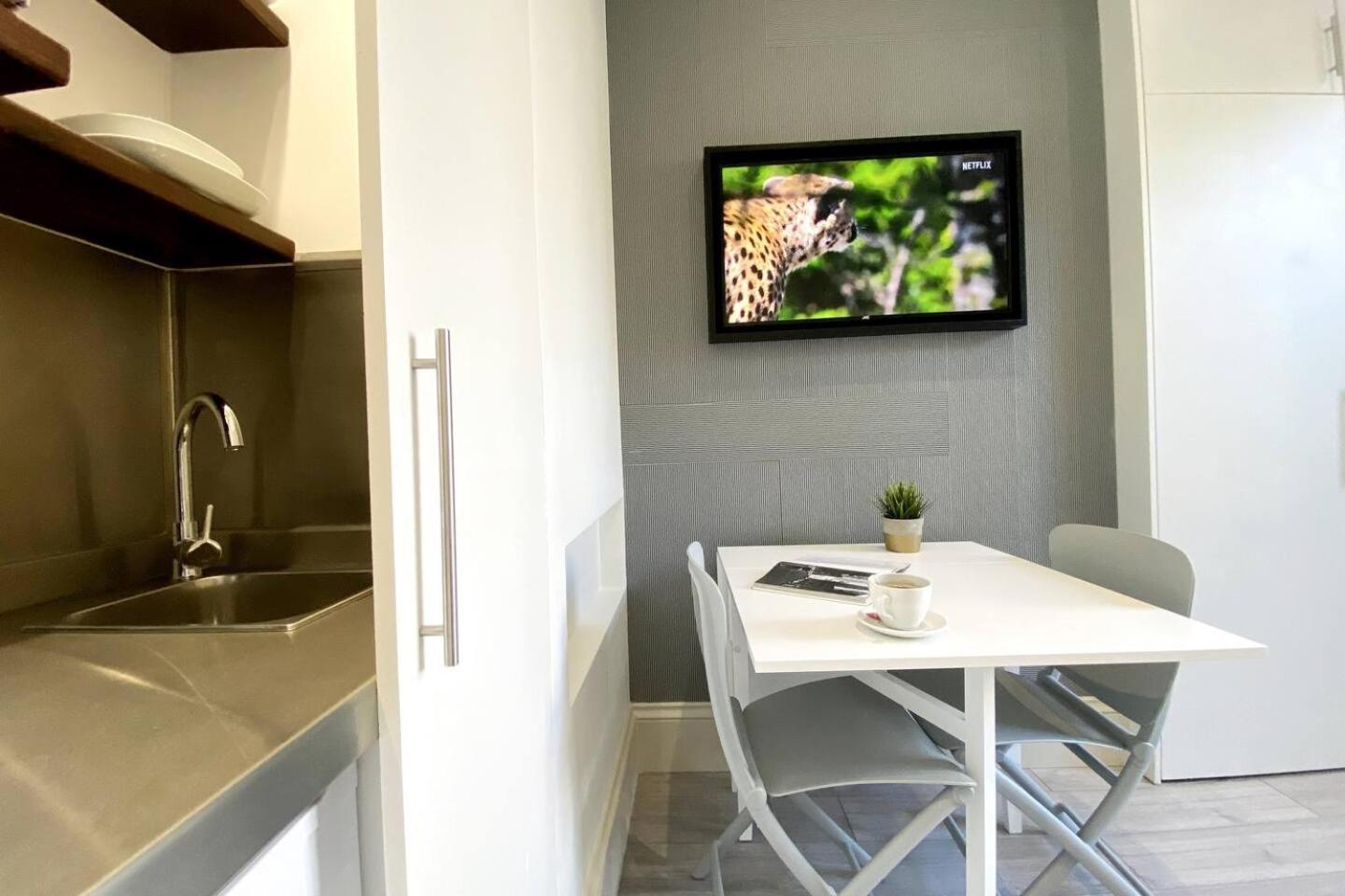 Small studio with great use of space - mini kitchen (equipped with microwave, kettle, coffee/ teas, basic cutlery selection, washing up liquid and dishcloths); pull down bed, sofa bed and small table plus 2 chairs: space is just perfect for my 10 year old son and I; cute shower and toilet facilities. Overall space is cozy for 2 adults.