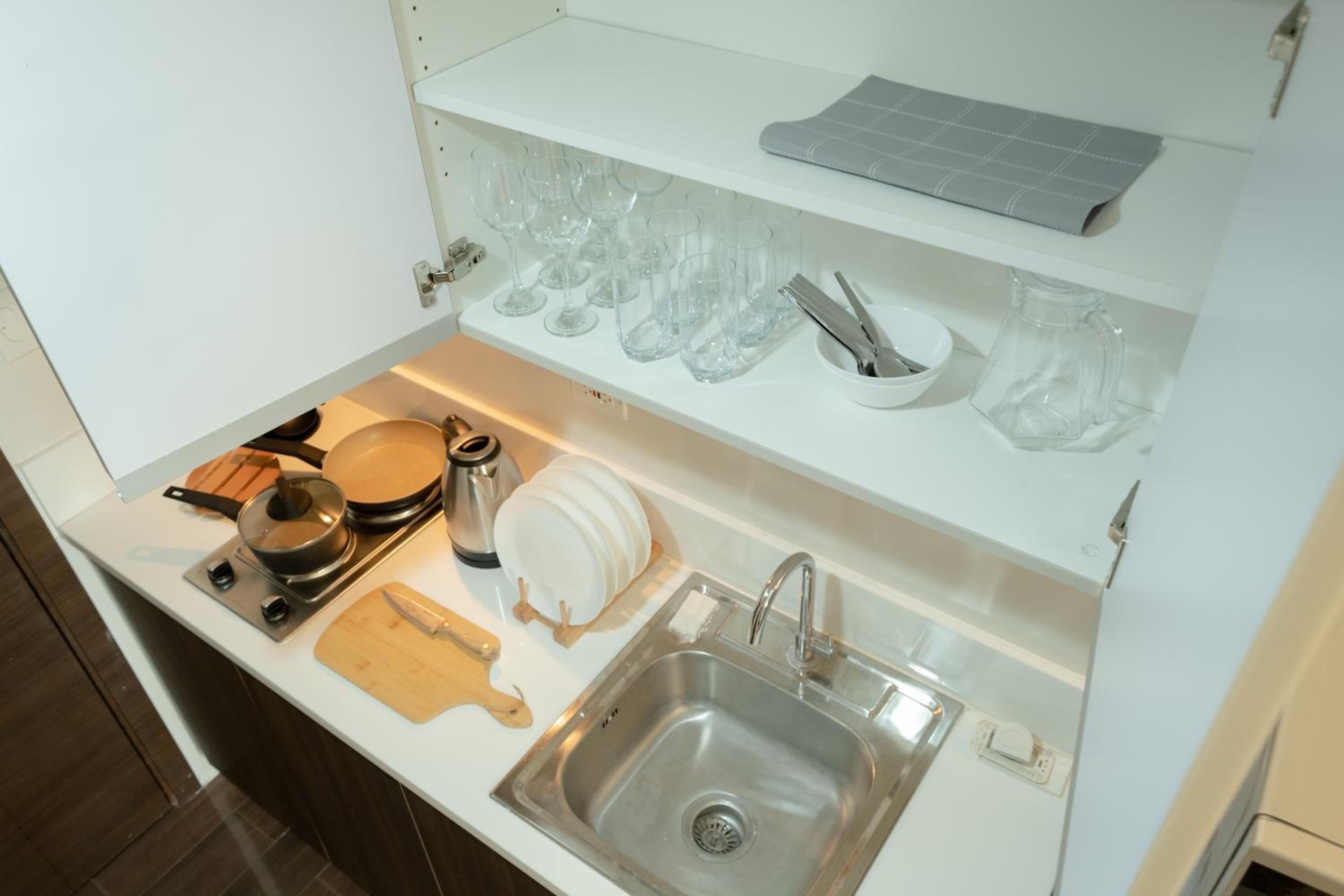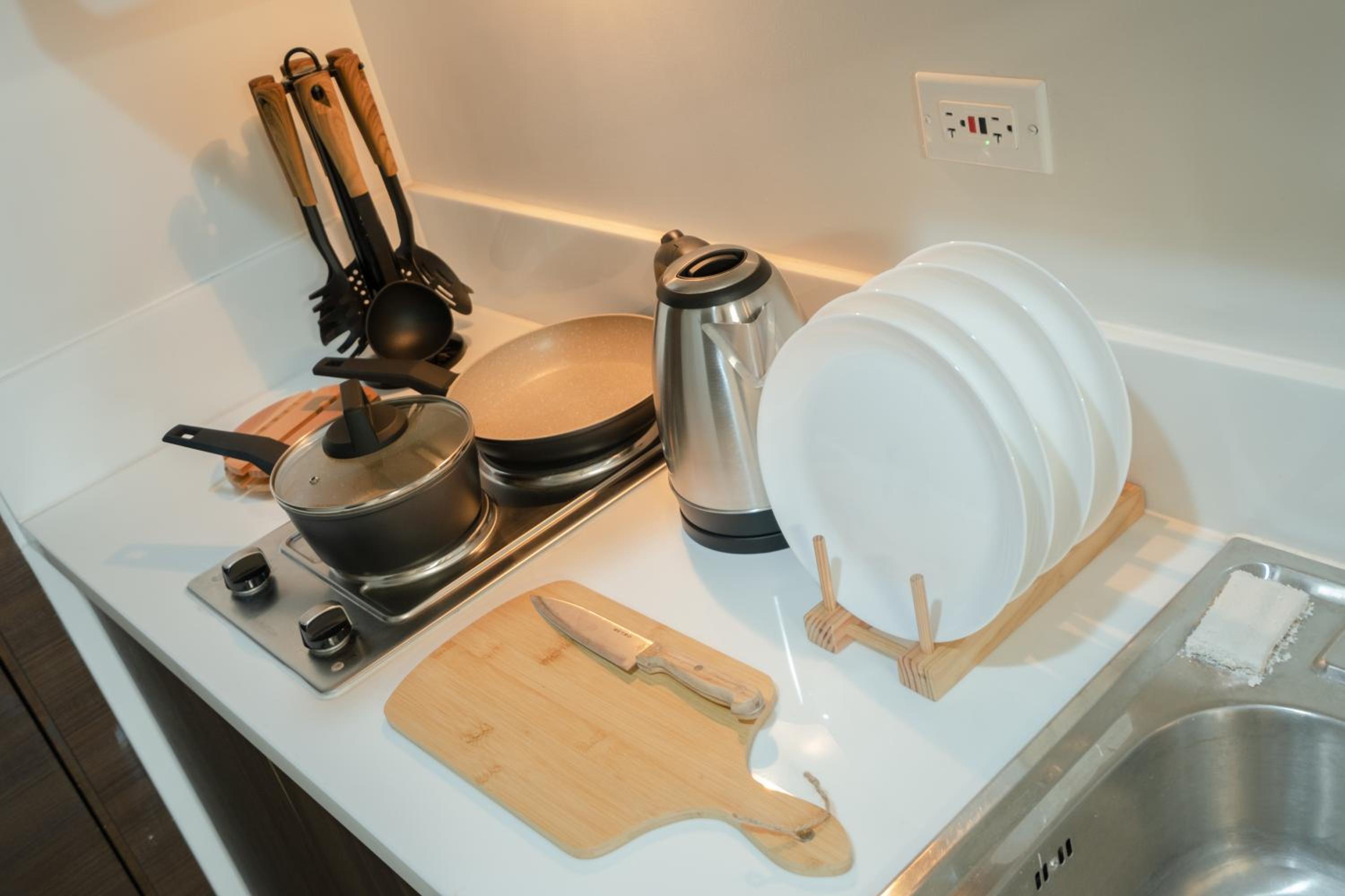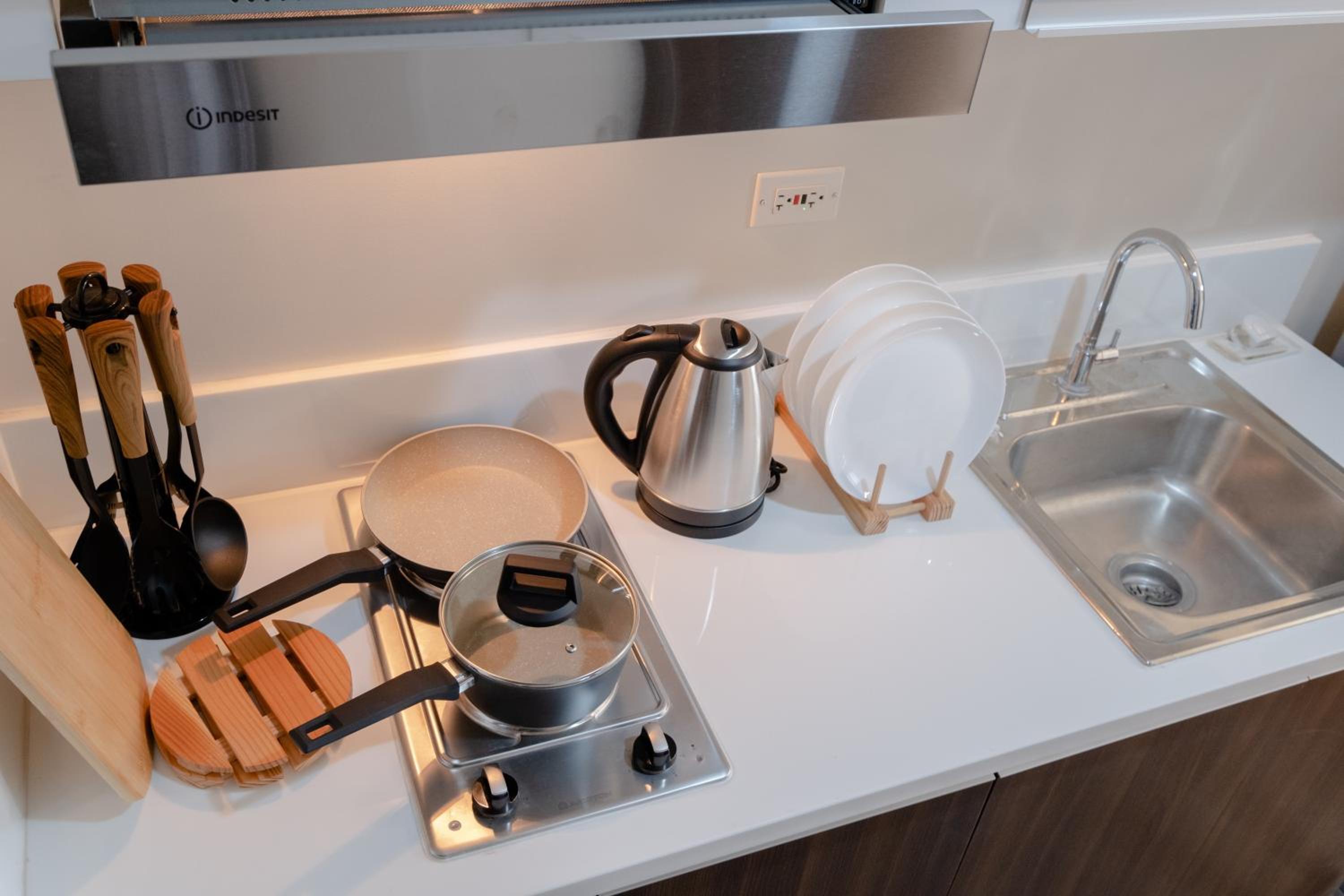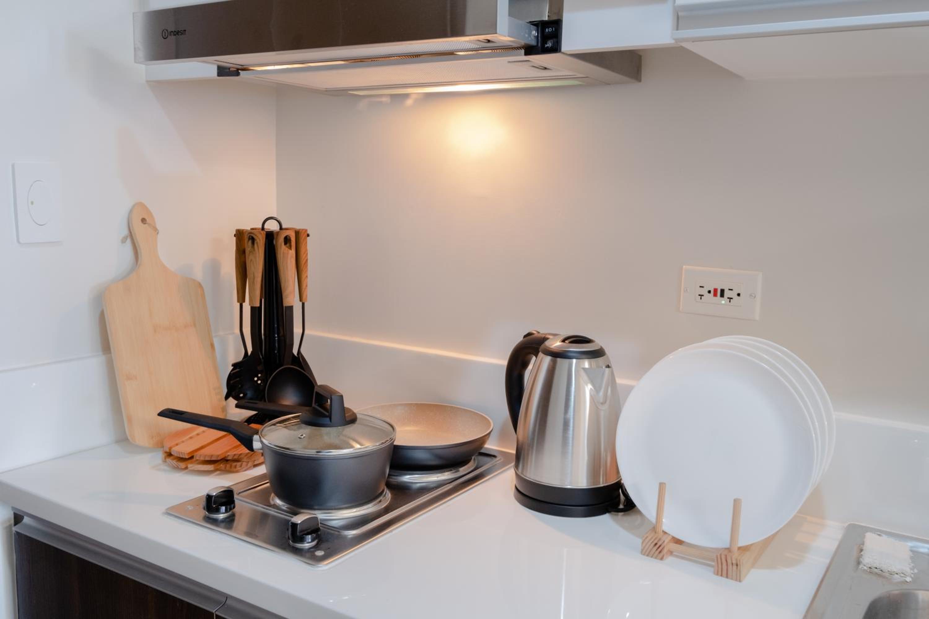 Equipped with a flat-screen TV, kitchen with modern appliances, and a private bathroom with complimentary slippers and a hairdryer.
