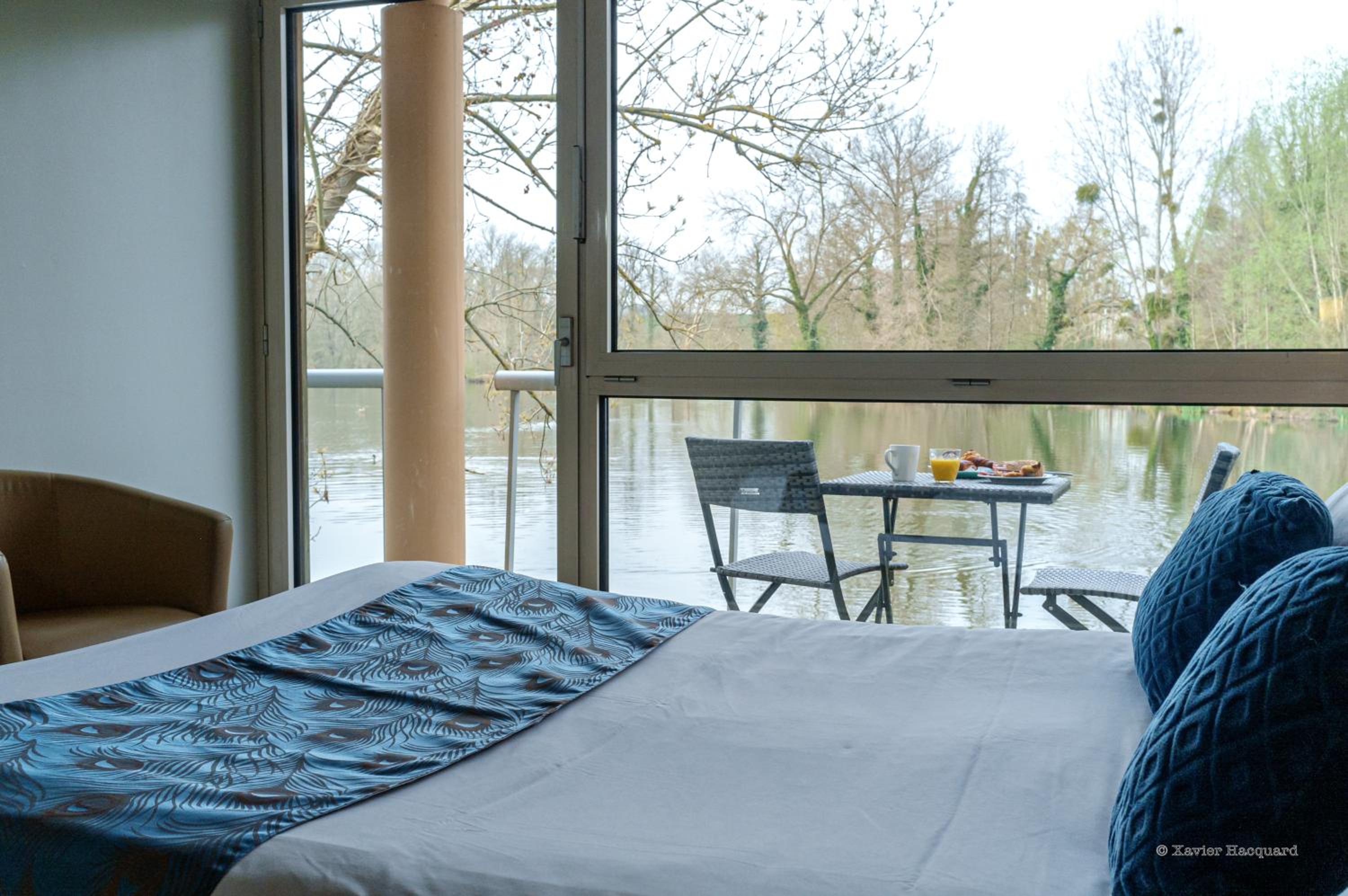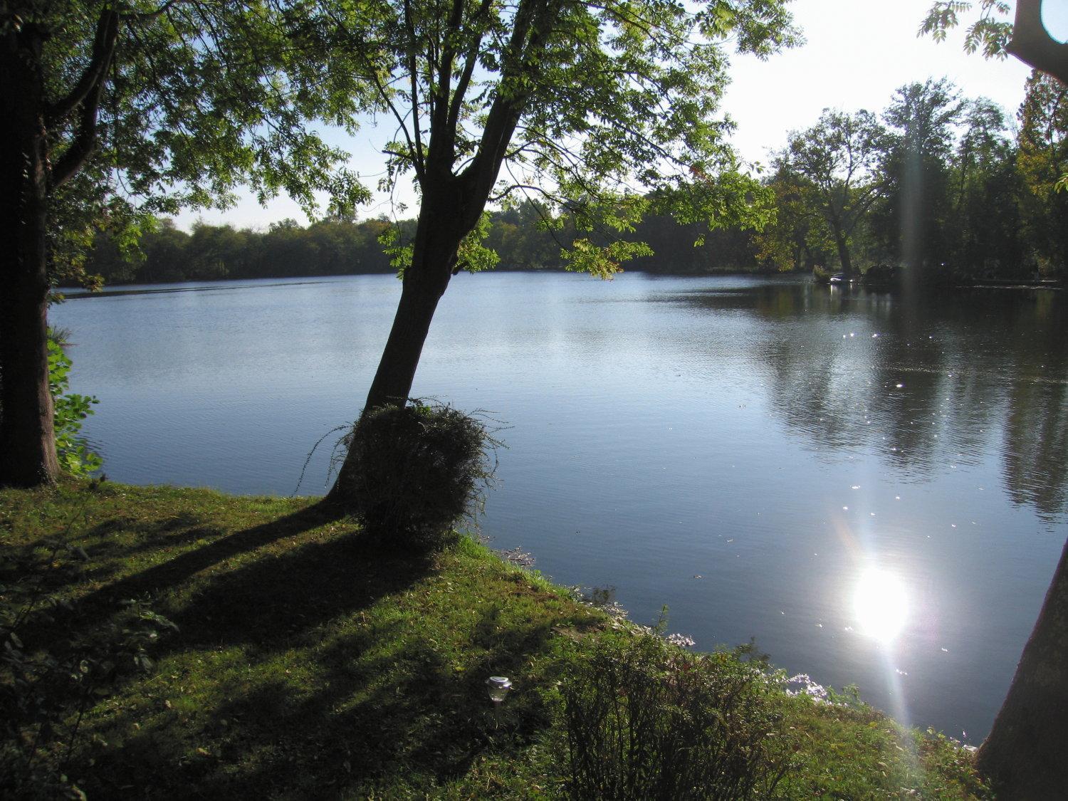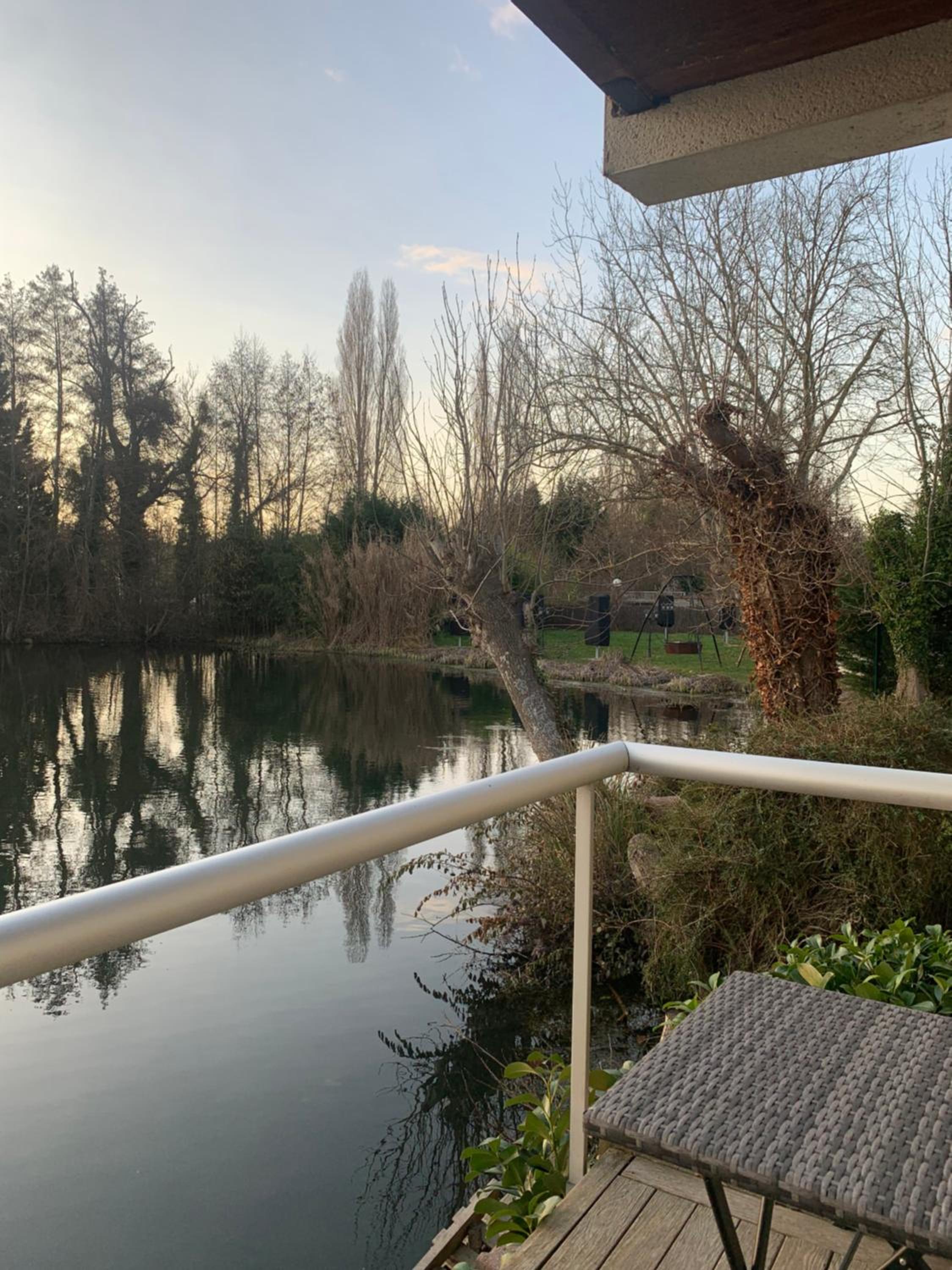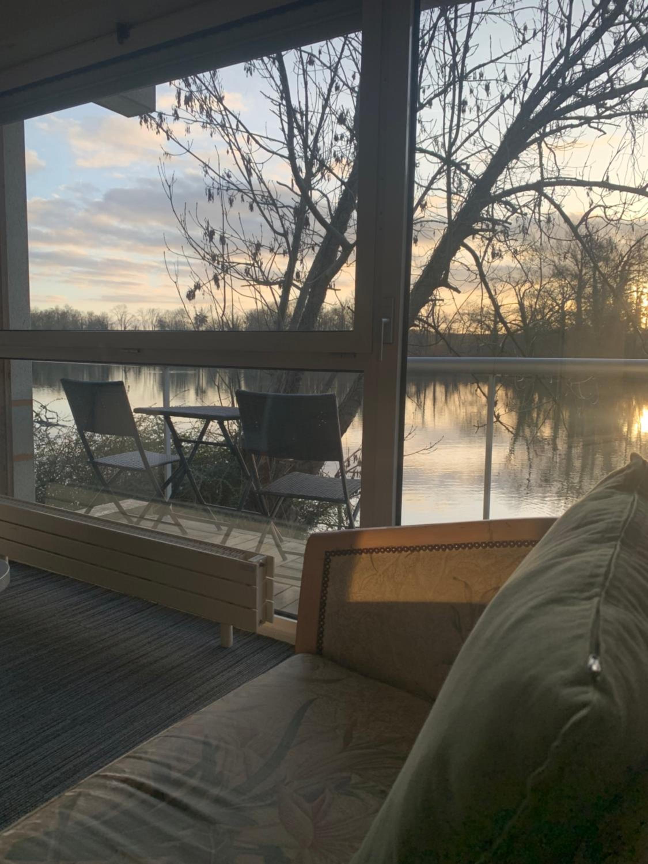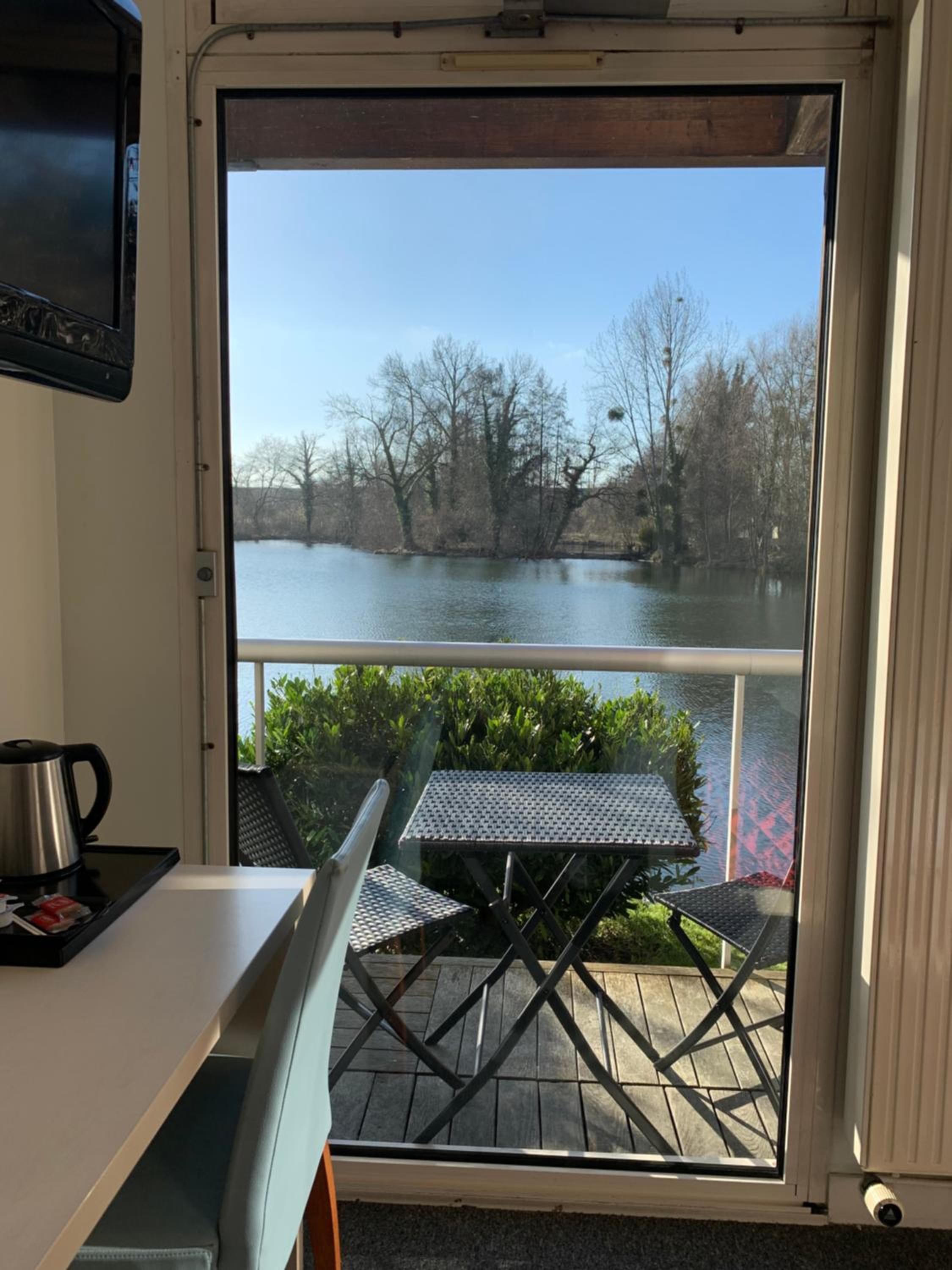 Le cadre depuis notre chambre. Très belle vue sur un étang avec de paisibles cygnes . Chambre lumineuse avec un petit balcon donnant sur l'étang.