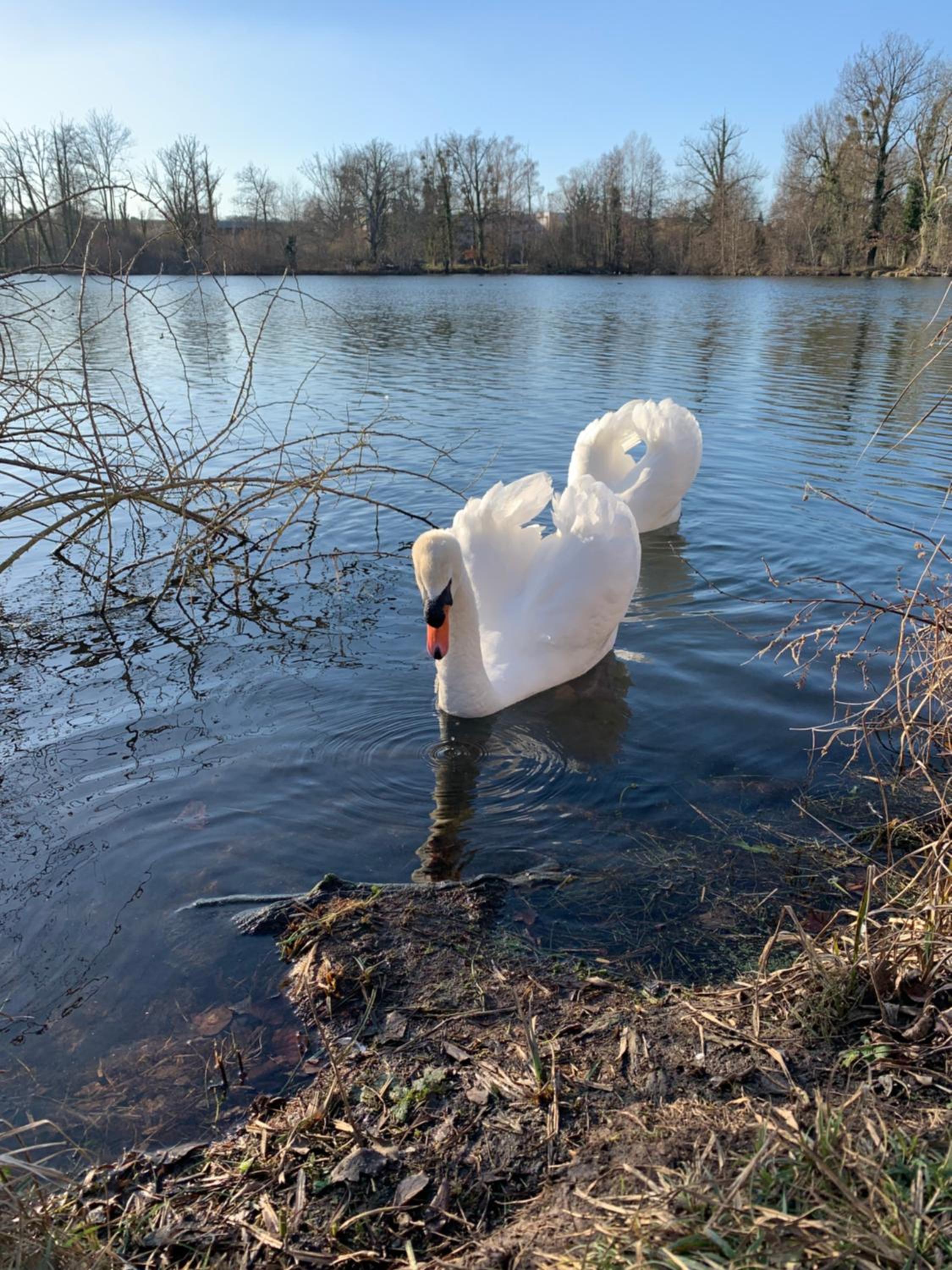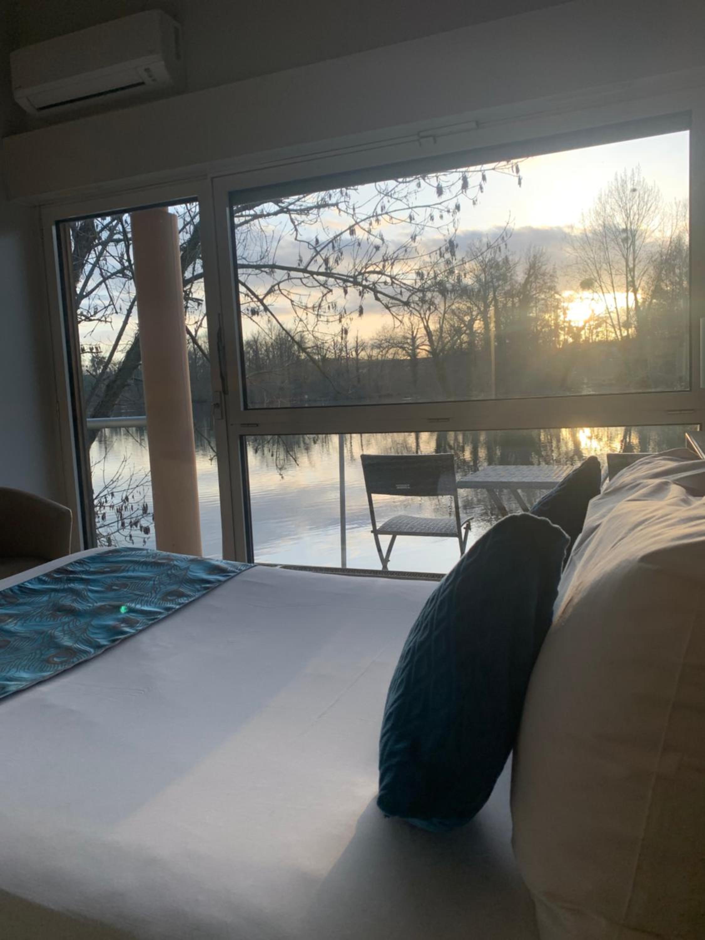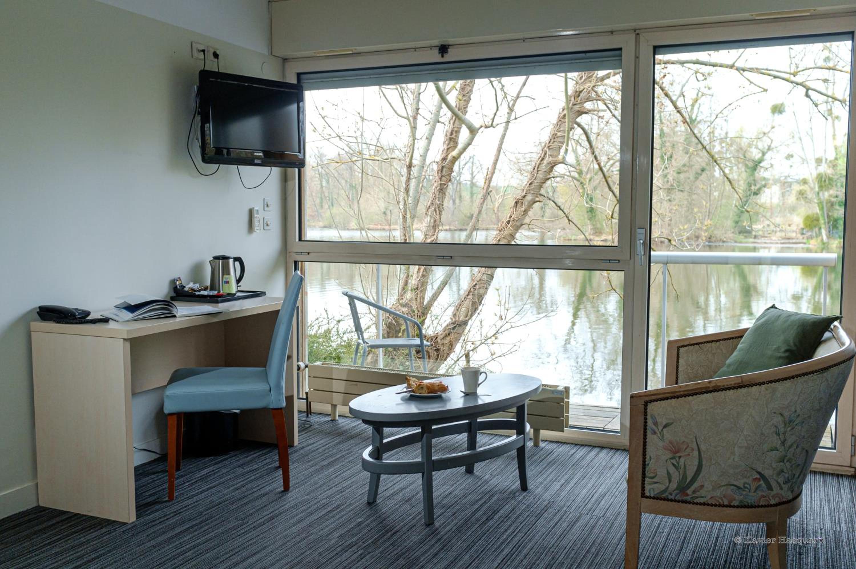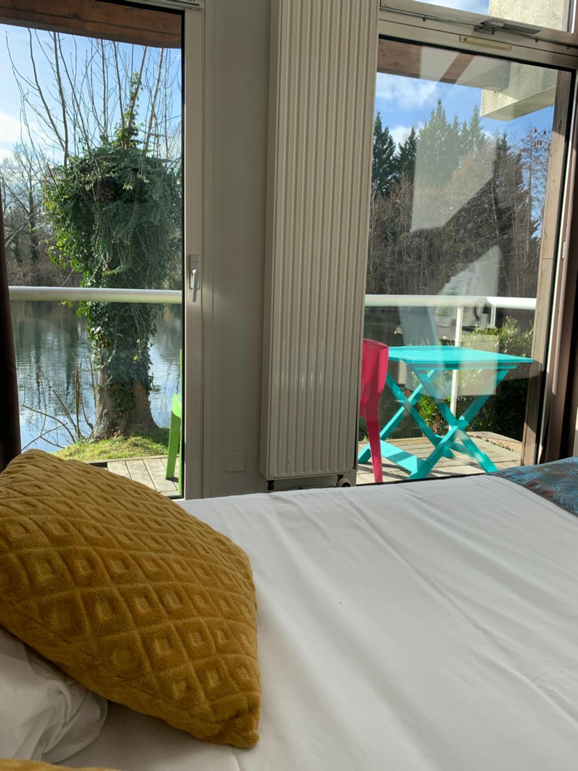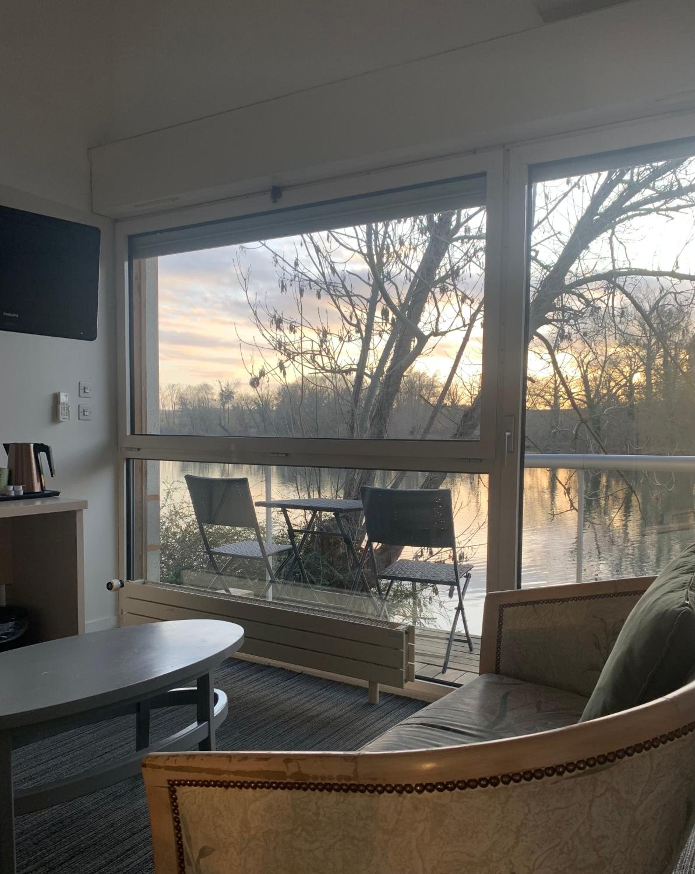 Le cadre depuis notre chambre. Très belle vue sur un étang avec de paisibles cygnes . Chambre lumineuse avec un petit balcon donnant sur l'étang.