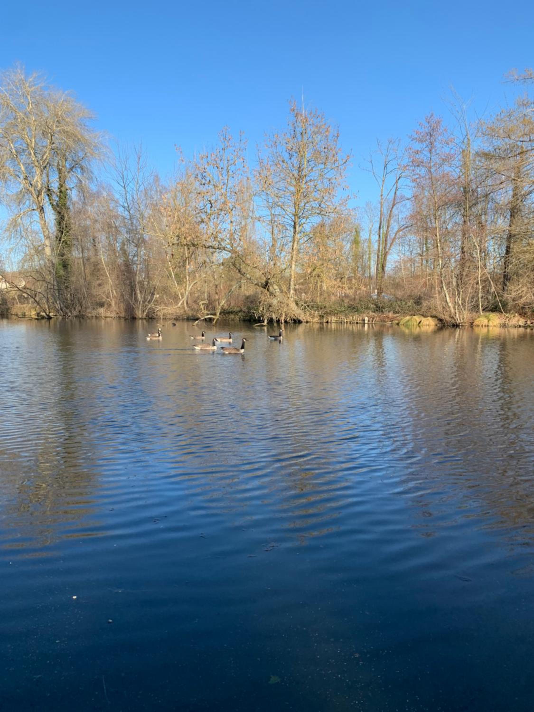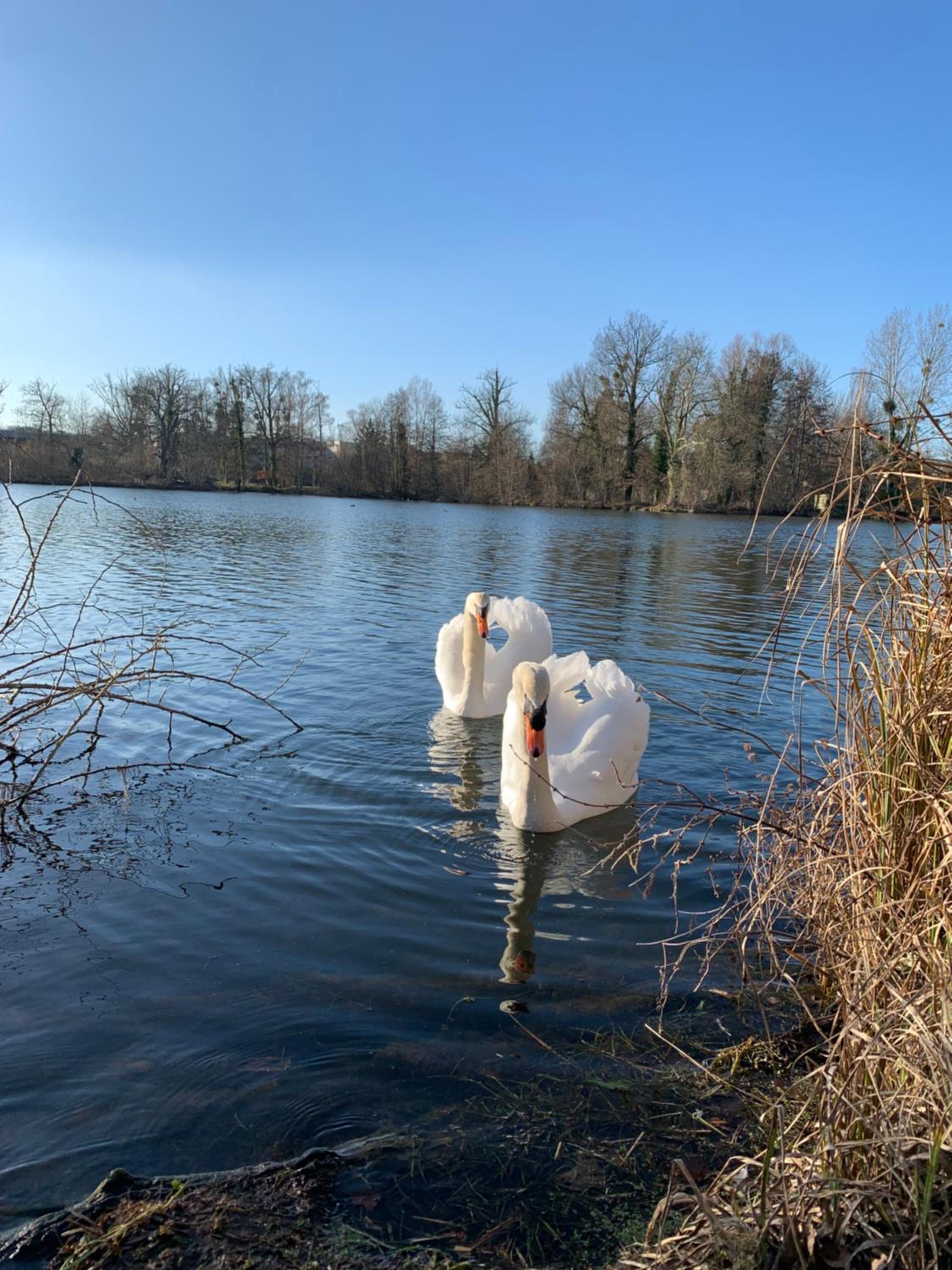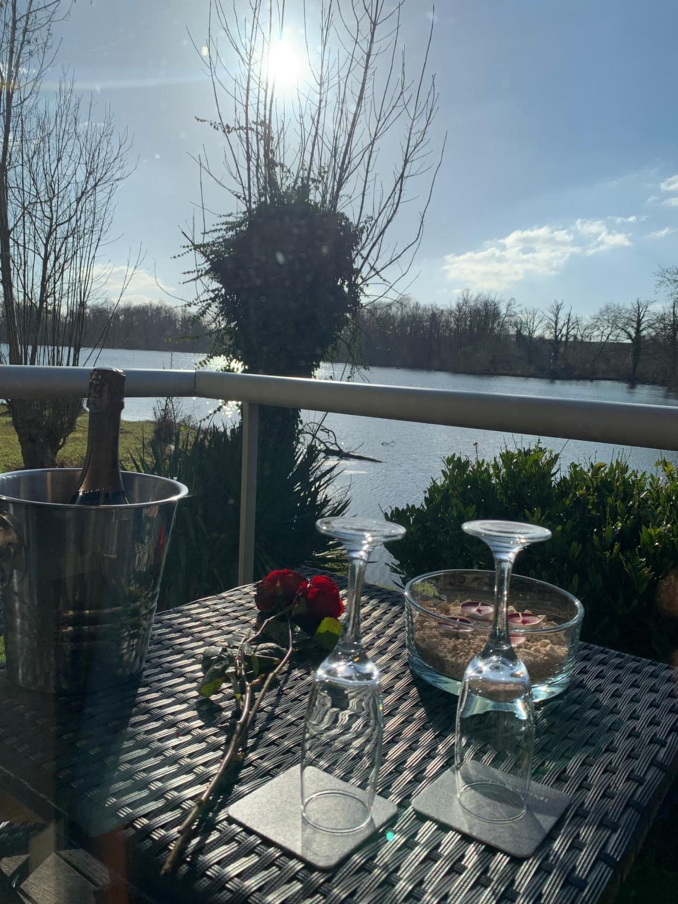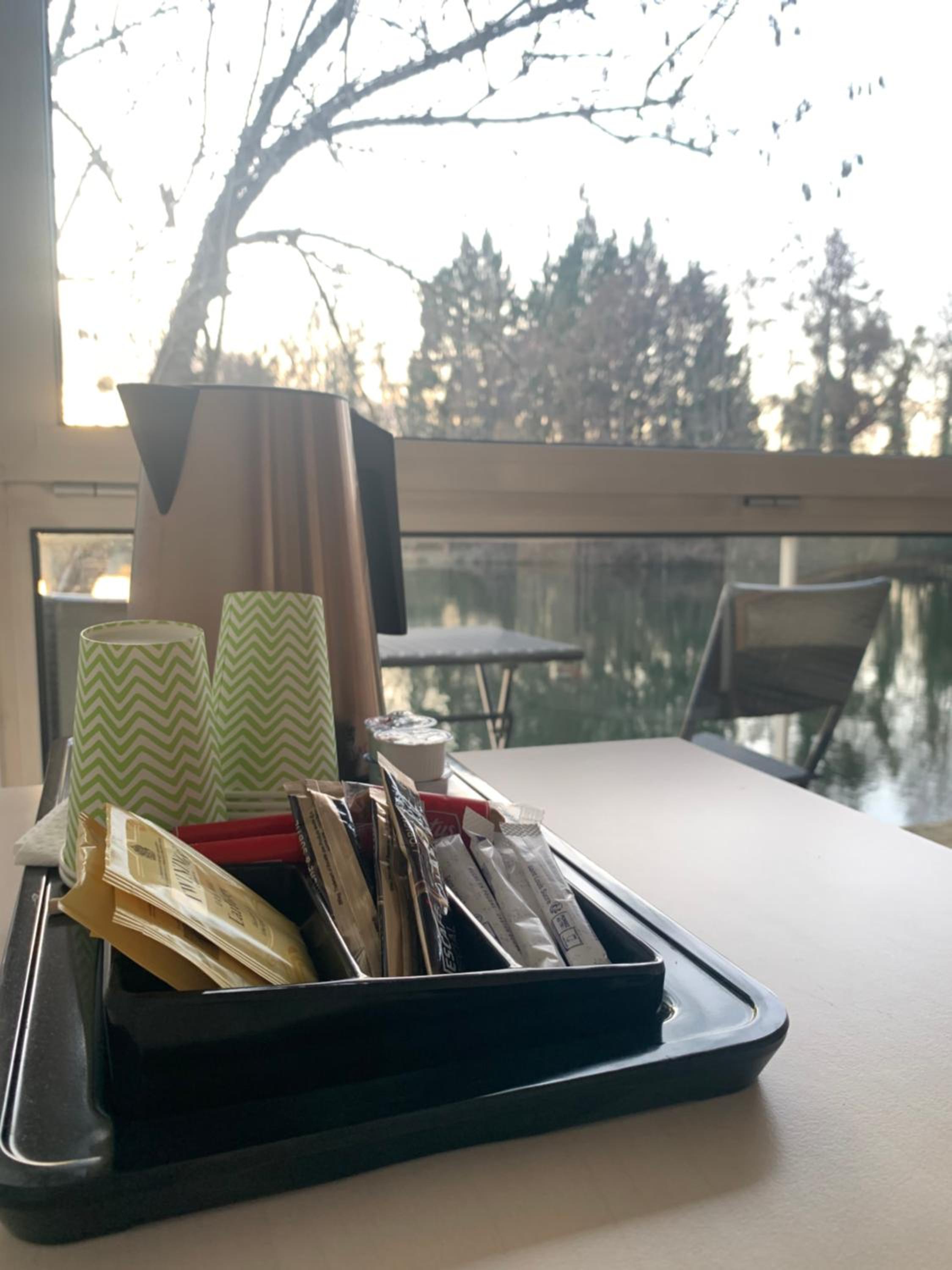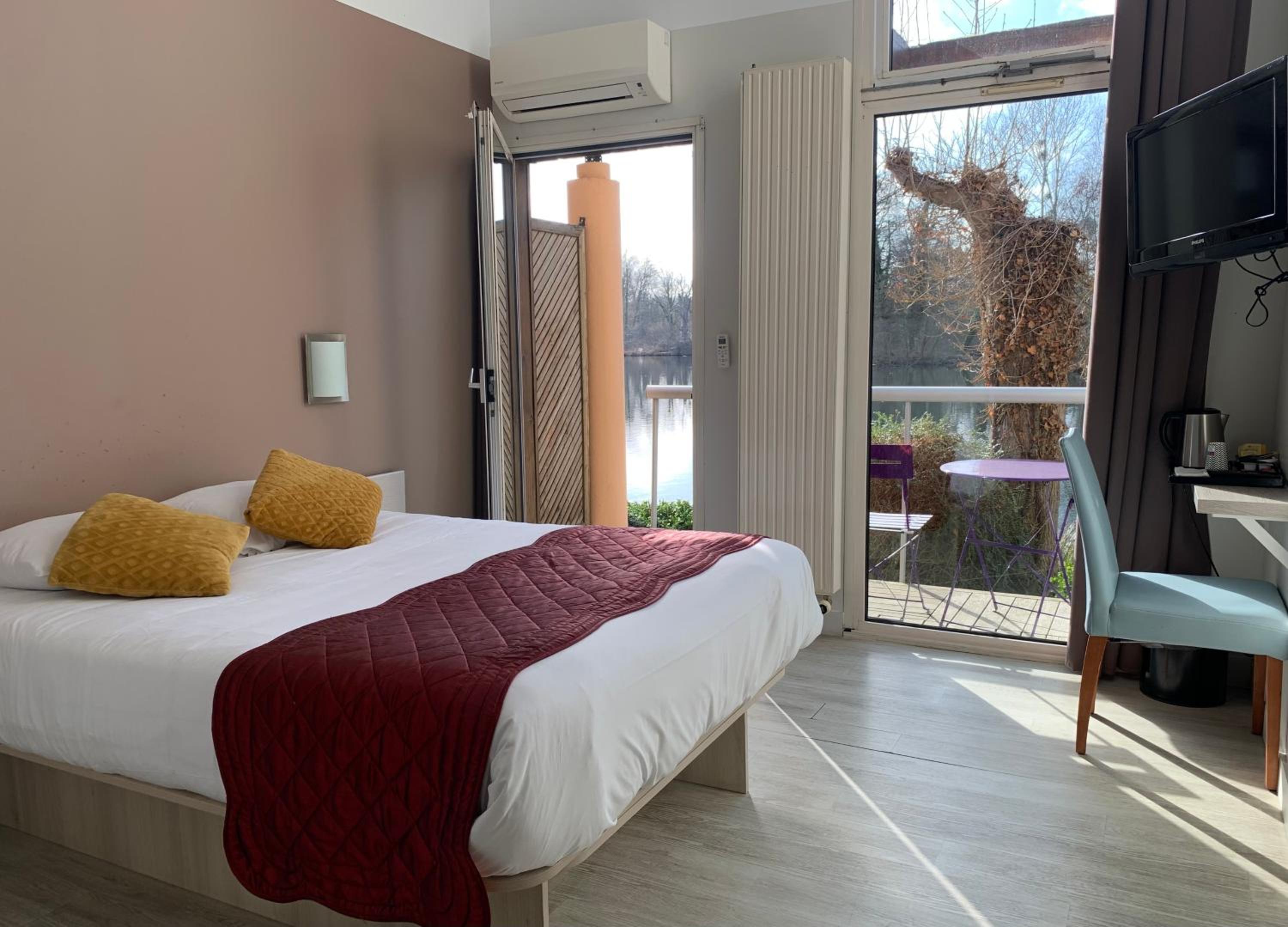Le cadre depuis notre chambre. Très belle vue sur un étang avec de paisibles cygnes . Chambre lumineuse avec un petit balcon donnant sur l'étang.