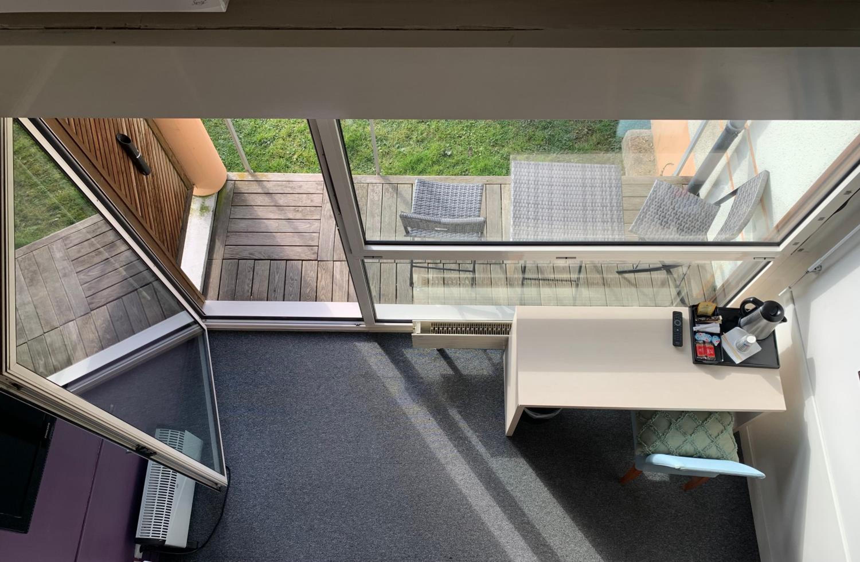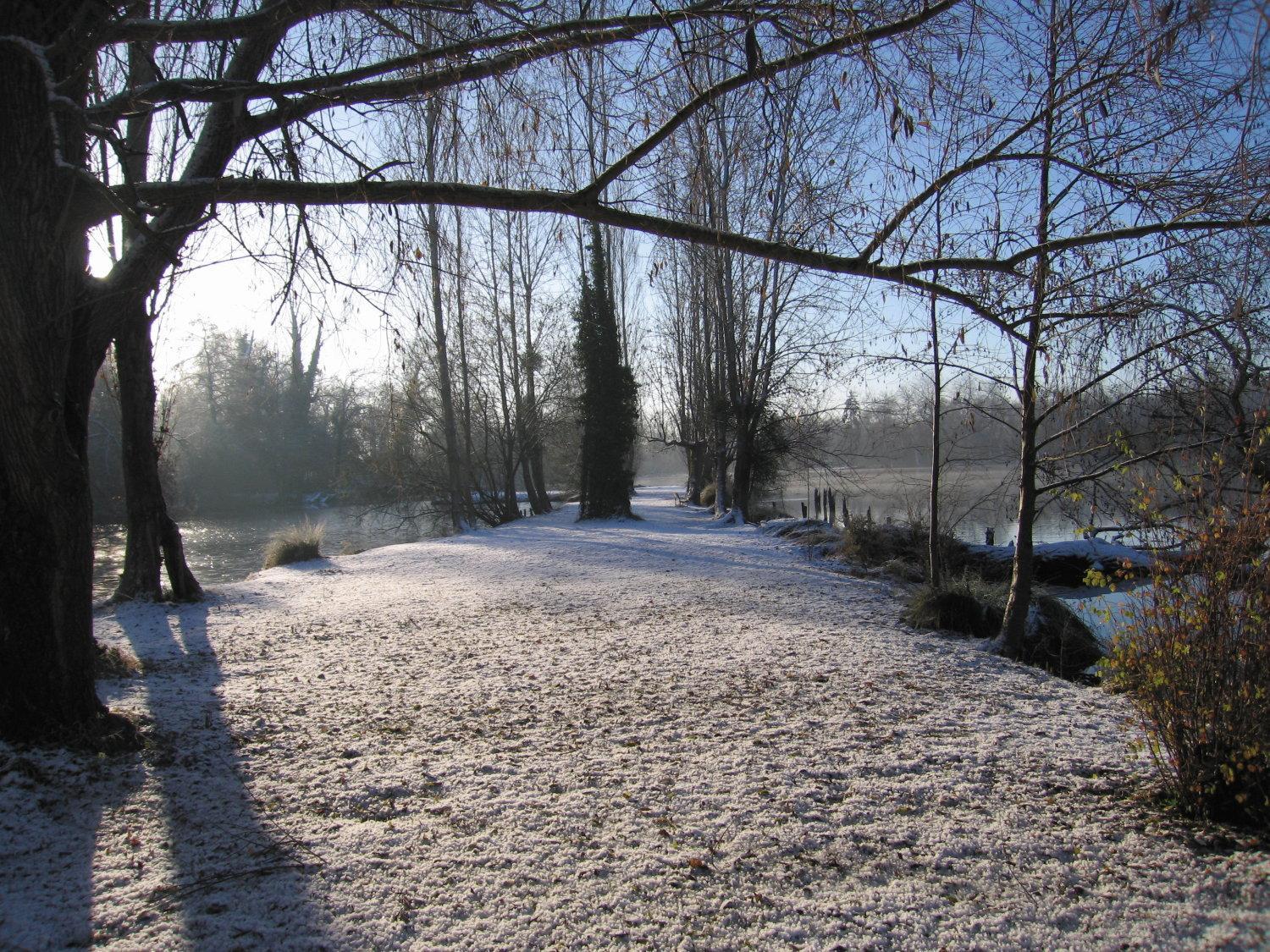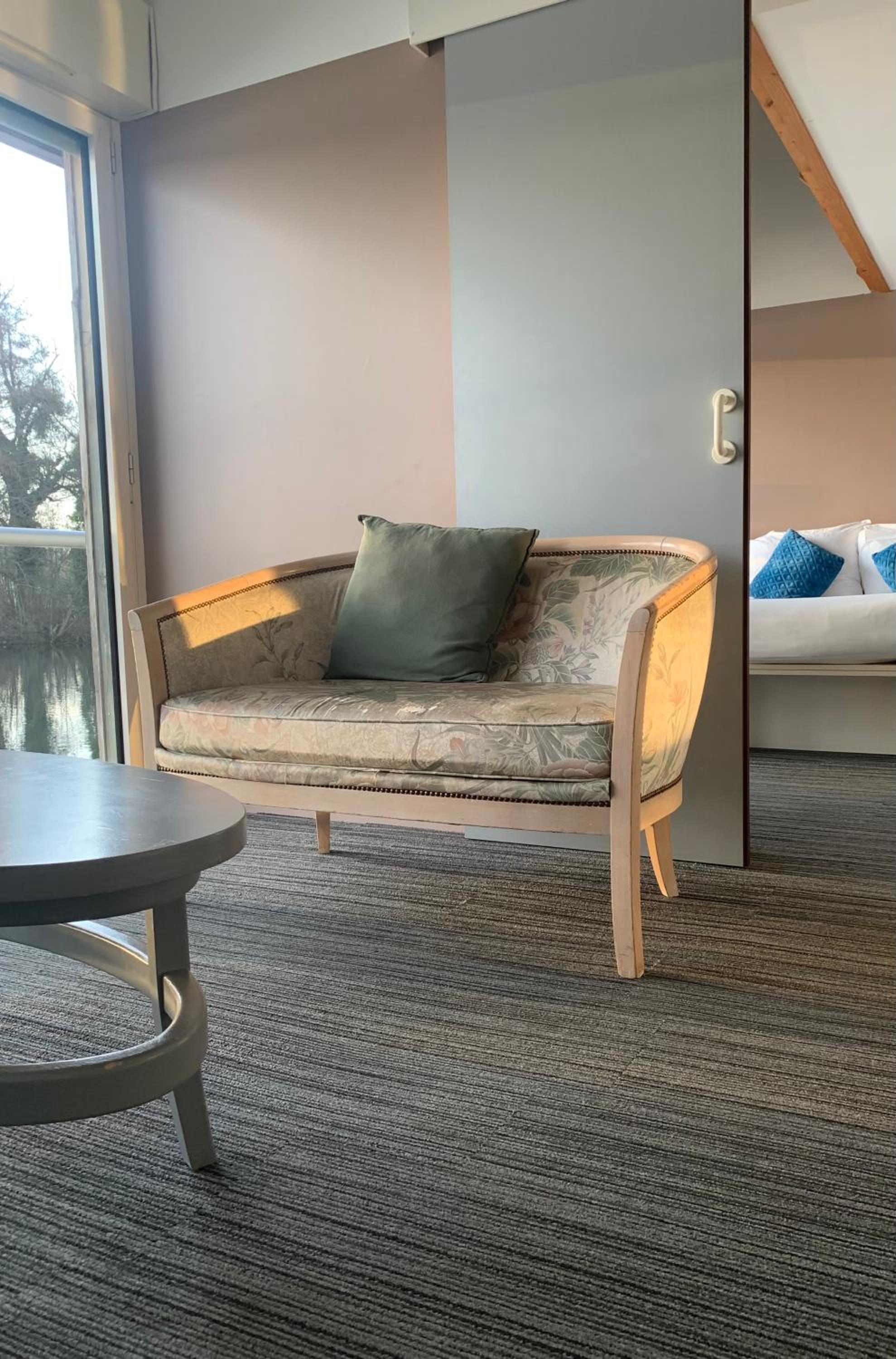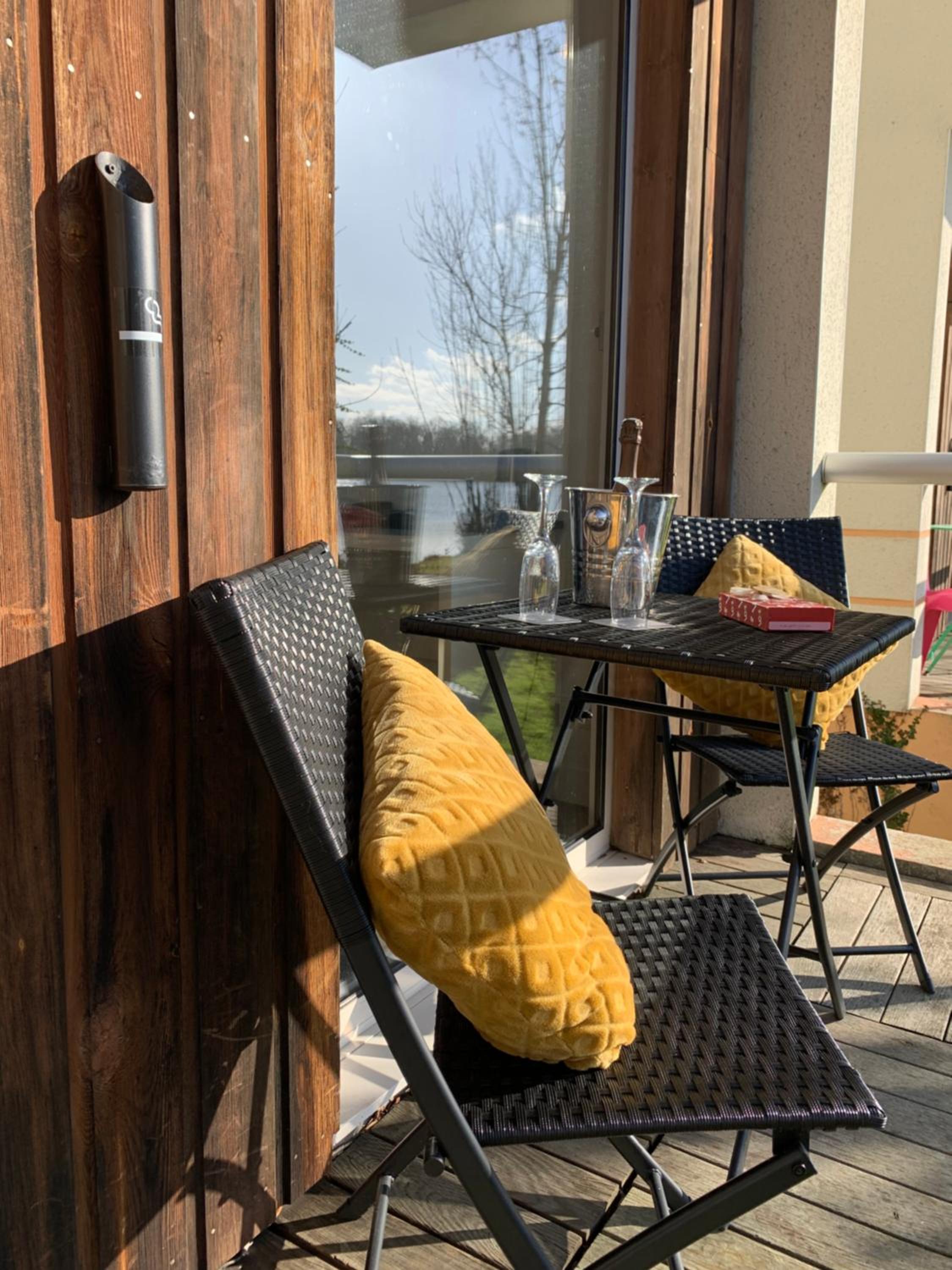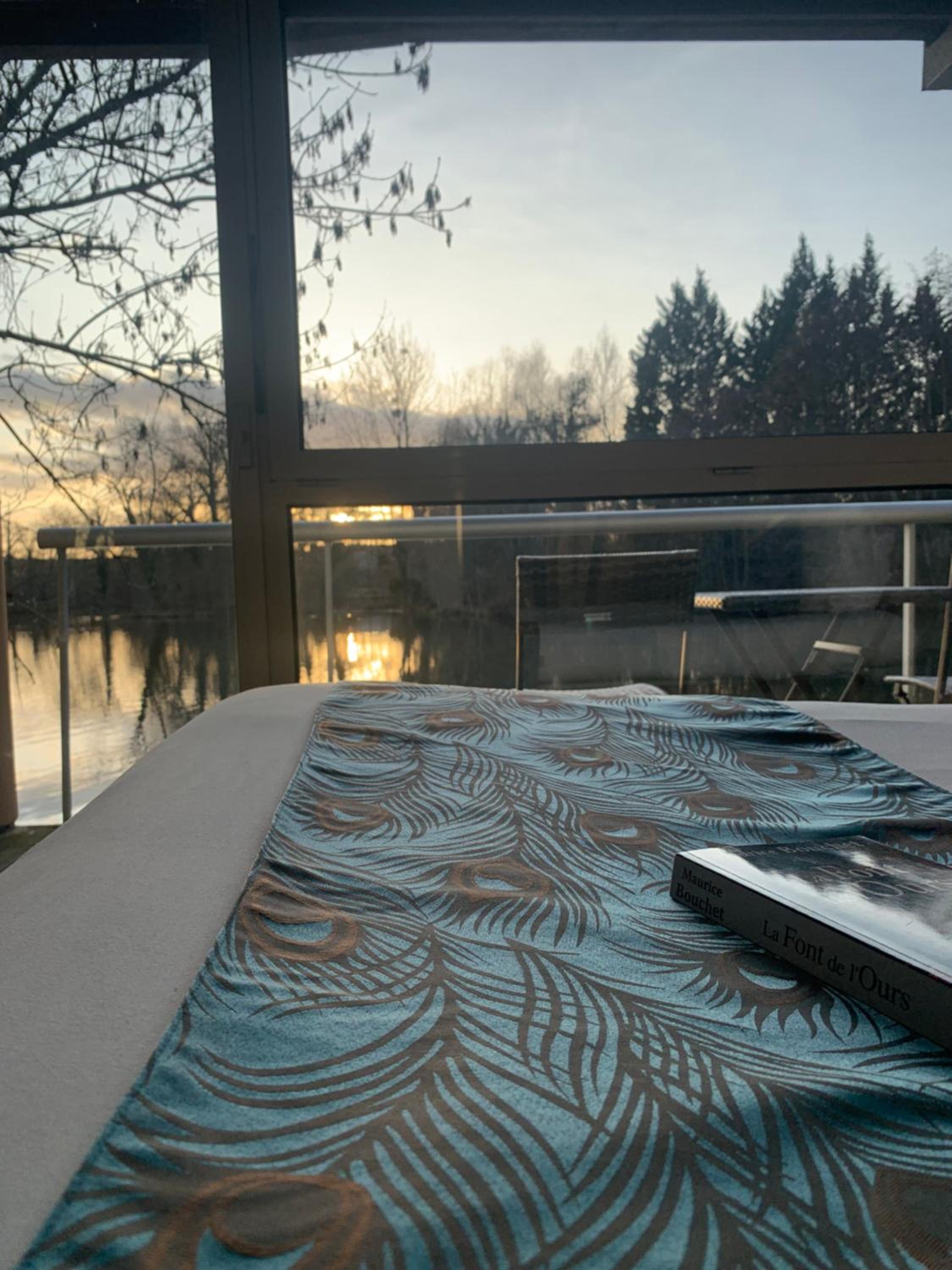Le cadre depuis notre chambre. Très belle vue sur un étang avec de paisibles cygnes . Chambre lumineuse avec un petit balcon donnant sur l'étang.