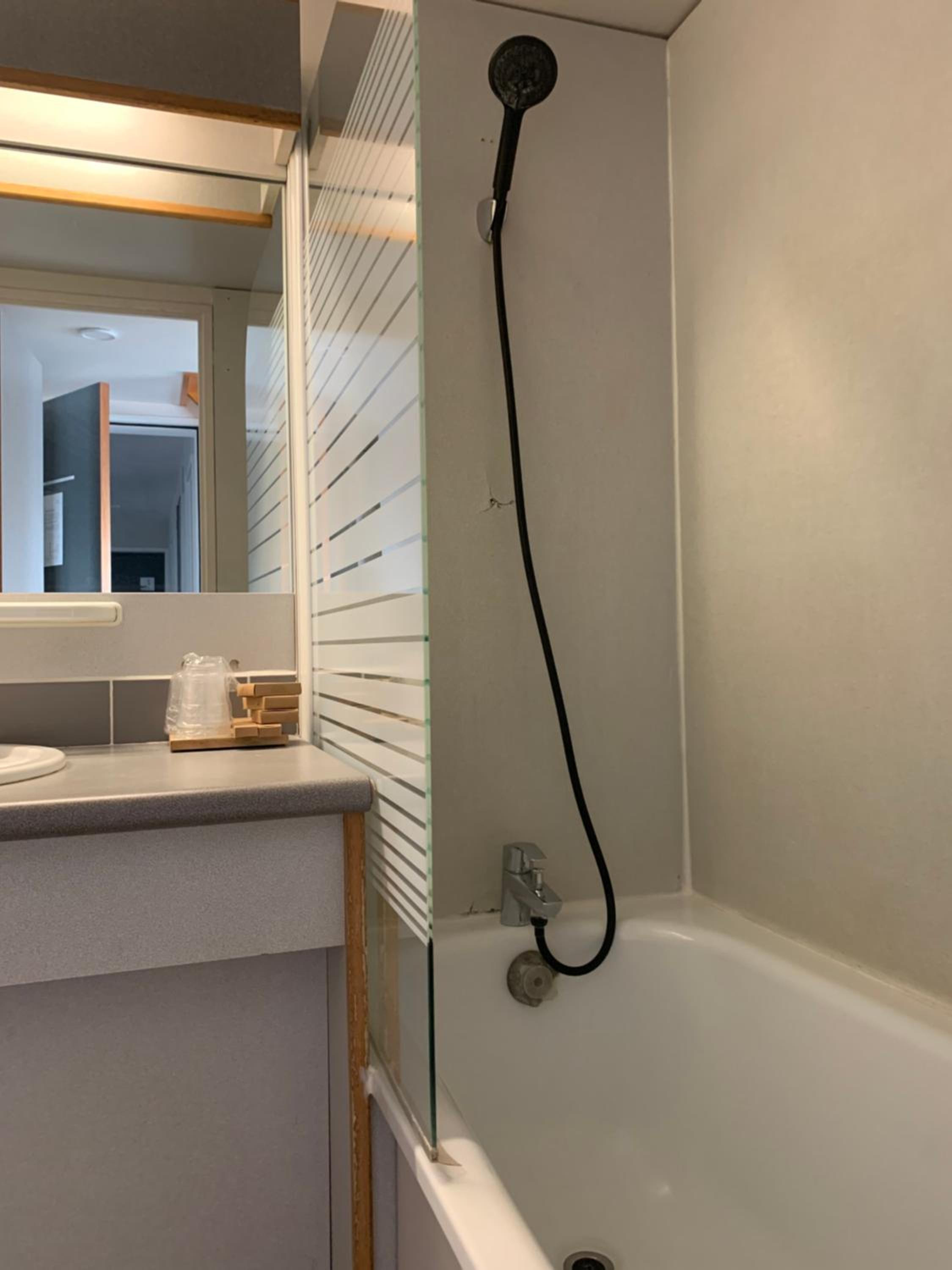 salle de bain vieillotte, toilette pas top net pomme de douche non fixable au mur fixation TV trop haute non orientable vers le bas