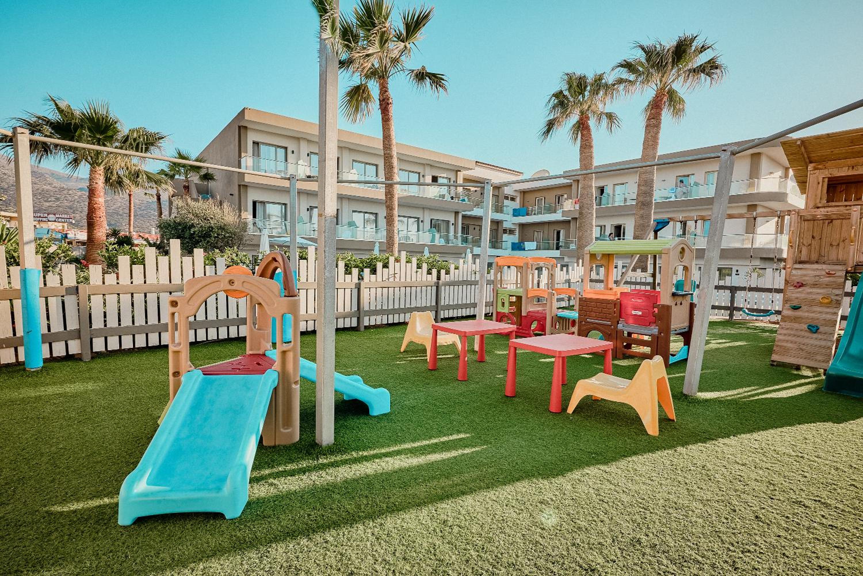 With separate children's pool and playground, Malia Bay ensures a fun stay for younger guests. Parents can unwind on sun beds while kids play. The buffet restaurant with garden views caters to all tastes, and the bars offer refreshing drinks.