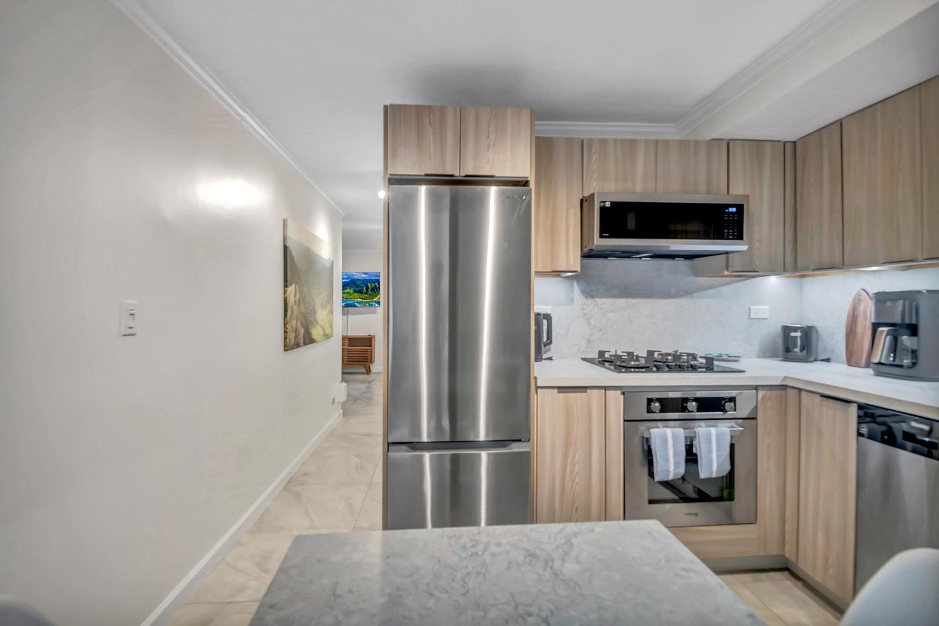 Our spacious design studio features a fully equipped kitchen, flat-screen TV, dining area, and plush bed linens for a comfortable and enjoyable stay.
