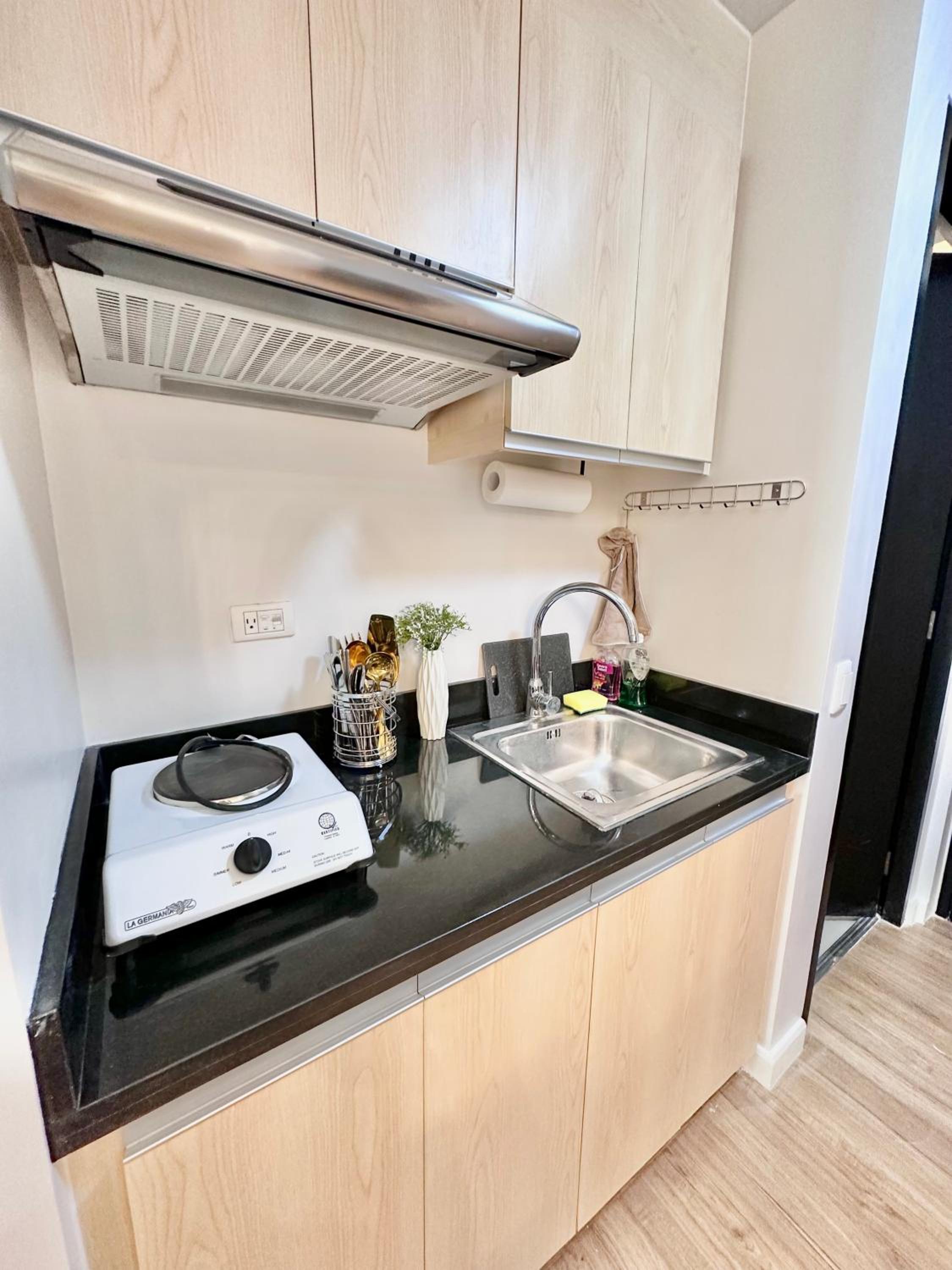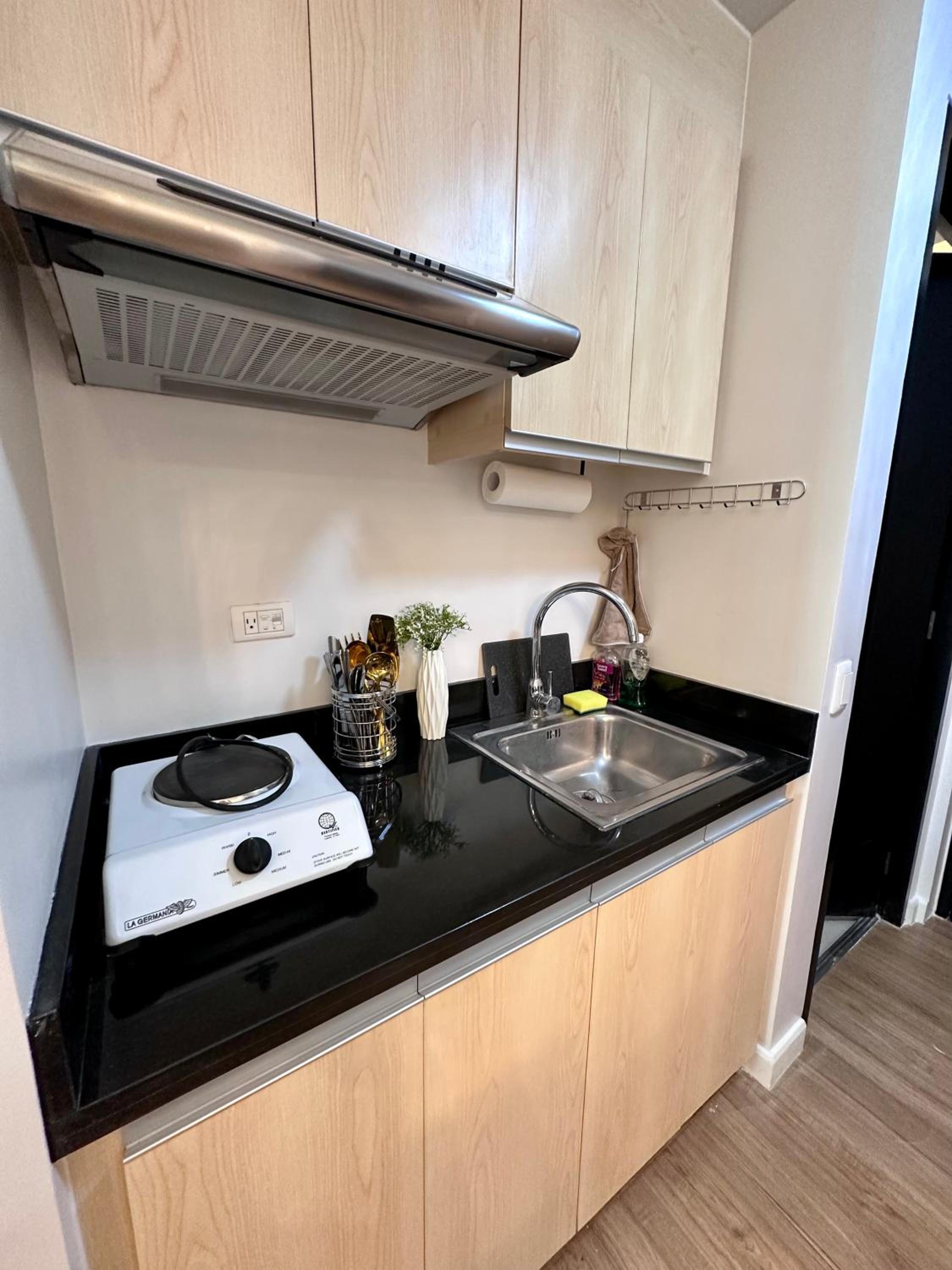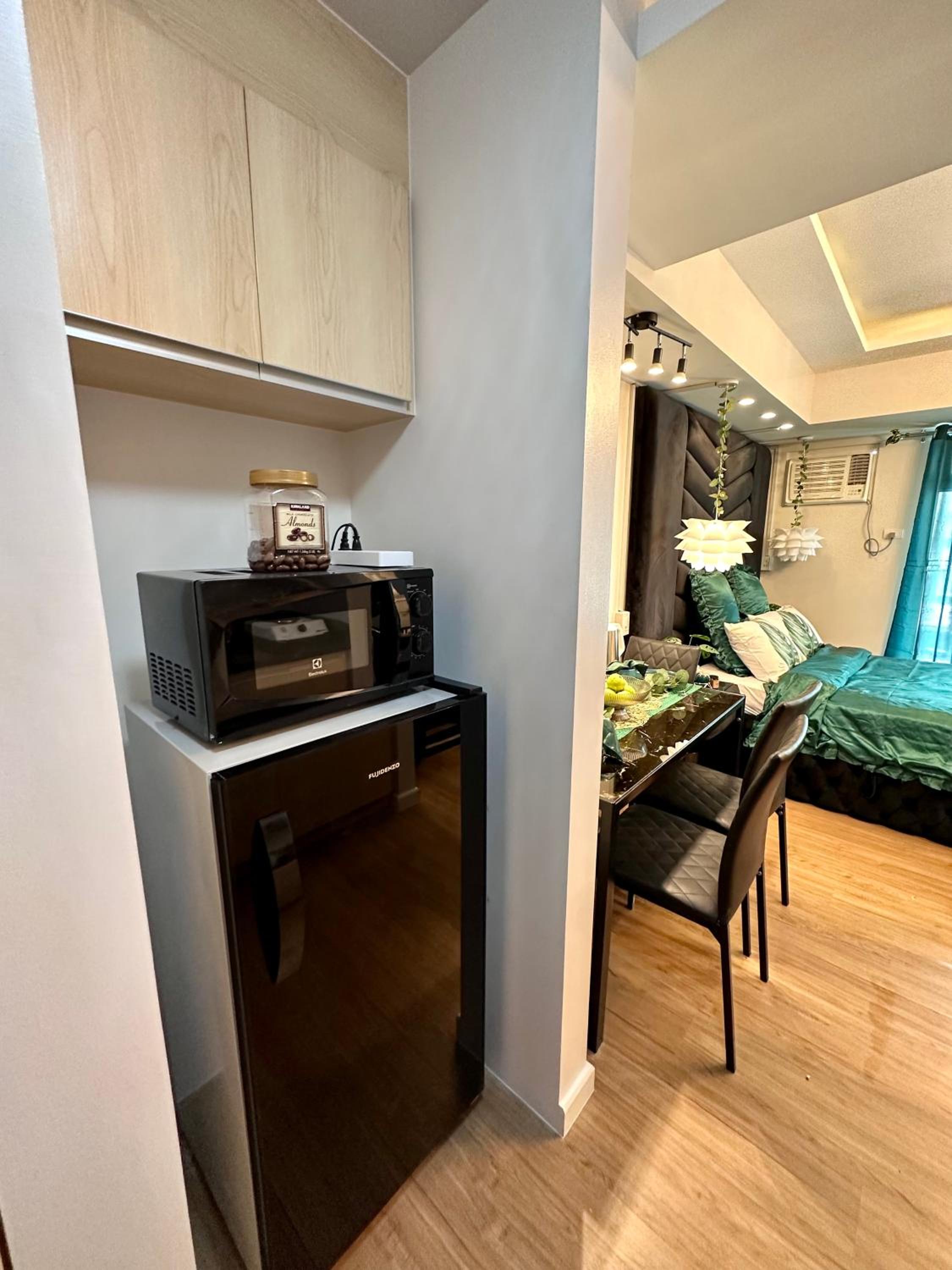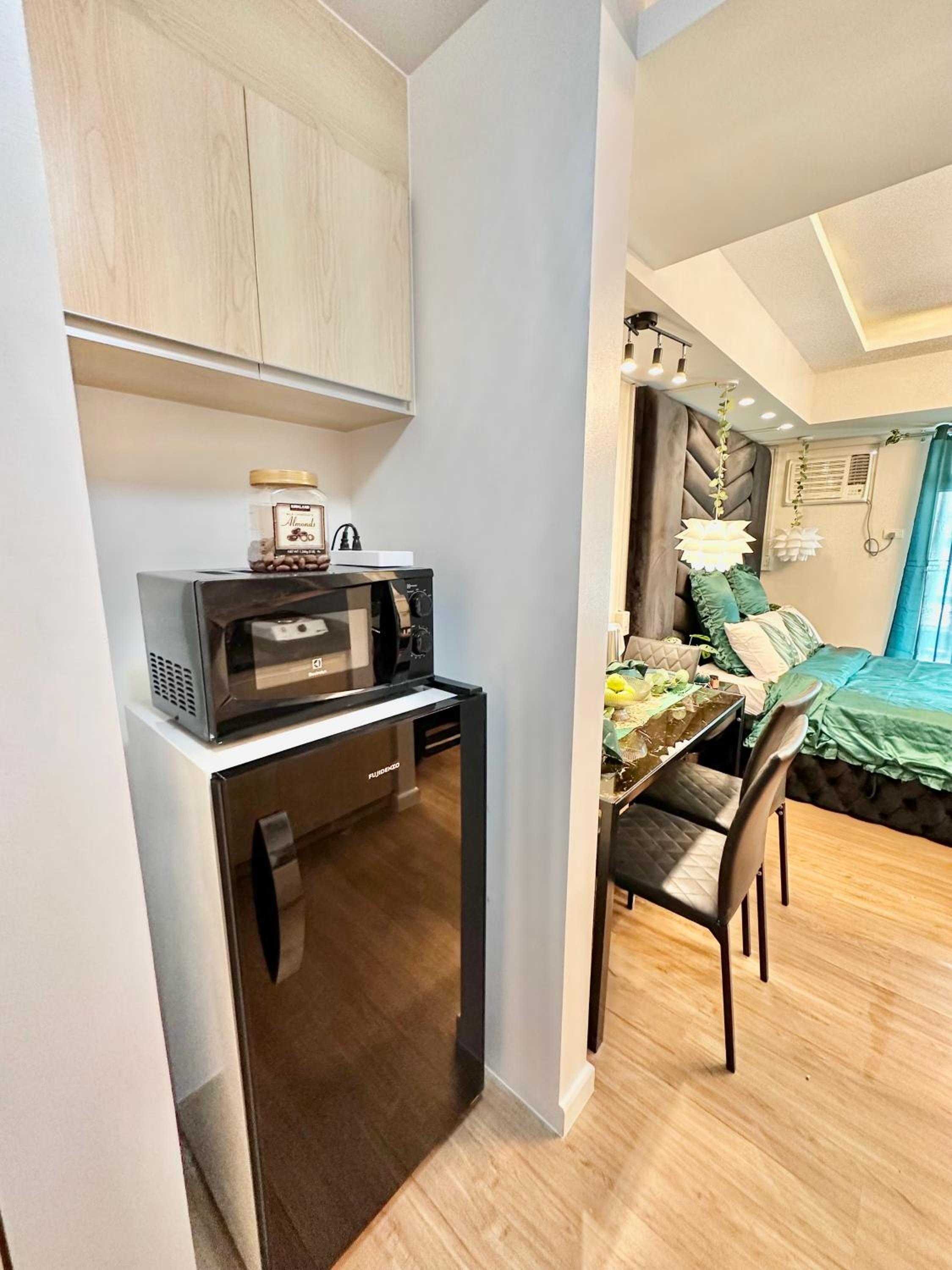 Queen Size Studio in Solinea, Cebu City offers a stylish and comfortable stay with city views, a kitchen with modern amenities, and a private bathroom with bathrobes and slippers.