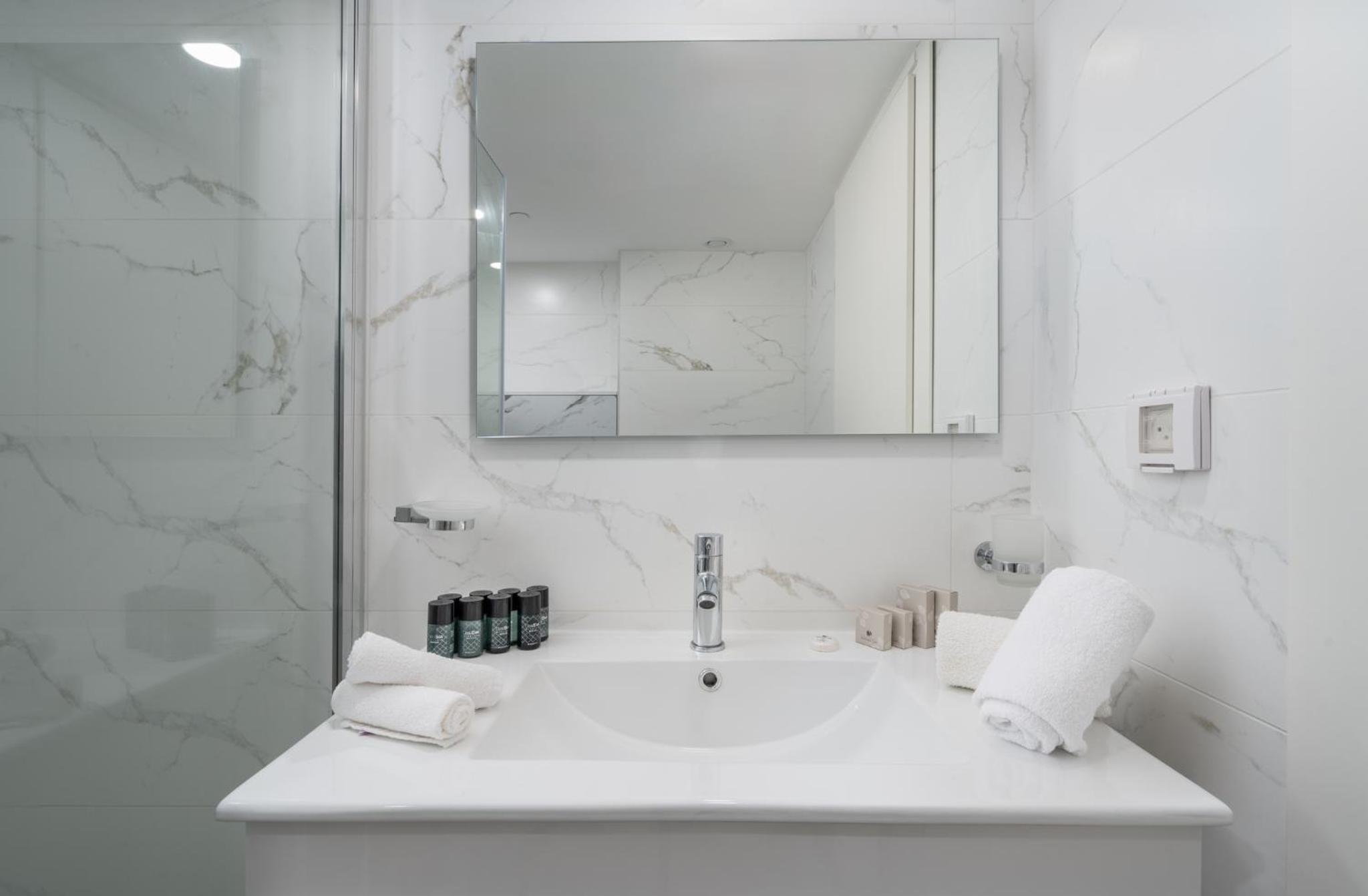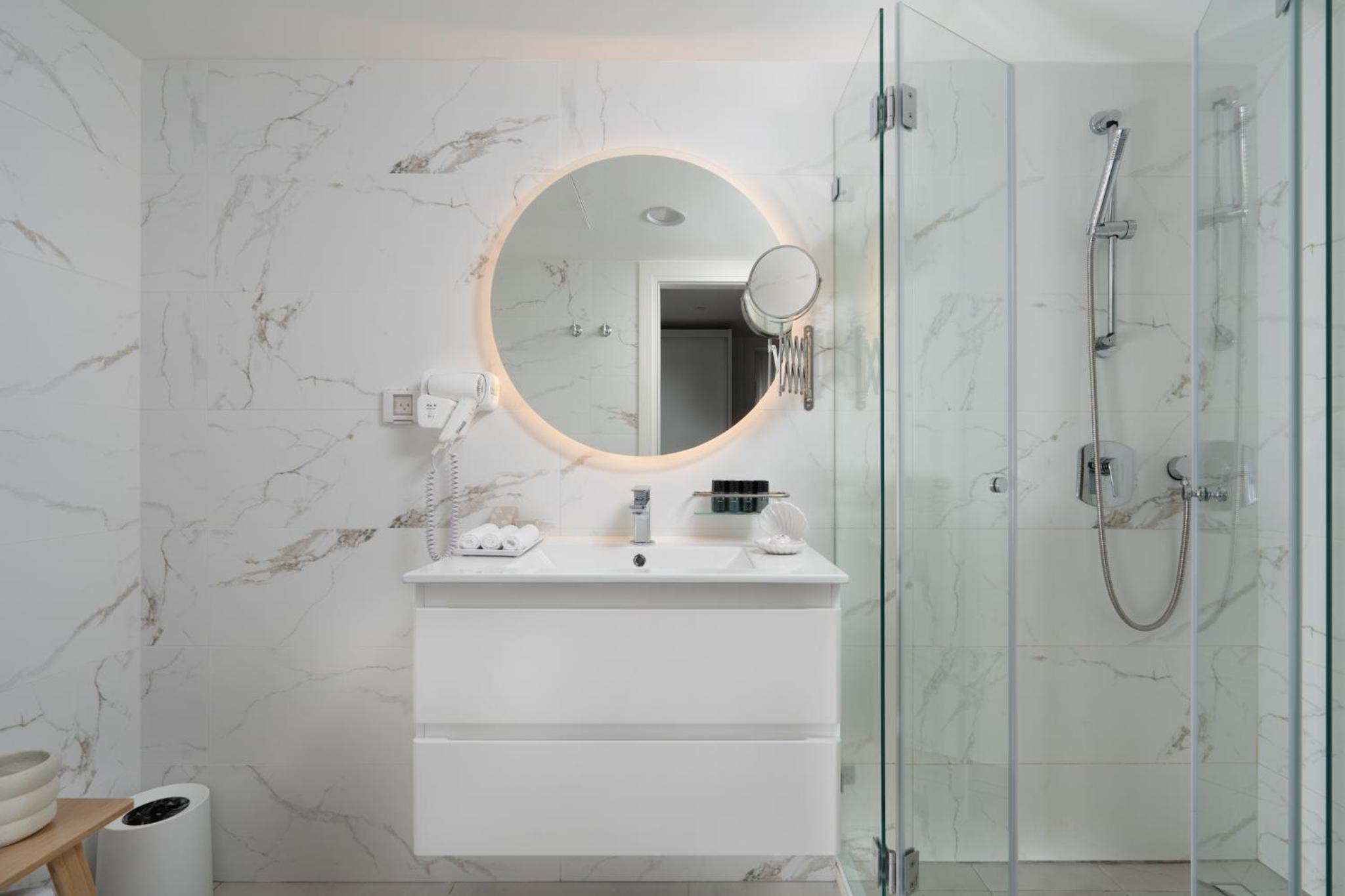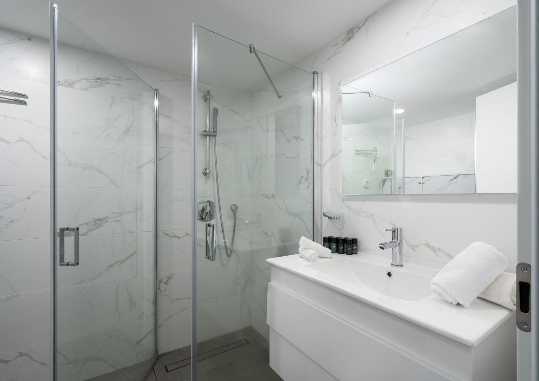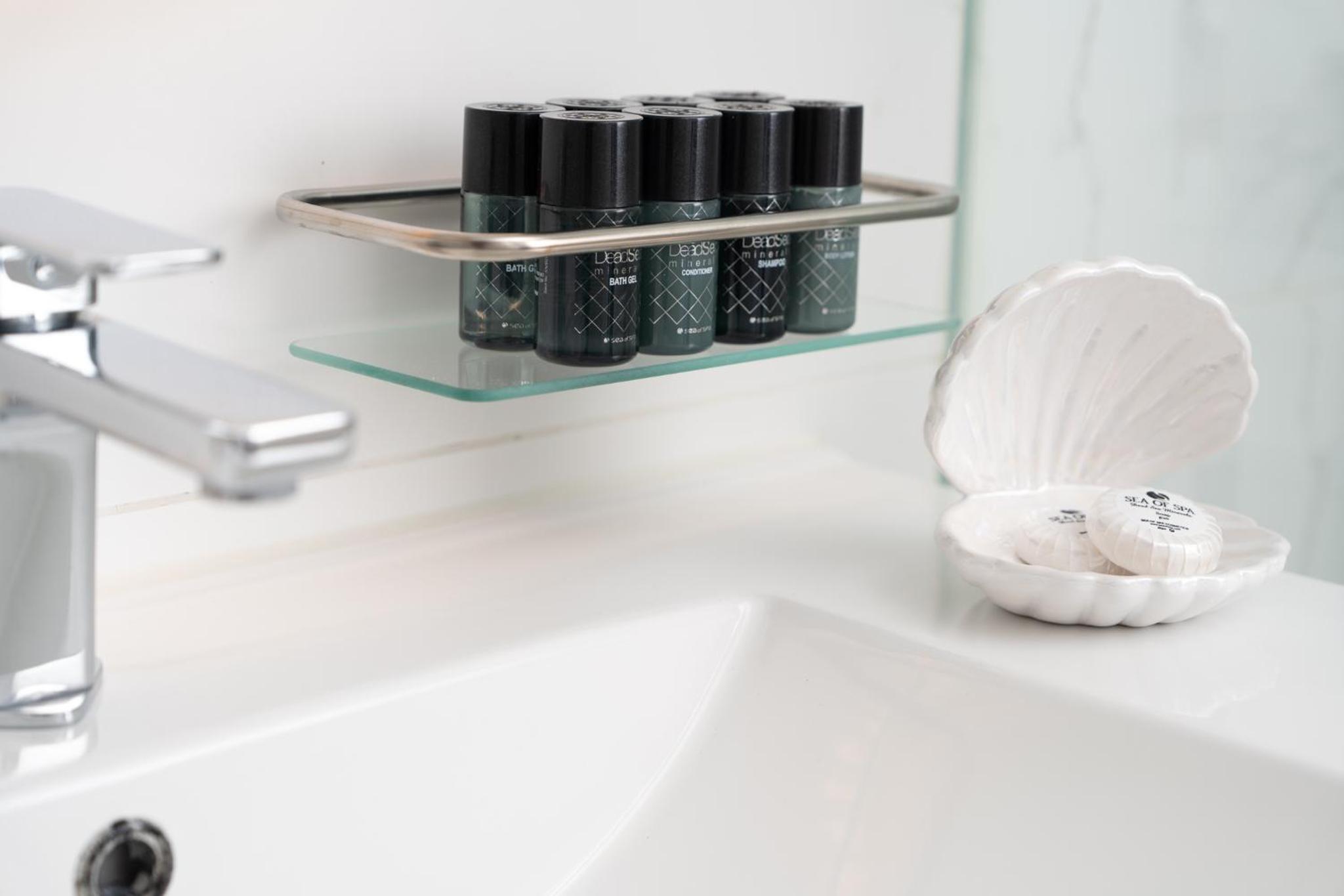 ראש המקלחת קטן, חבל אבל לא קריטי. חסרה בחדר מראת גוף.