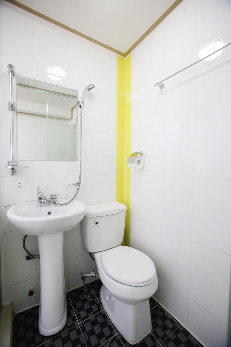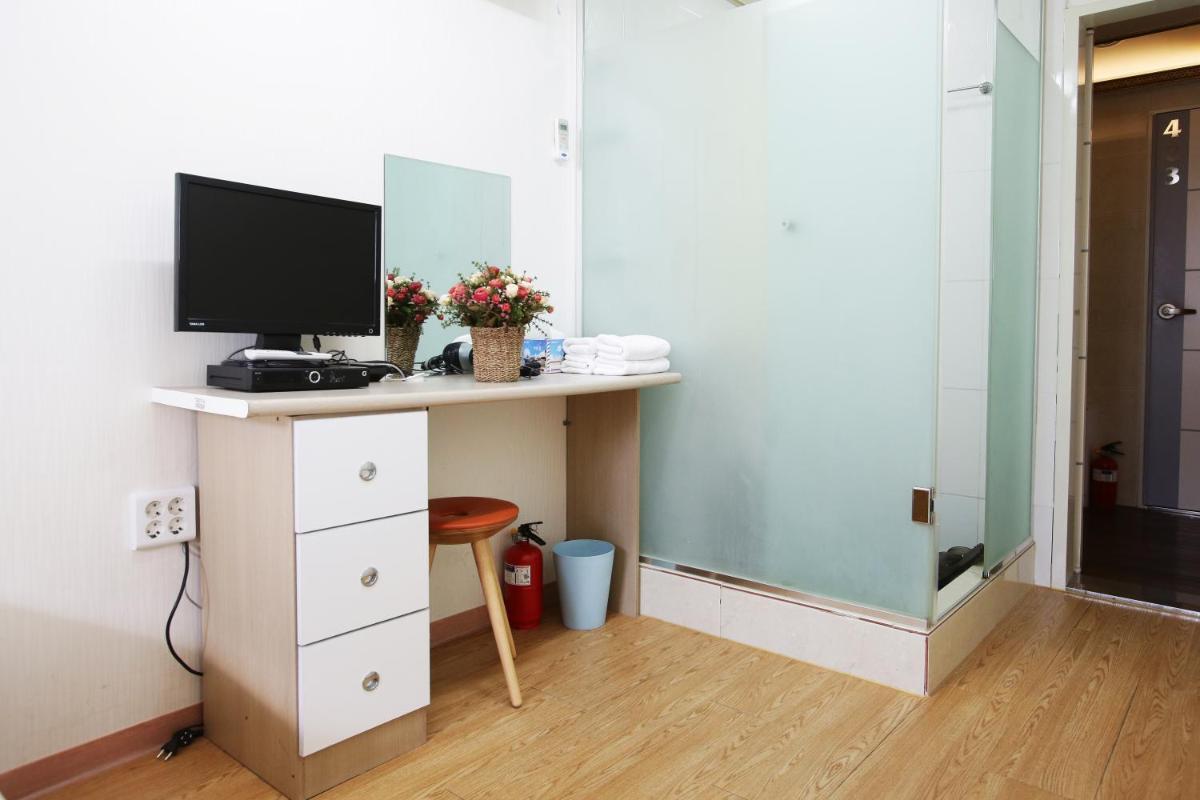 The only downside of the location is that the road is quite steep and uneven, which makes it difficult to carry luggage to the hotel. Check-in is at 3 p.m., and early check-in (1 p.m.) costs 20,000 won. The room itself is small, and there’s no mirror outside the bathroom—only a small one inside. When we moved the single beds together, we noticed mold on the wall. The bathroom is also tiny, with the shower head placed between the sink and toilet, so it’s easy to get your clothes, tissue and towels wet. The tiles have dark spots and don’t look very clean. For 6 night stay they didn't change our sheets, comforter and pillowcases.