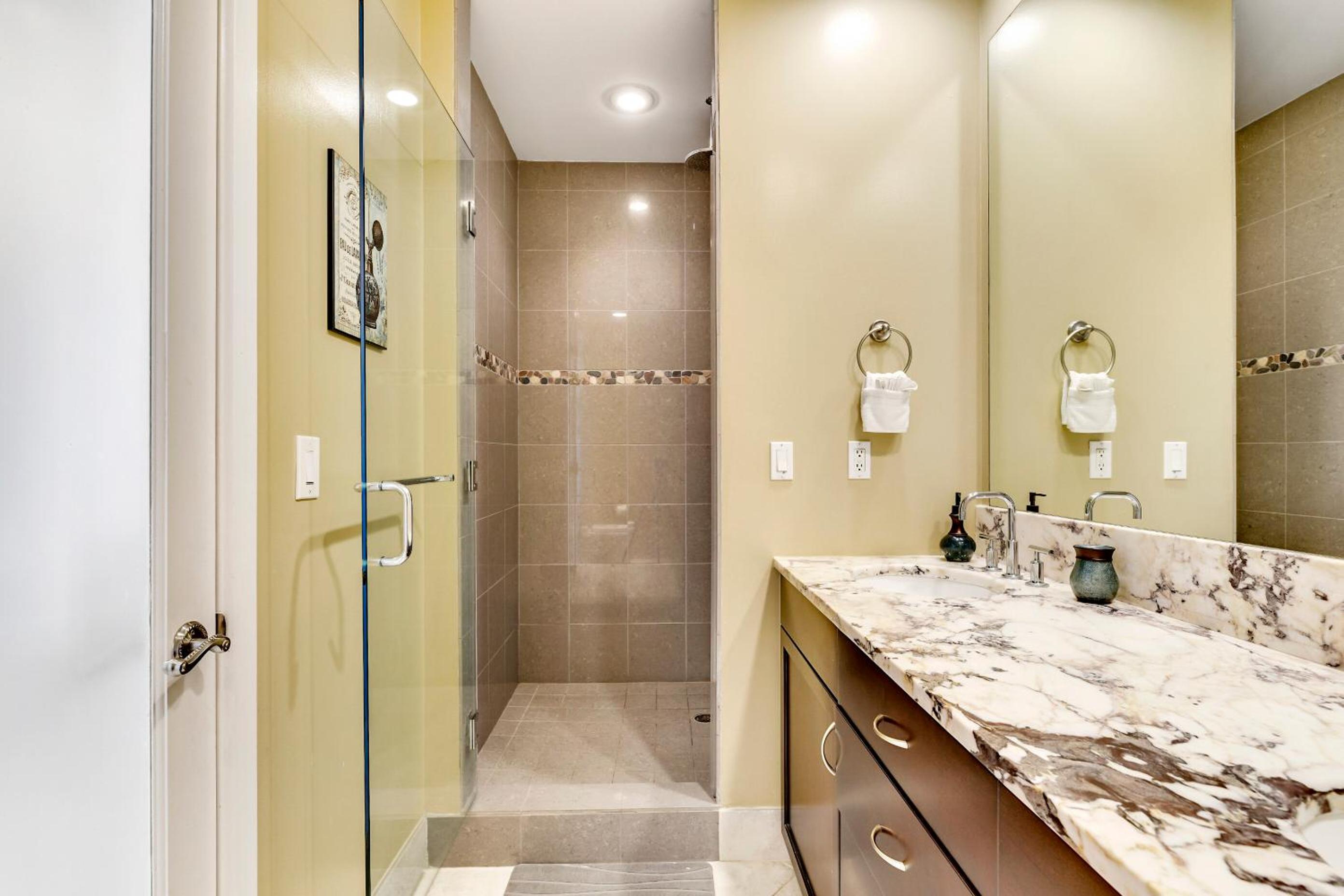 The shower was great but a tad too slippery for an elderly family member. I placed a towel on the floor to prevent a fall. Having a shower chair available was wonderful & very appreciated.