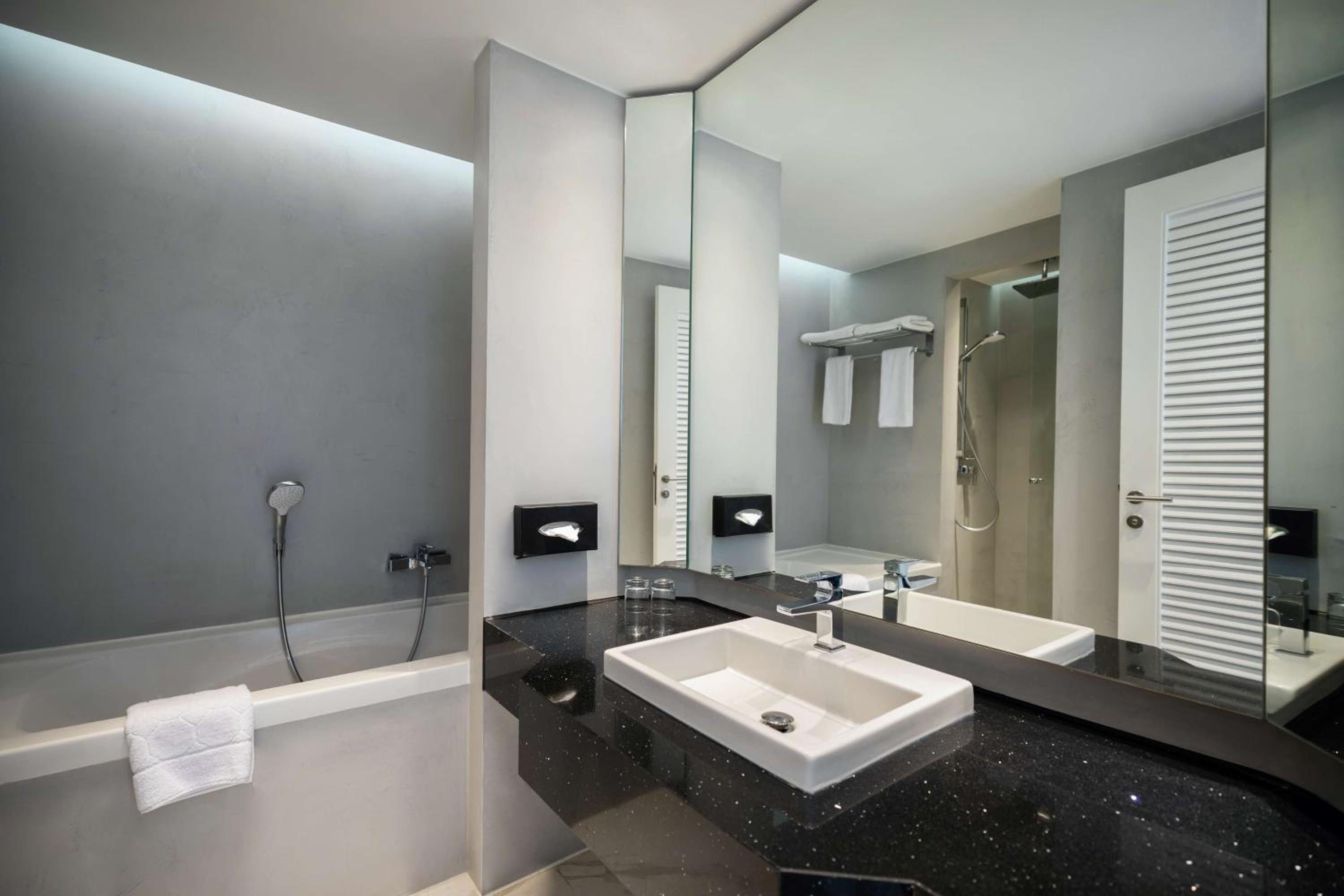 Hôtel soi-disant 5 étoiles, mais prestations dignes d’un 2 étoiles : poubelle rouillée, prises arrachées, baignoire tachée, gel douche déjà entamé, peignoir usé.