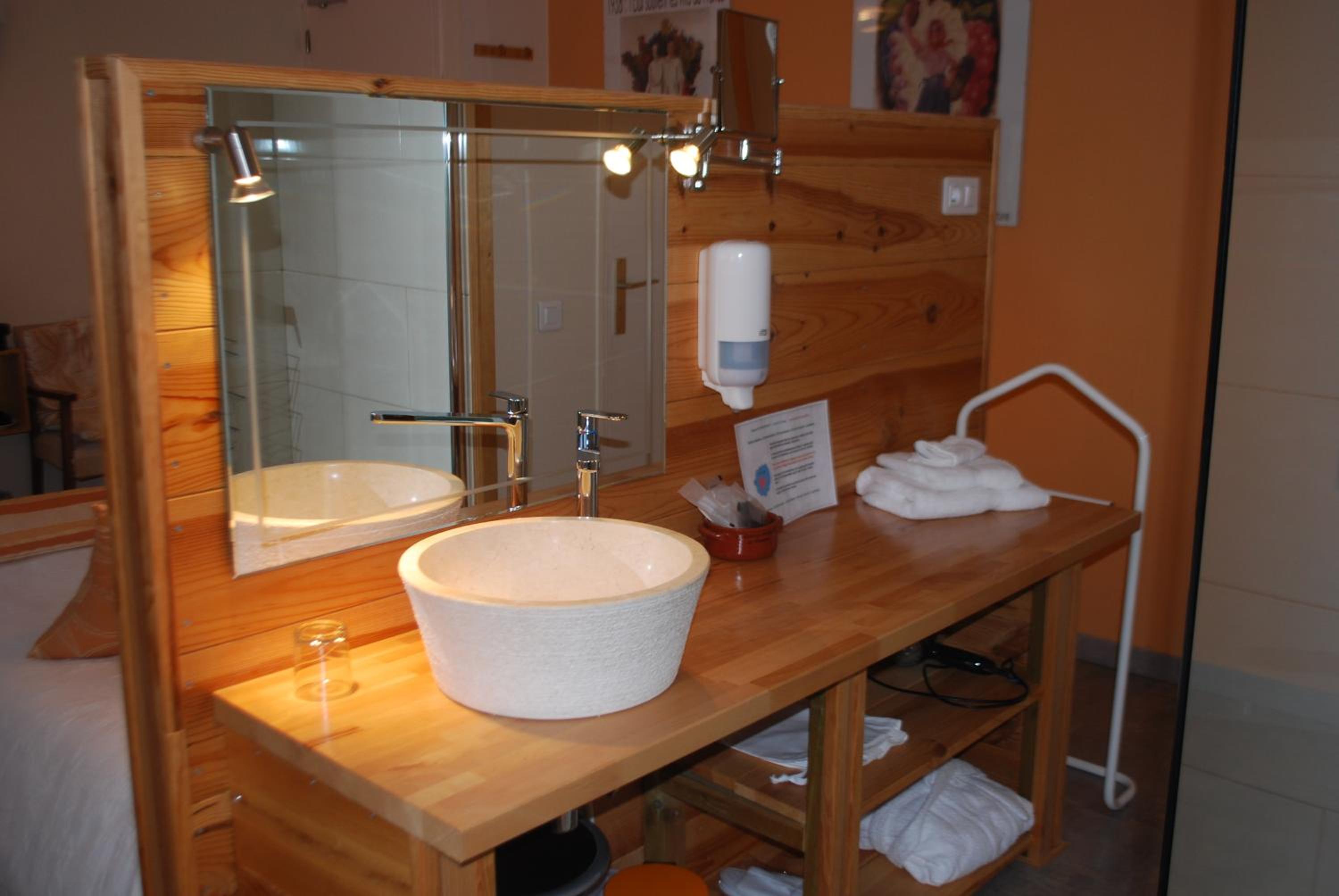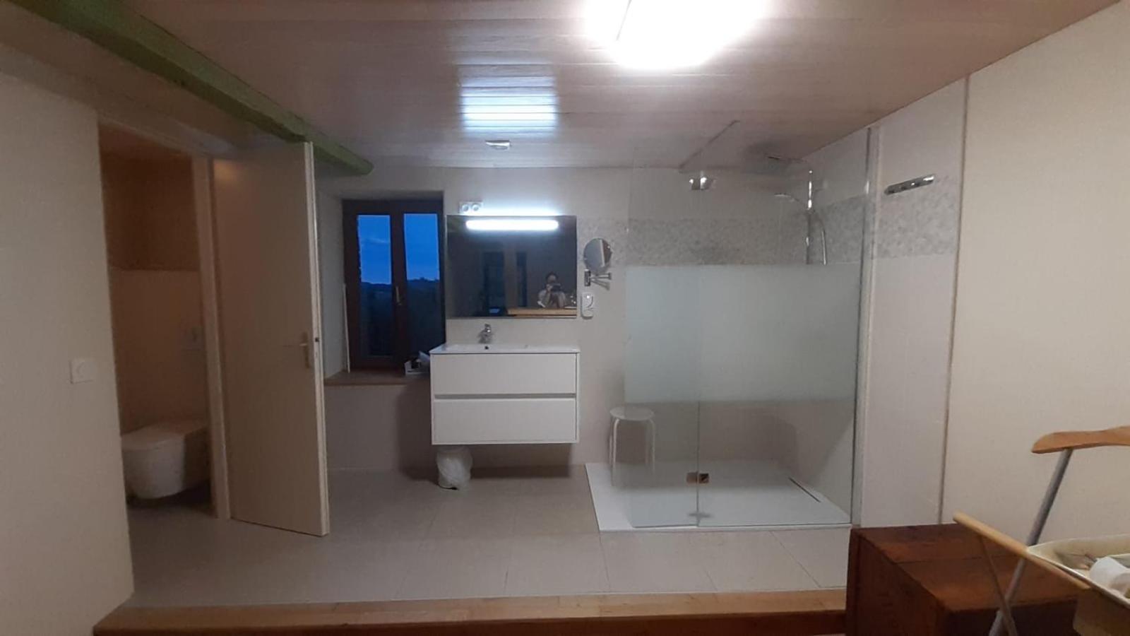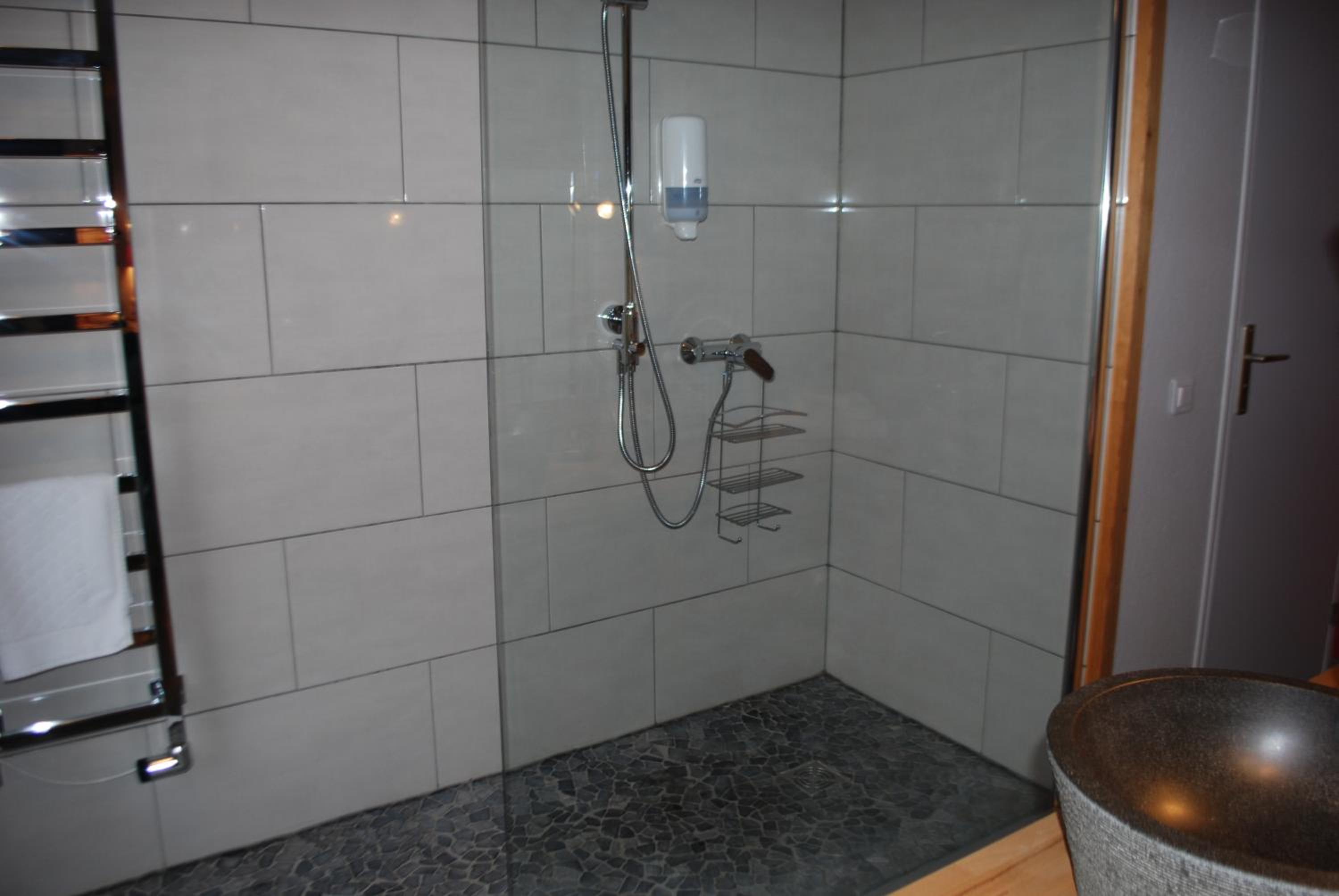Vraiment dommage que la douche soit dans la chambre et qu'une ventilation bruyante s'enclenche dans les WC. L'absence de table de nuit n'est pas pratique.