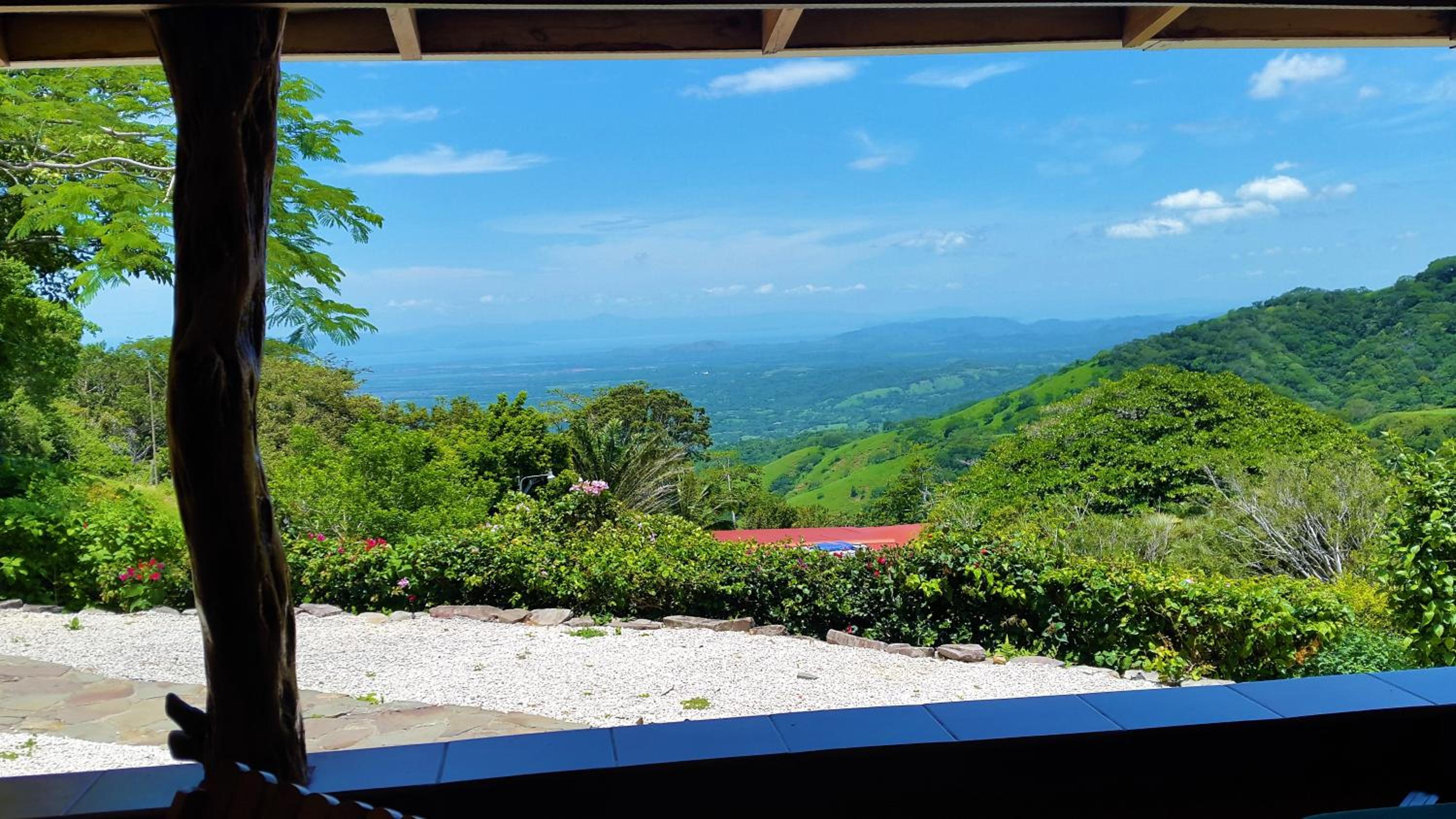 Le décors au bord de la terrasse, vue sur les collines jusqu'a la mer.