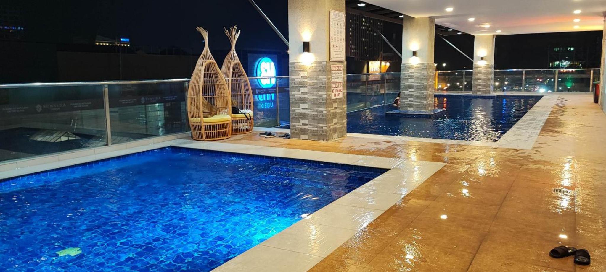 Enjoy a refreshing dip in the indoor pool overlooking the city skyline at NEW! AFFORDABLE PLACE TO STAY ACROSS SM CITY CEBU! Stay active during your vacation with access to the fitness room, perfect for a quick workout session.