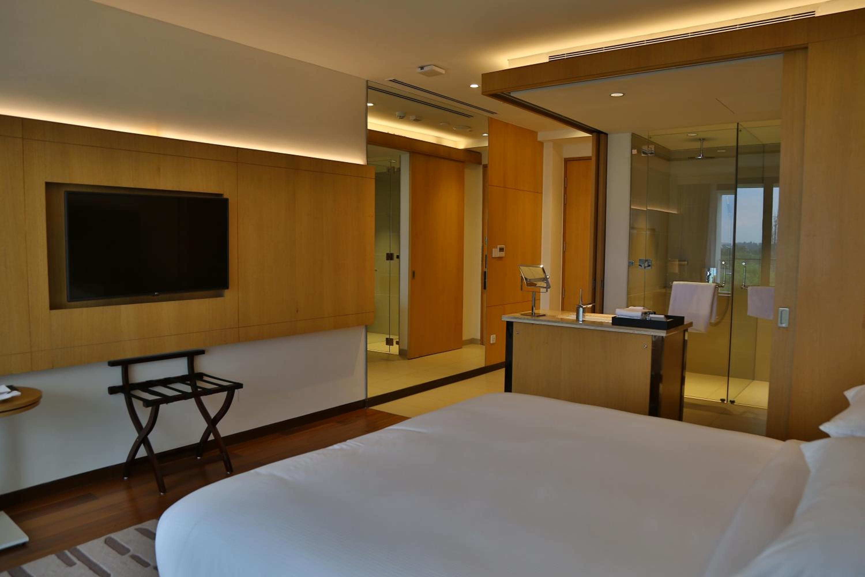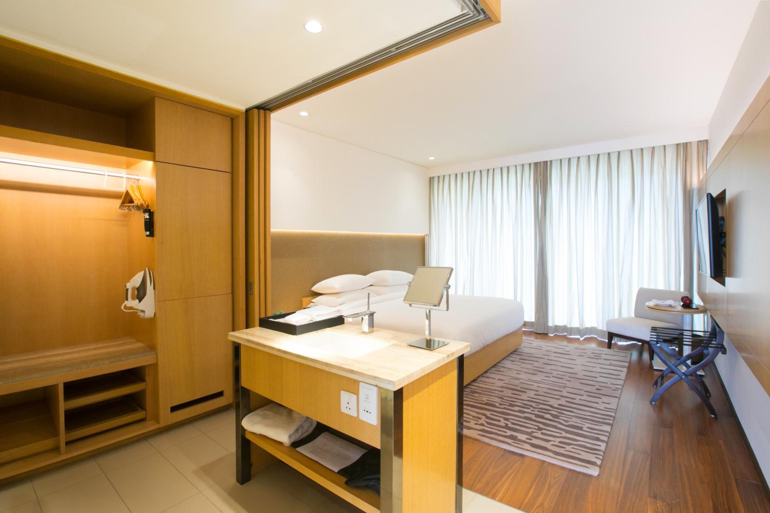 La camera non è tanto adatta per chi viaggia per lavoro in quanto in non c'è una scrivania, la camera e il bagno è uno spazio unico che può essere separato con delle porte scorrevoli, lavandino è su un mobile quasi vicino al letto, con un specchietto, scomodissimo per fare la barba..
