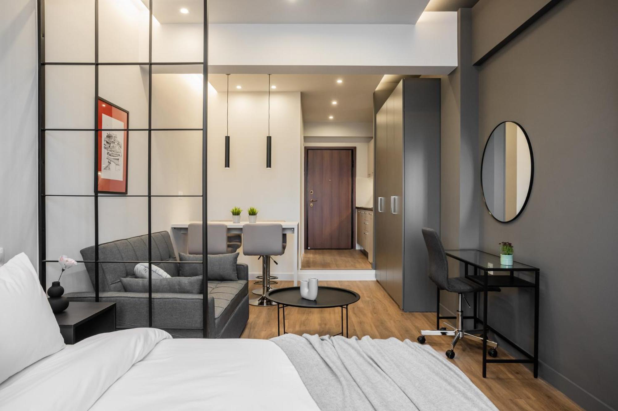 Near port. Bakery and supermarket close by. Modern interior suitable for couple. But not more as sofa bed not functional.