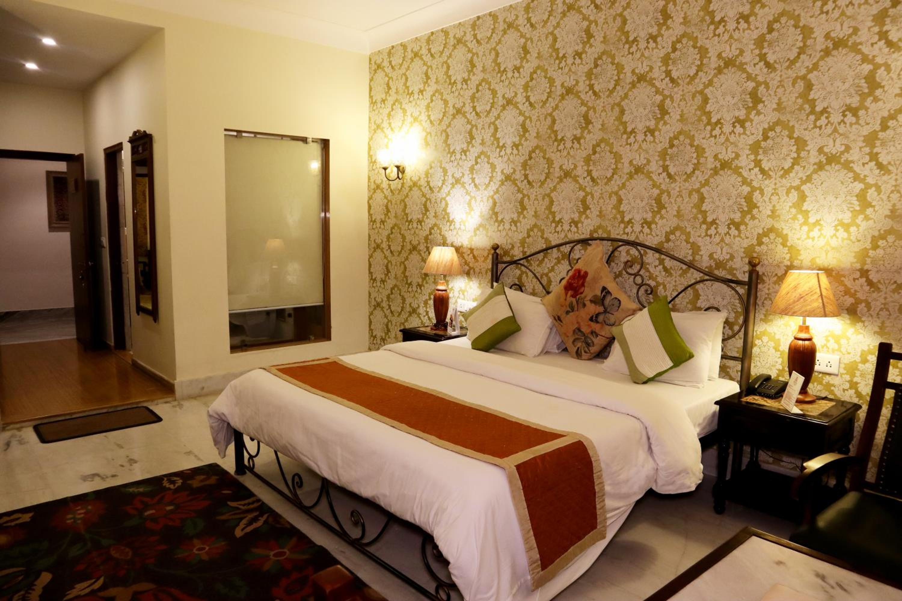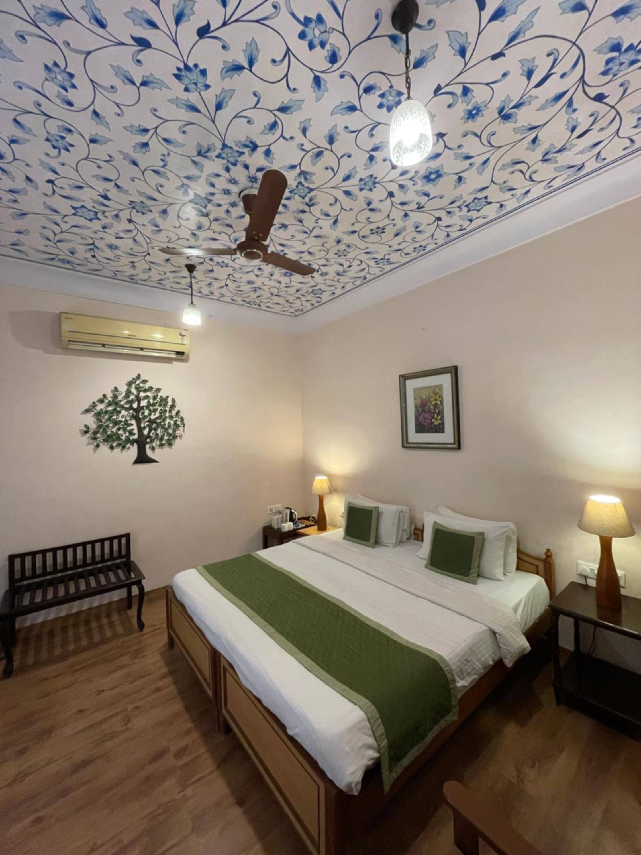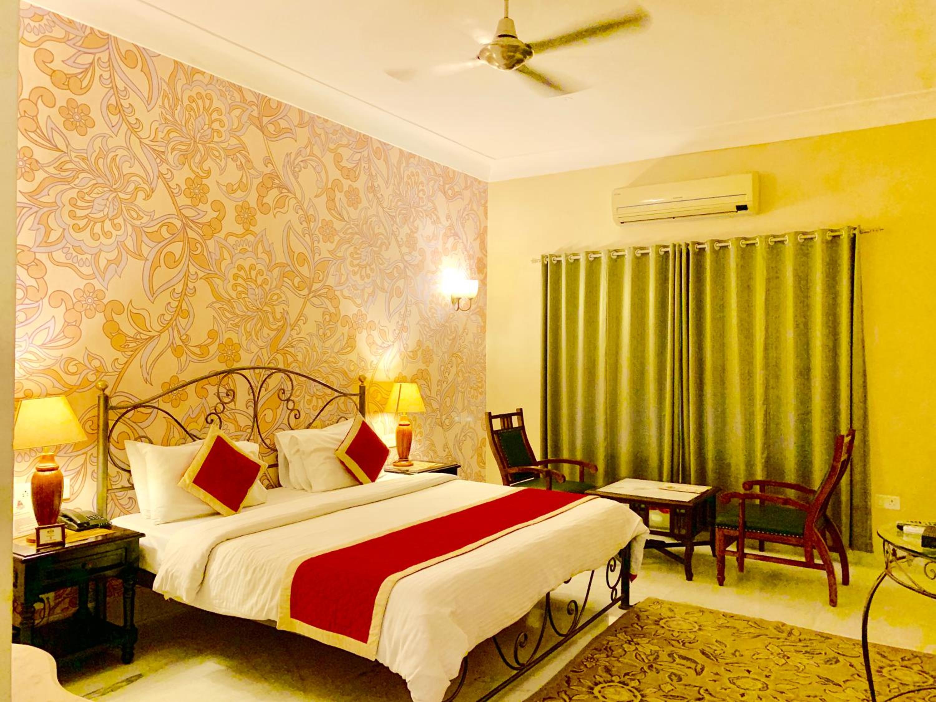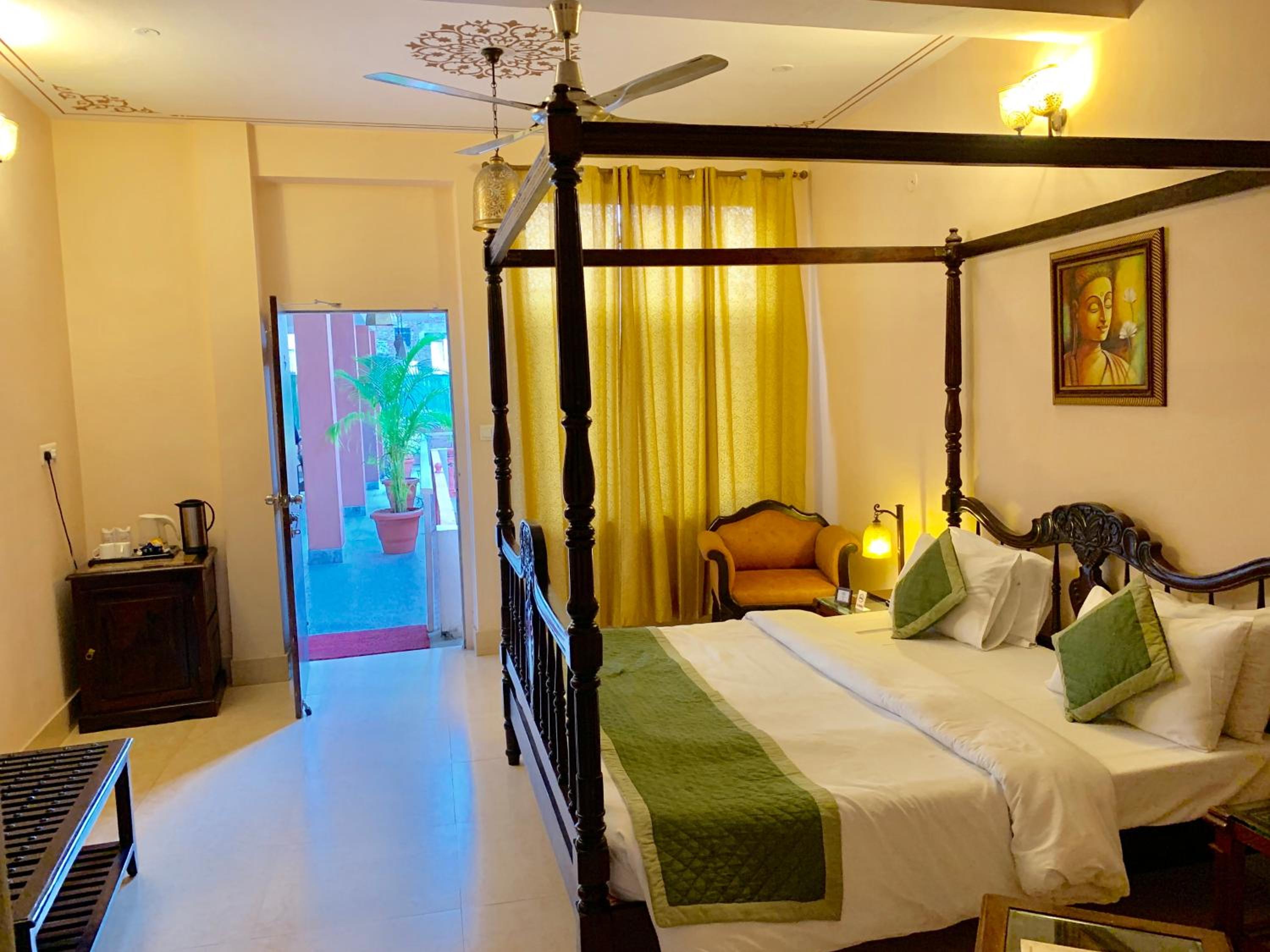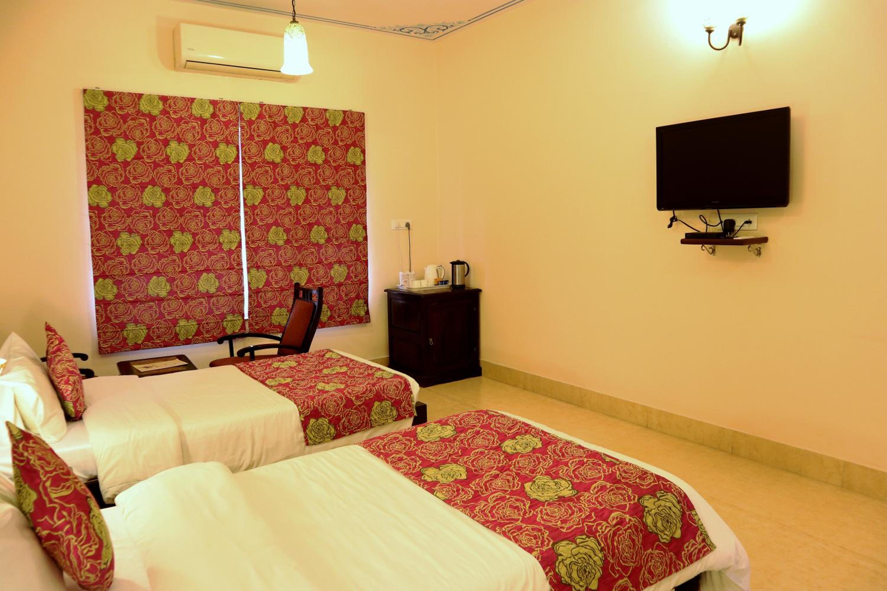 Suryaa Villa in Jaipur offers a blend of traditional wooden furnishings with modern amenities in its air-conditioned rooms. Each room is equipped with a seating area, flat-screen TV, and a minibar, ensuring a comfortable stay. The private bathrooms feature hot showers for relaxation after a day of exploring.