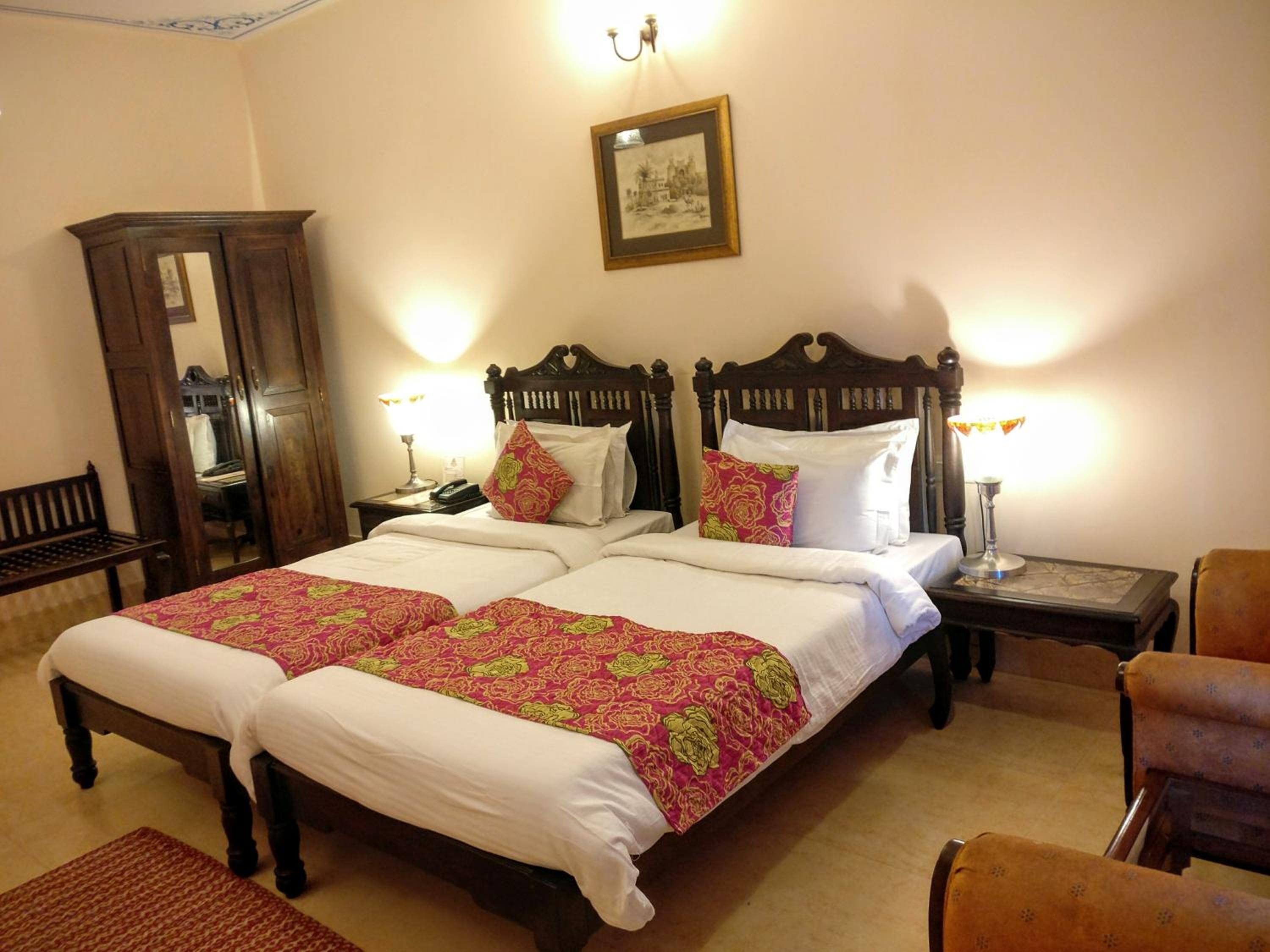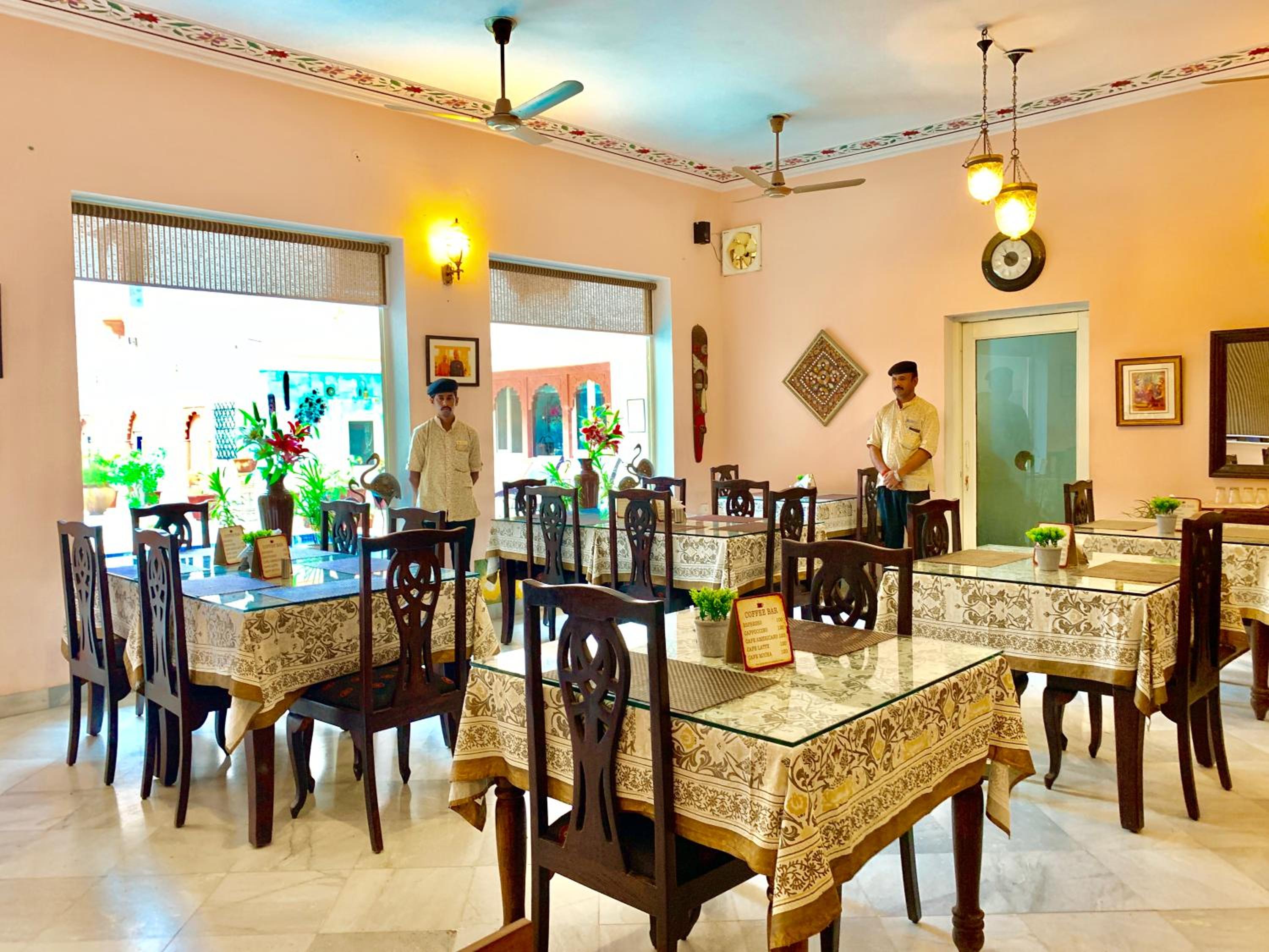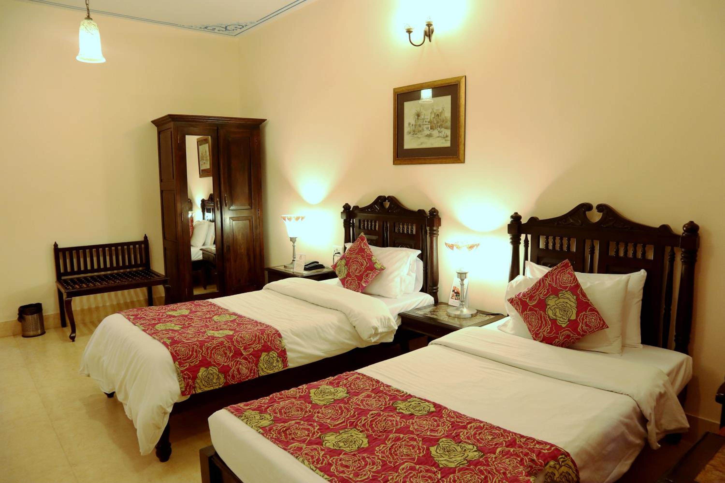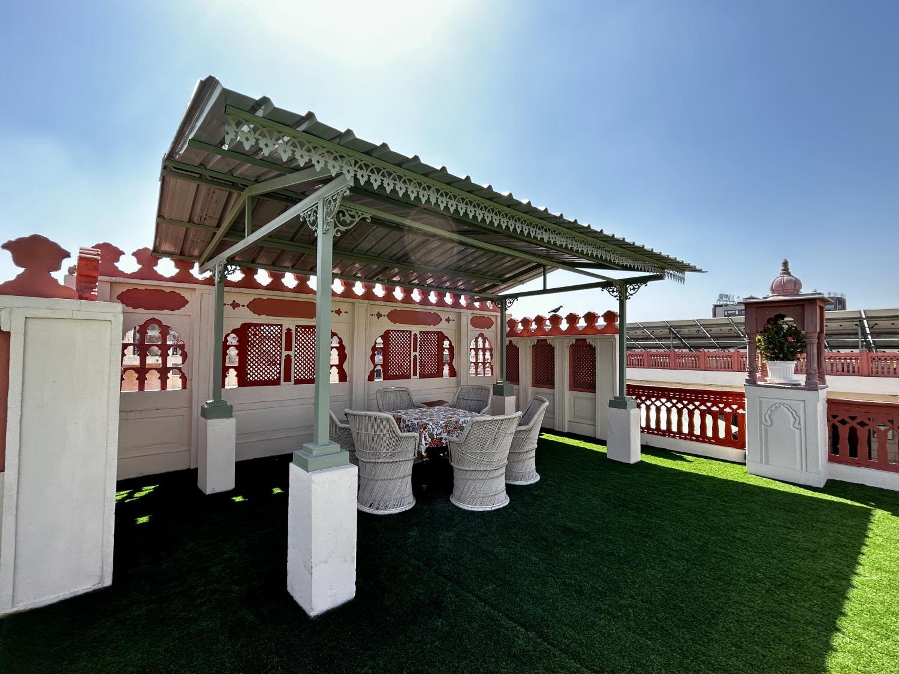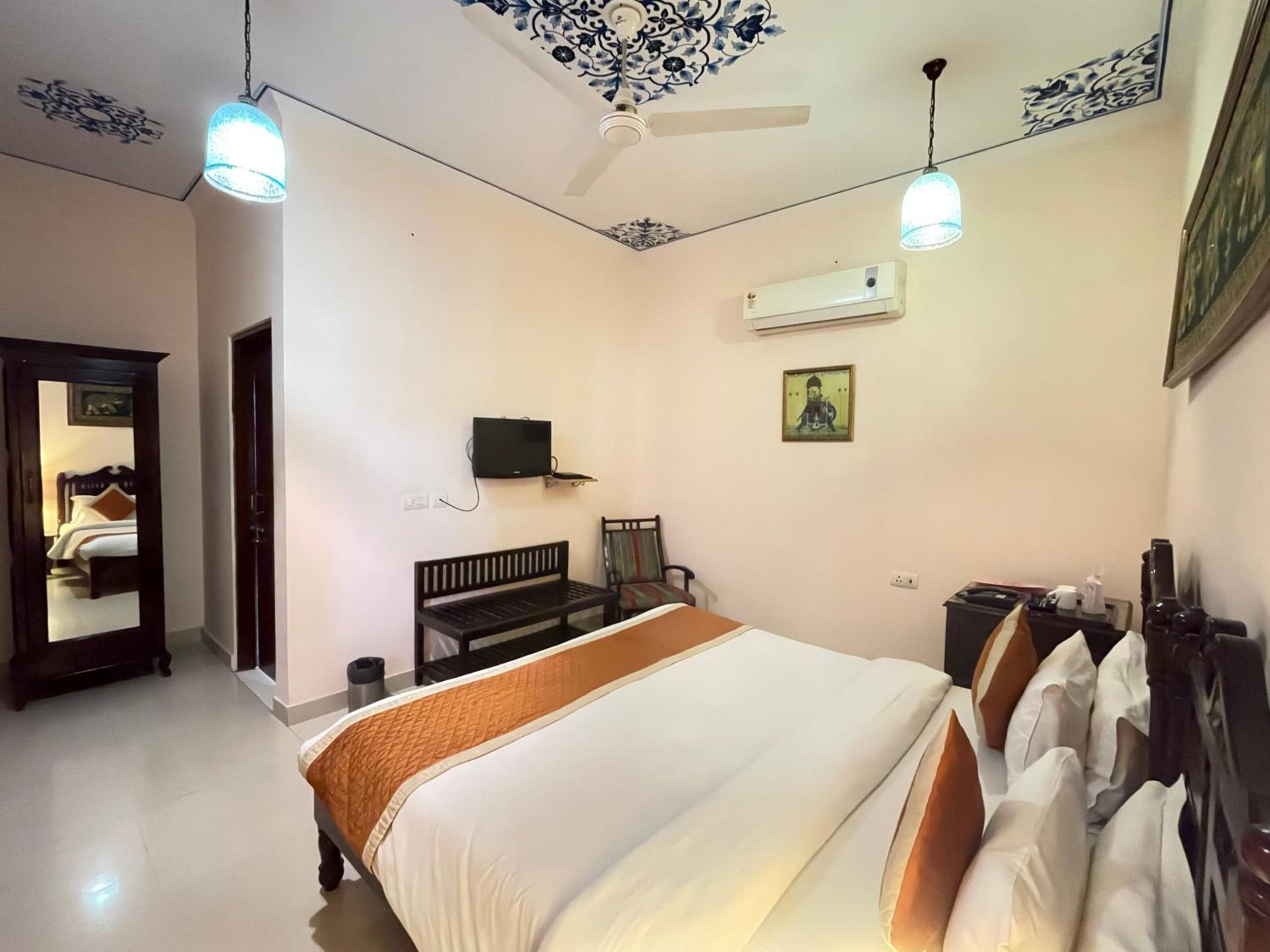 Suryaa Villa in Jaipur offers a blend of traditional wooden furnishings with modern amenities in its air-conditioned rooms. Each room is equipped with a seating area, flat-screen TV, and a minibar, ensuring a comfortable stay. The private bathrooms feature hot showers for relaxation after a day of exploring.