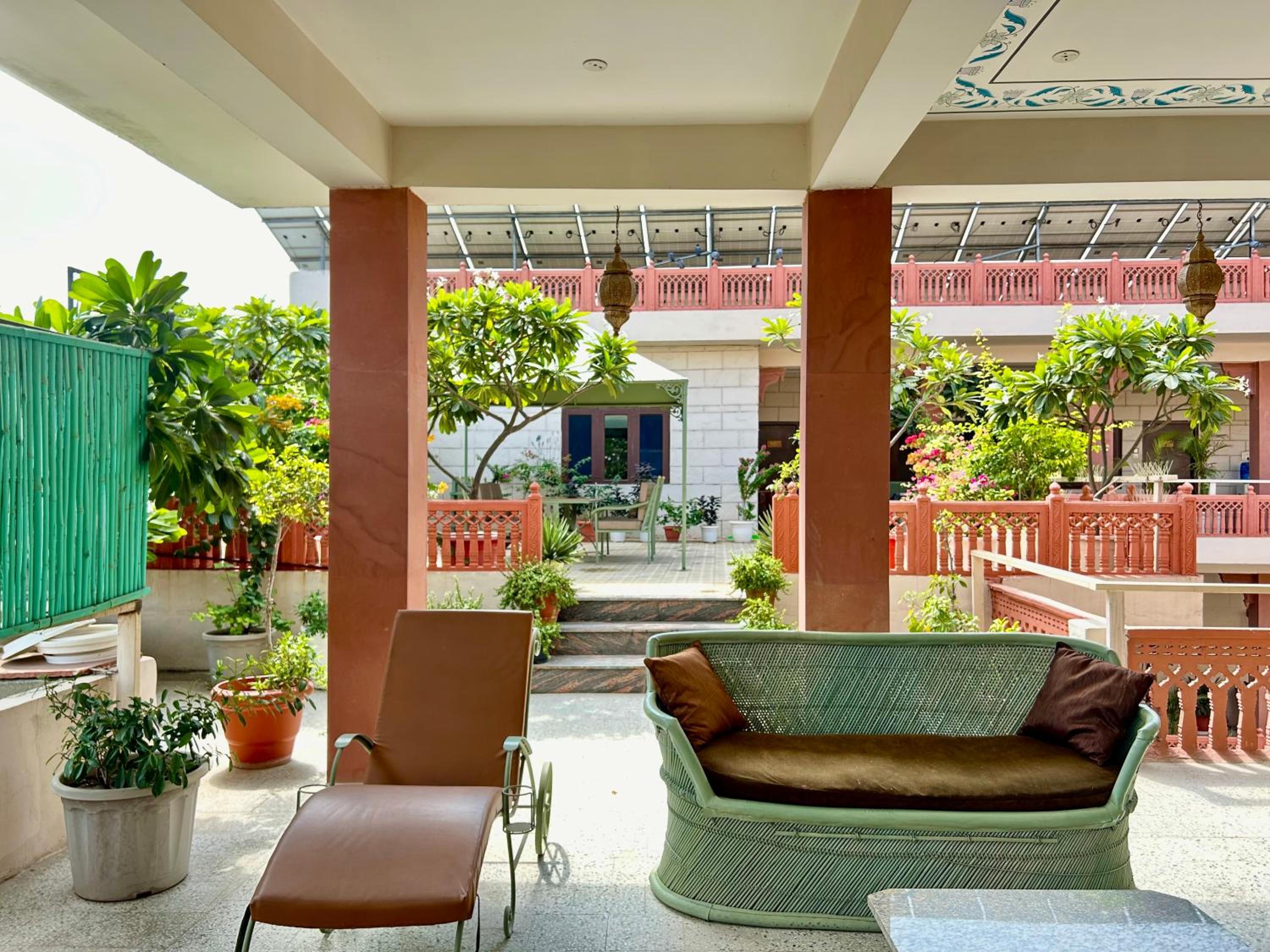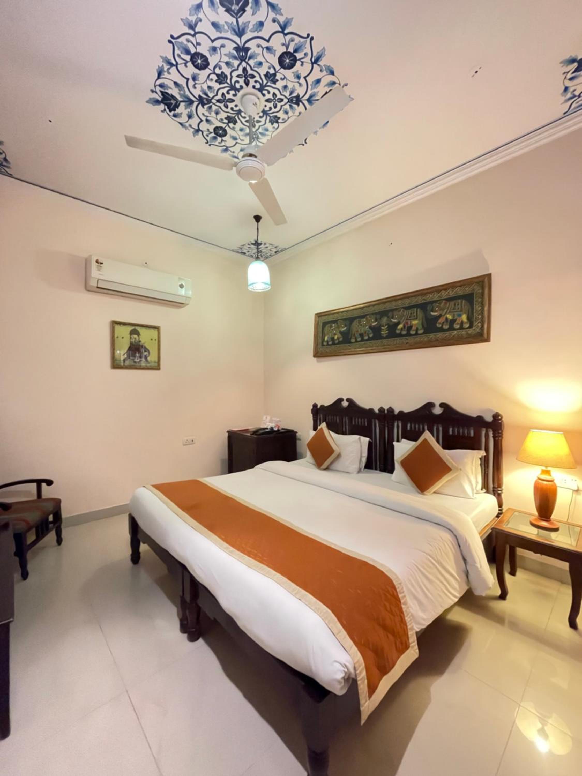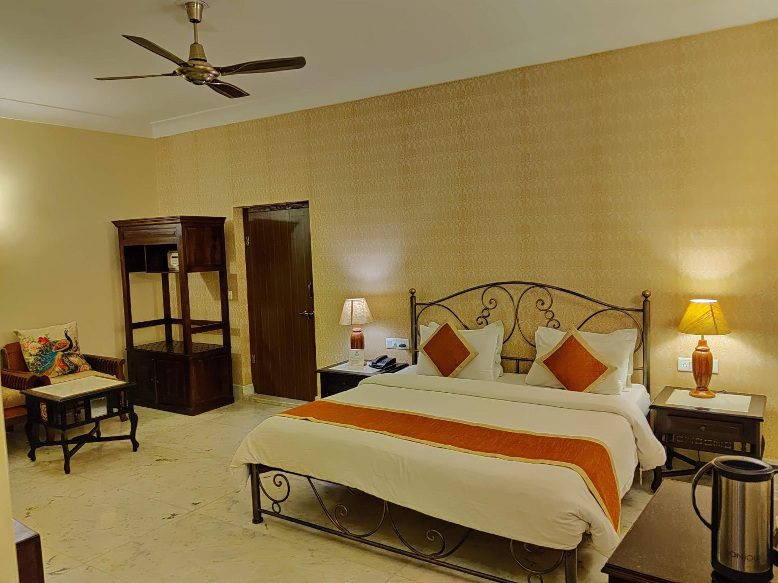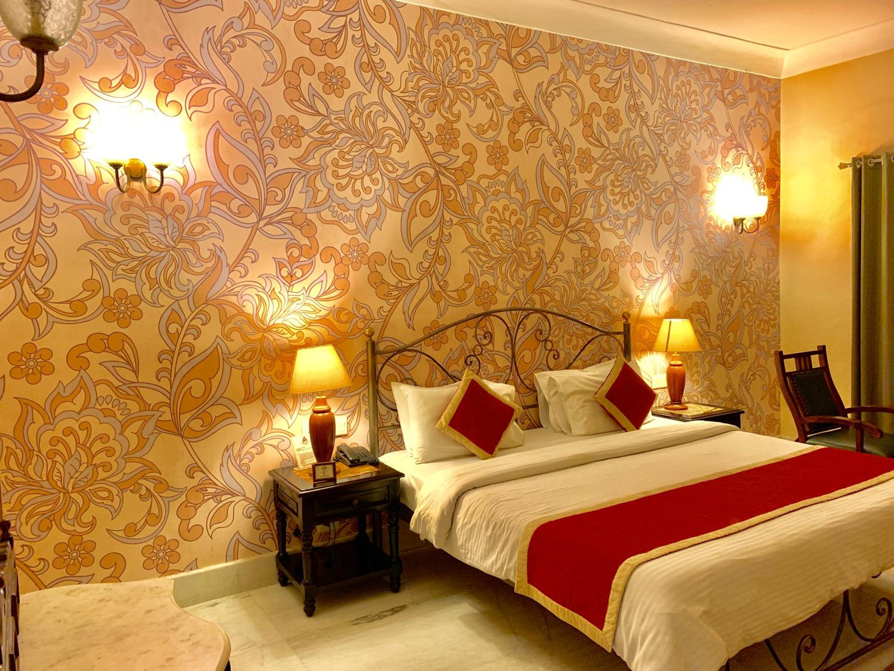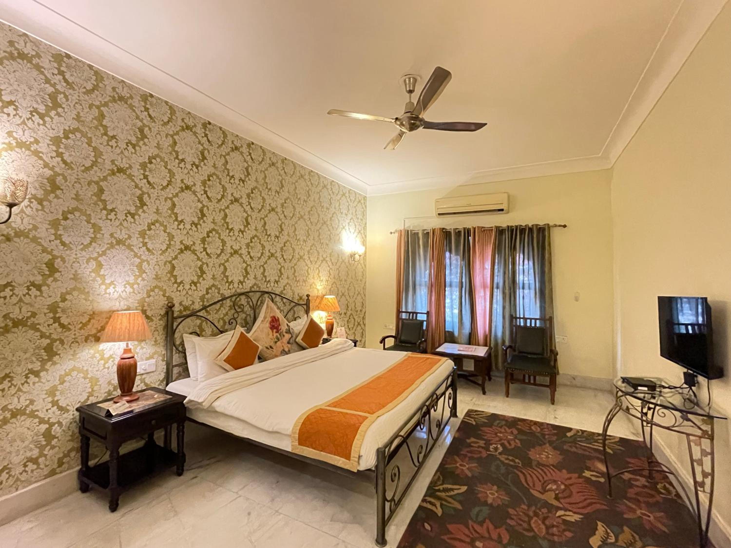 Suryaa Villa in Jaipur offers a blend of traditional wooden furnishings with modern amenities in its air-conditioned rooms. Each room is equipped with a seating area, flat-screen TV, and a minibar, ensuring a comfortable stay. The private bathrooms feature hot showers for relaxation after a day of exploring.