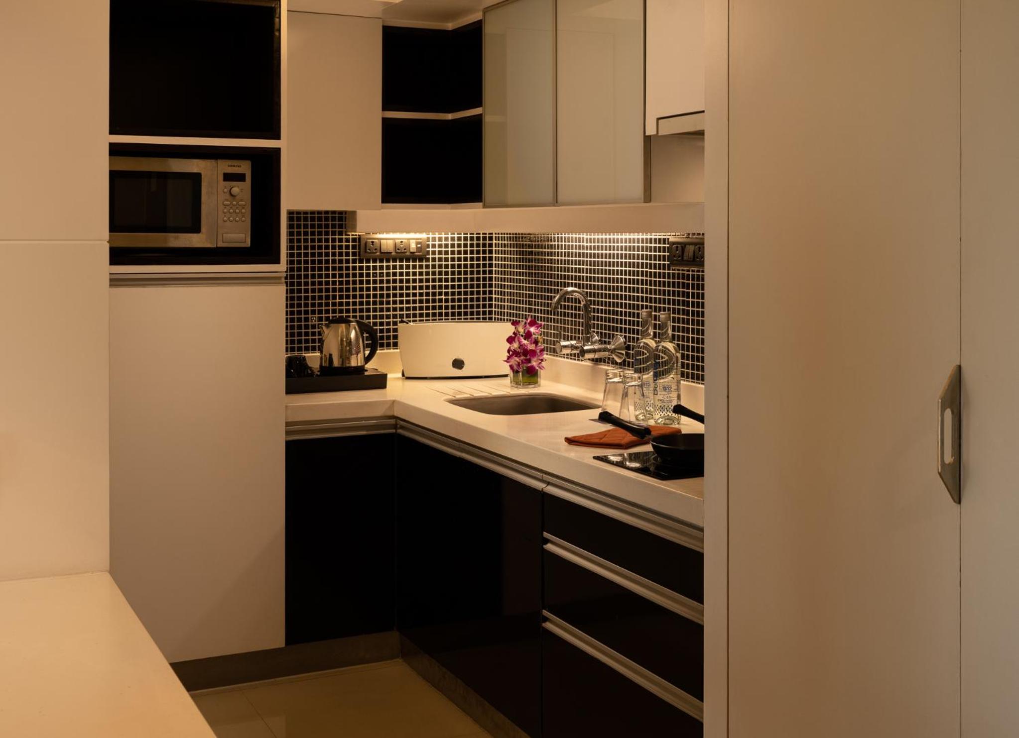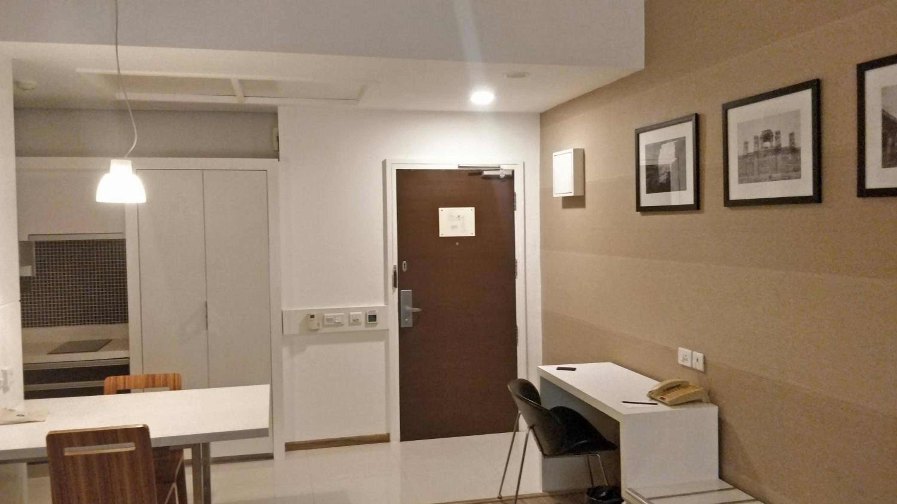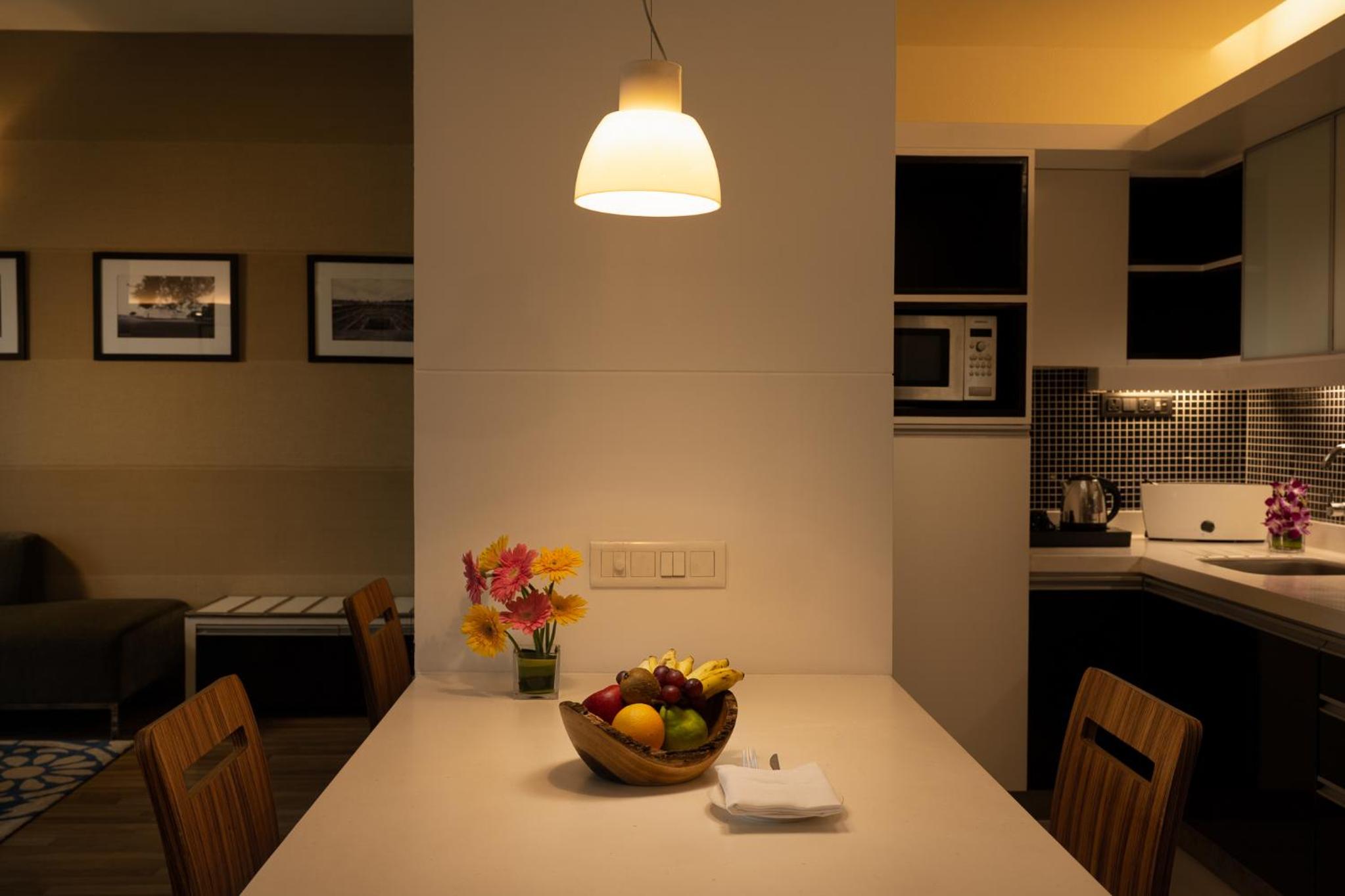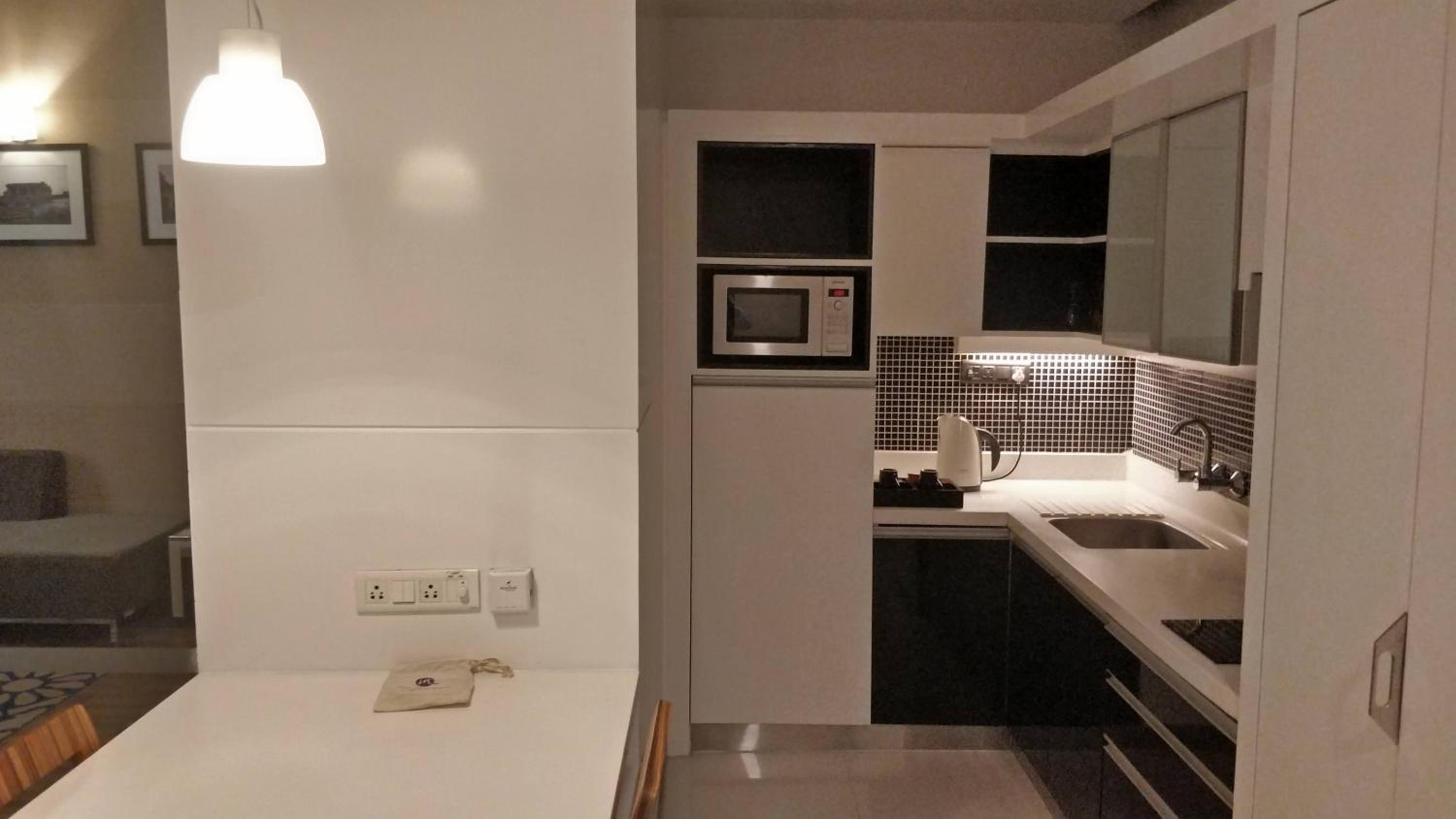 Really good location, away from chatter and noise, yet not far from shops and restaurants. Our suite was spacious. The bathroom had a nice shower stall. The kitchen section included a fridge, a cooktop, a microwave and a water purifier. Very convenient.