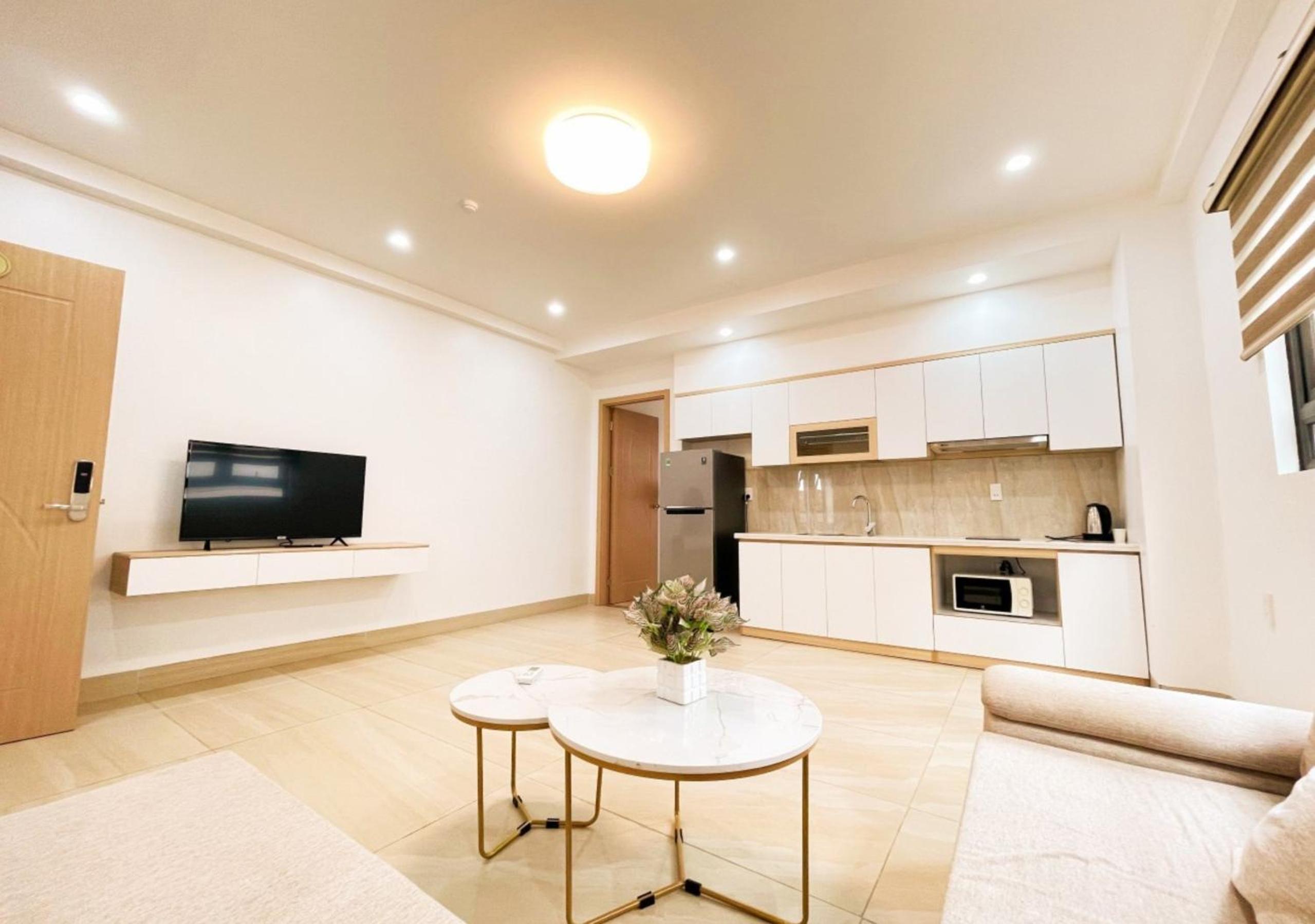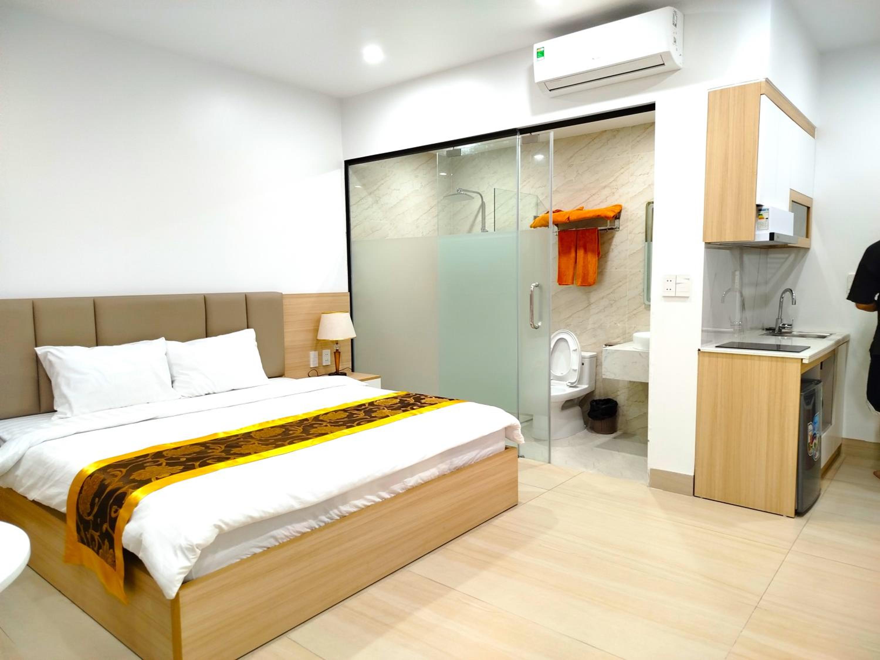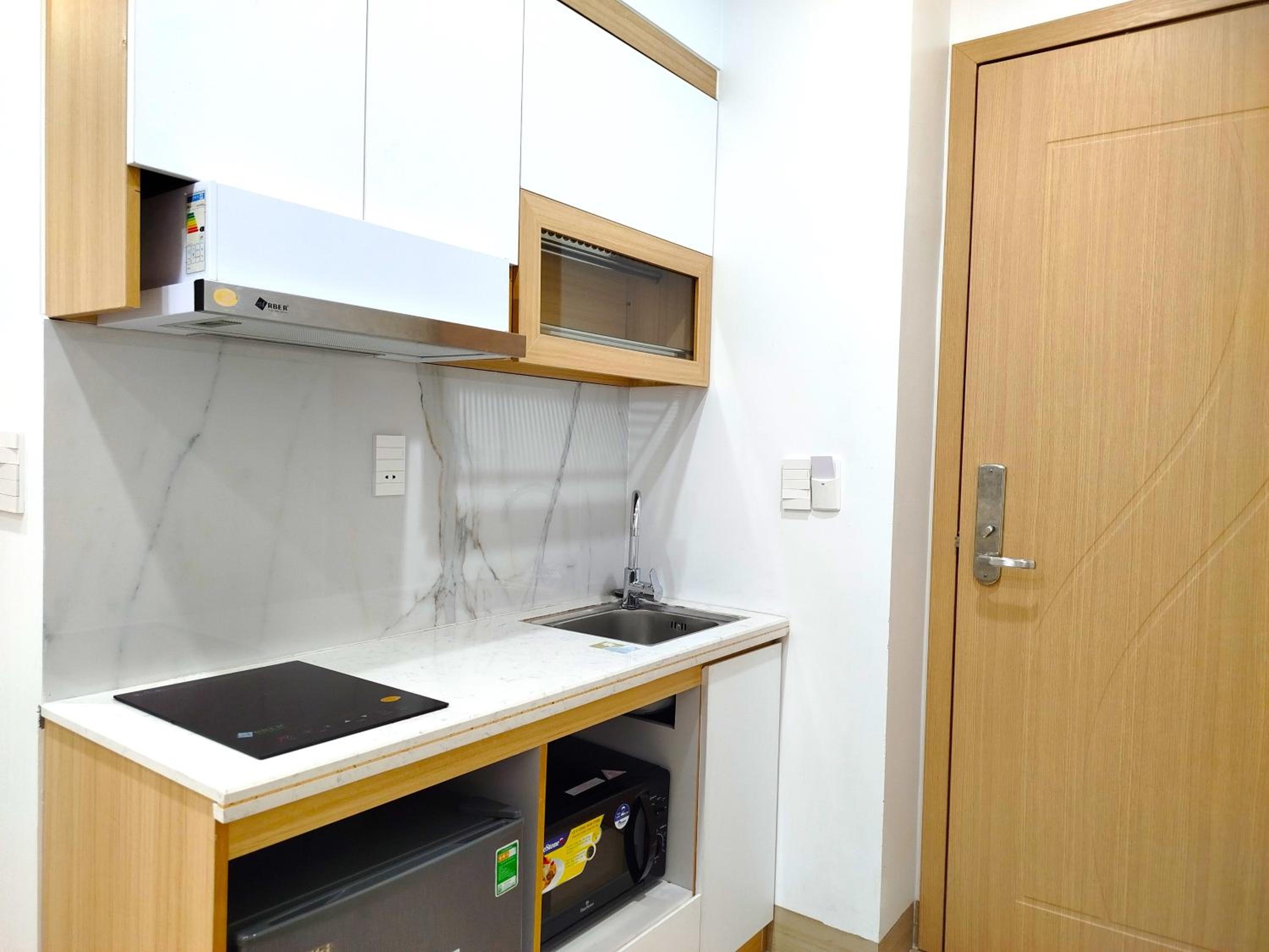 Modern Rooms with Kitchenette: Enjoy comfortable and convenient stays in our air-conditioned rooms equipped with a flat-screen TV and kitchenette for your convenience.