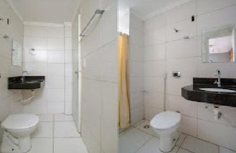 Banheiro sem box para que a agua nao molhasse o banheiro inteiro, isso e ruim porque o risco de uma queda e muito grande, idosos devem ter bastante dificuldade!