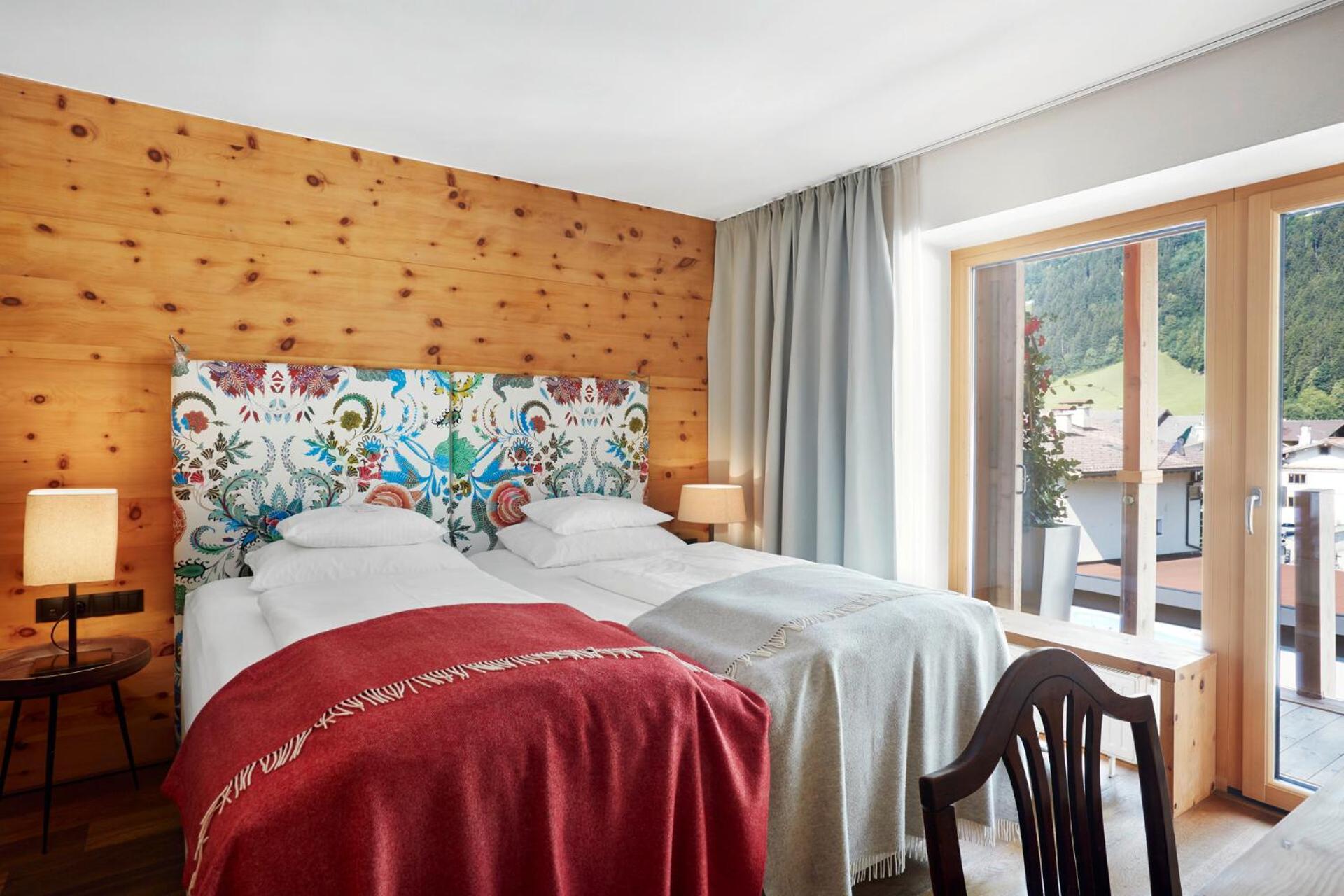 Each room at Das Posthotel Design & Tirol features pastel colors, natural wood, a balcony, and a stylish bathroom with premium toiletries. The blend of modern furniture and traditional style creates a serene atmosphere.