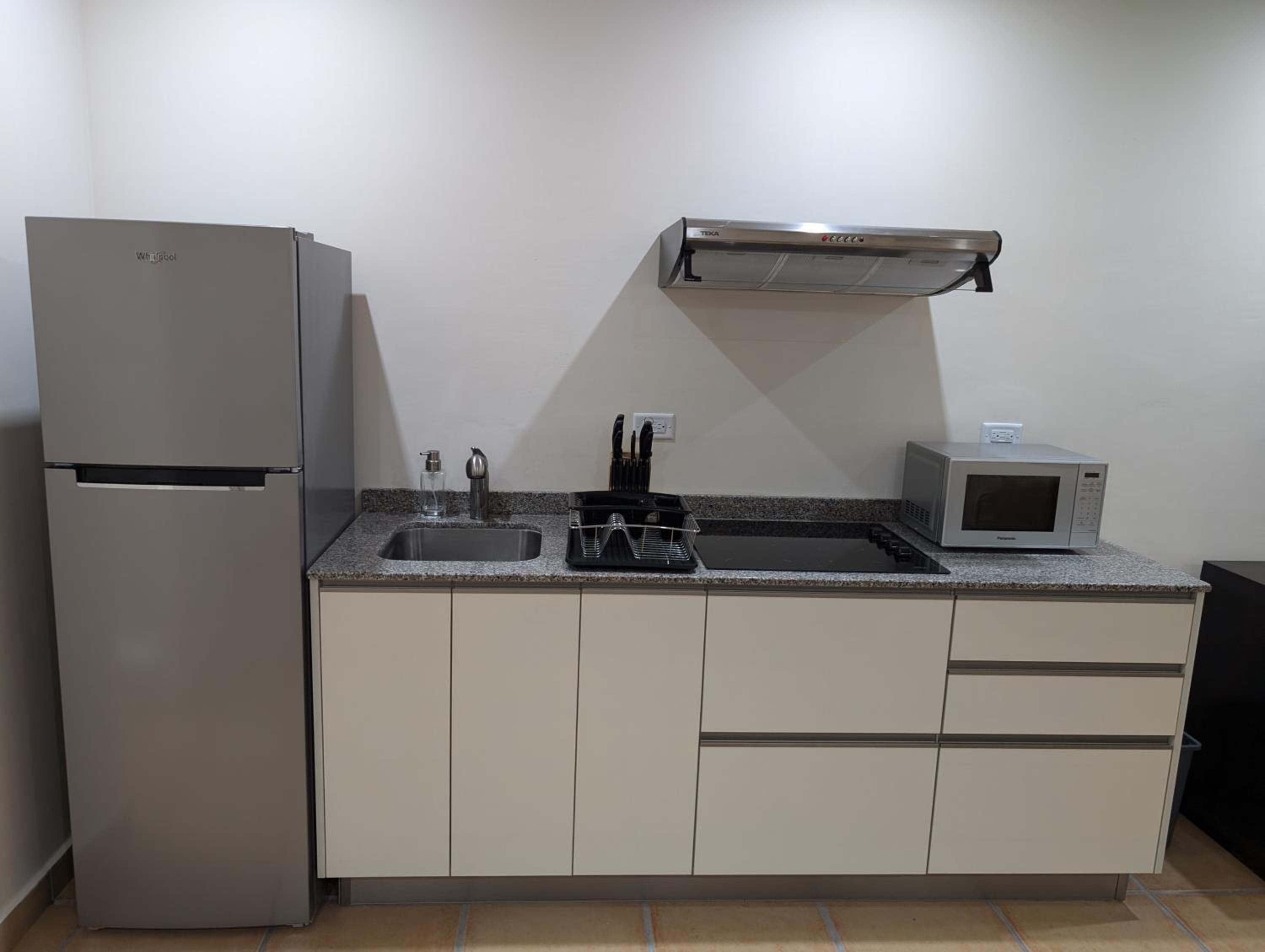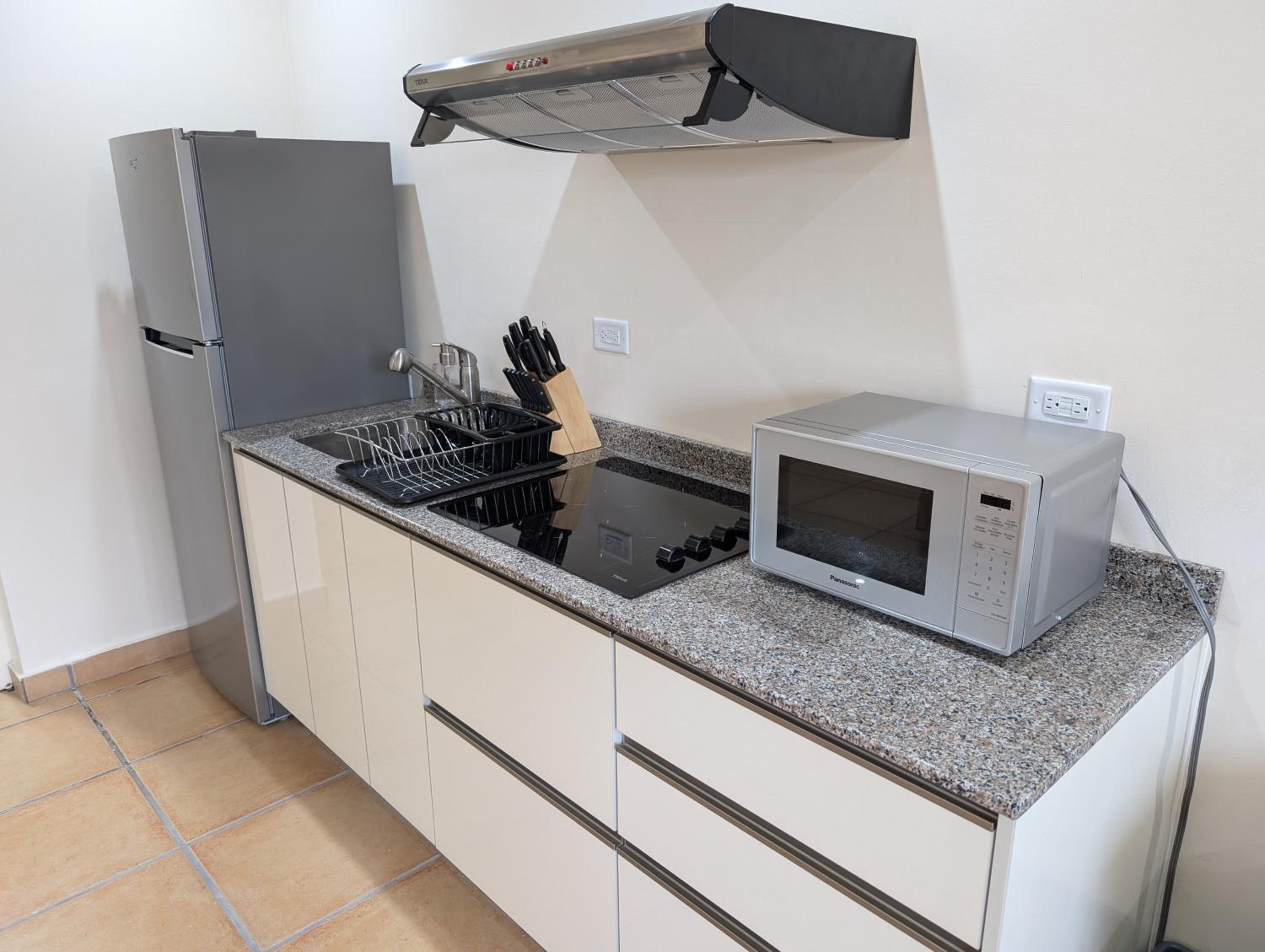 Our unit had a very nice refrigerator & a little microwave, BUT there were no plates or silverware! Therefore, if we wanted to eat leftover food or even a papaya or other fruit, there was no way to even eat it or cut it or put it on a plate. I don't understand why there was an apt sized refrigerator that we couldn't use for food.